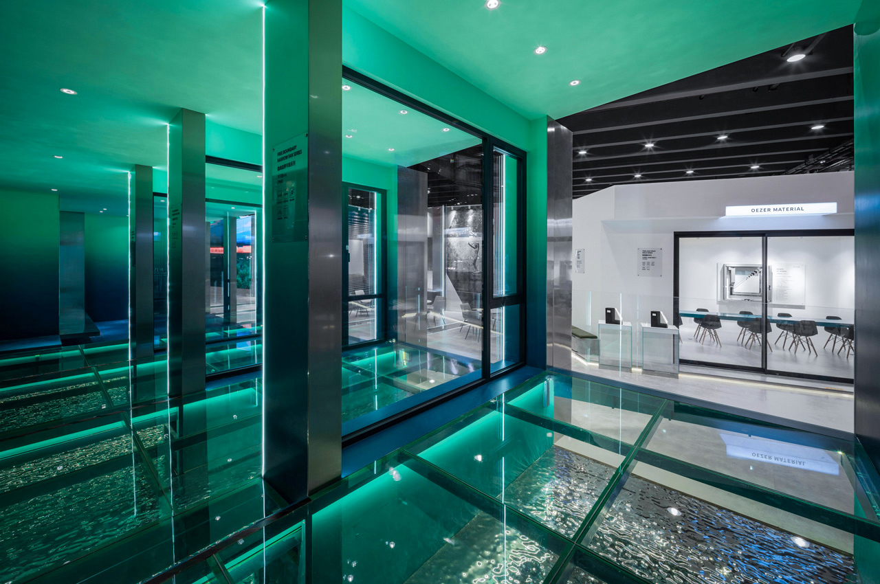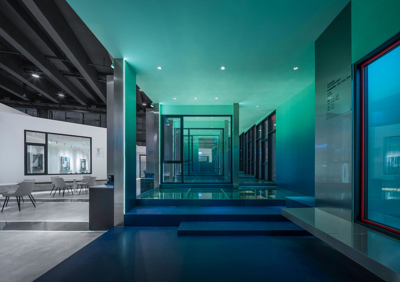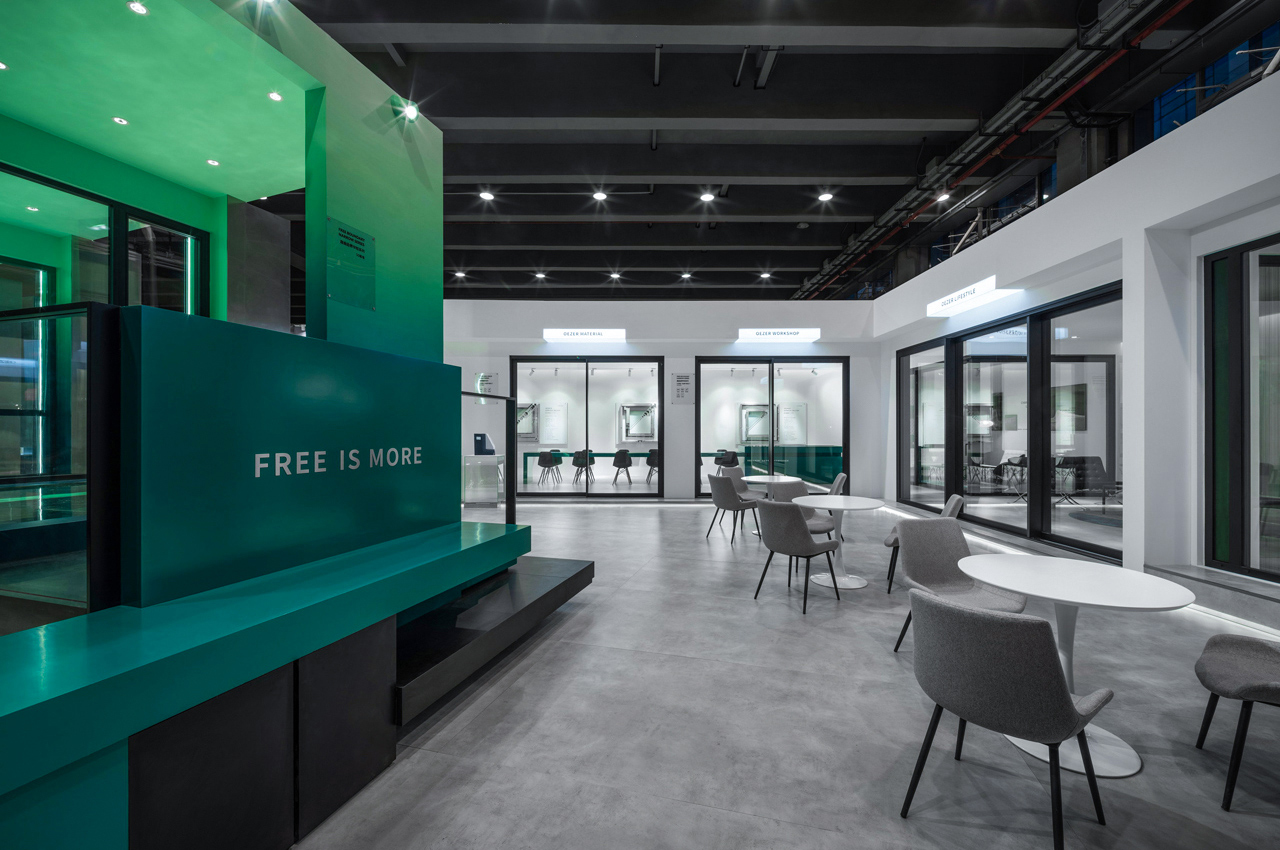 Connecting two ends of the traffic flow, a functional-flexible square that conforms the diagonal direction of the LAB on the deformed area. The retreated entrance position creates a blurry boundary of the interior and an exterior room. Such a blank-leaving technique continues the design language of OEZER’s exhibition room. The flexible square was endowed with multiple and variable functions to hold activities such as lectures and press conferences, letting the dynamic communications and static presentations could possibly happen at the same time, the same place. Hence, the exhibition venue is no longer just a spatial but is able to create abundant and infinite possibilities.