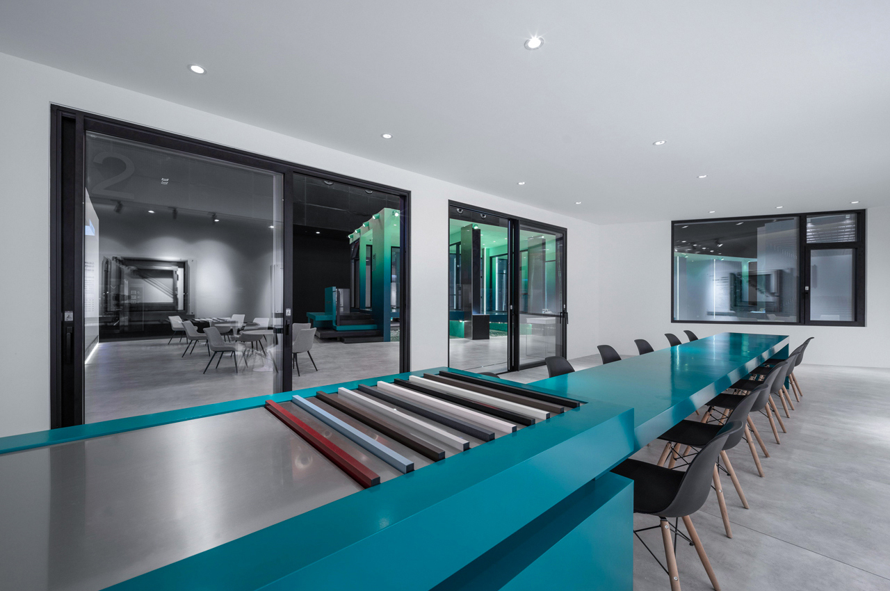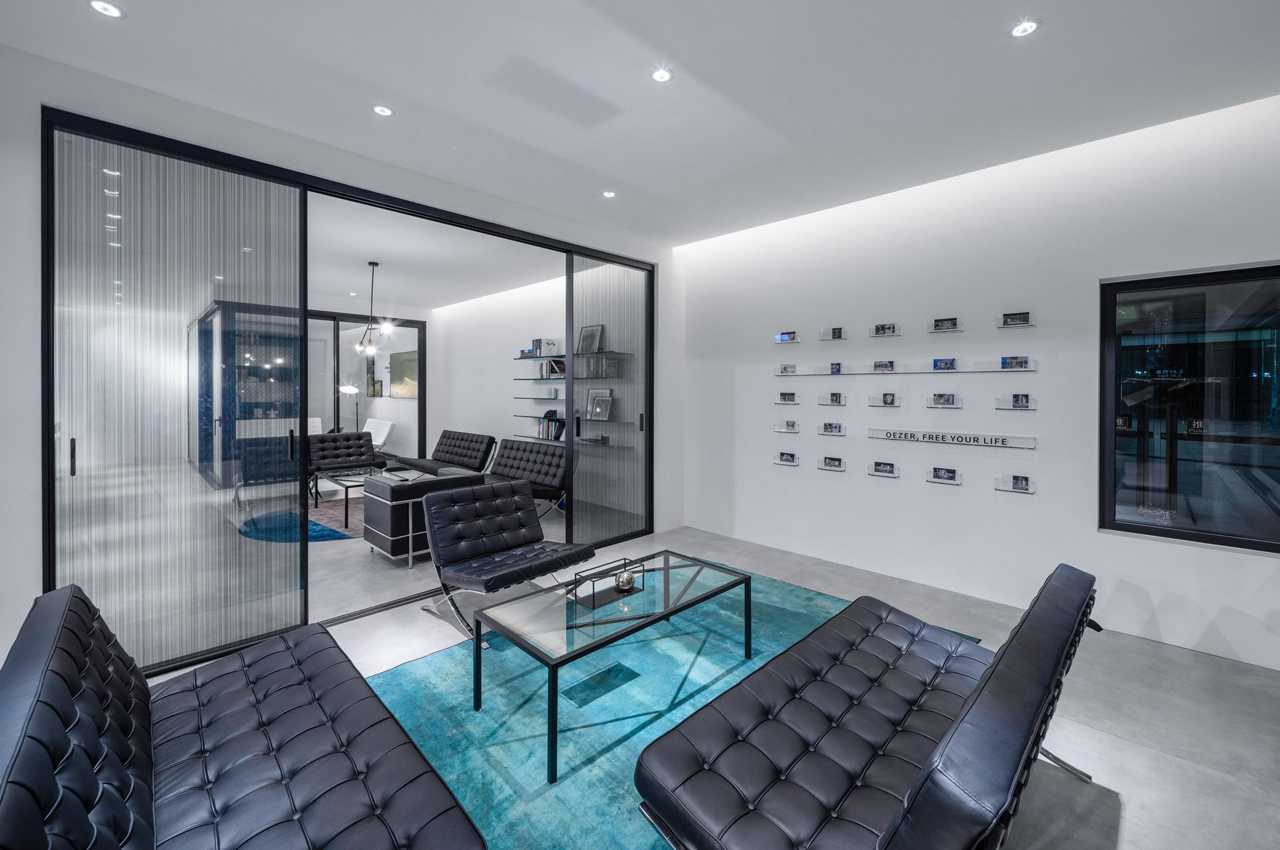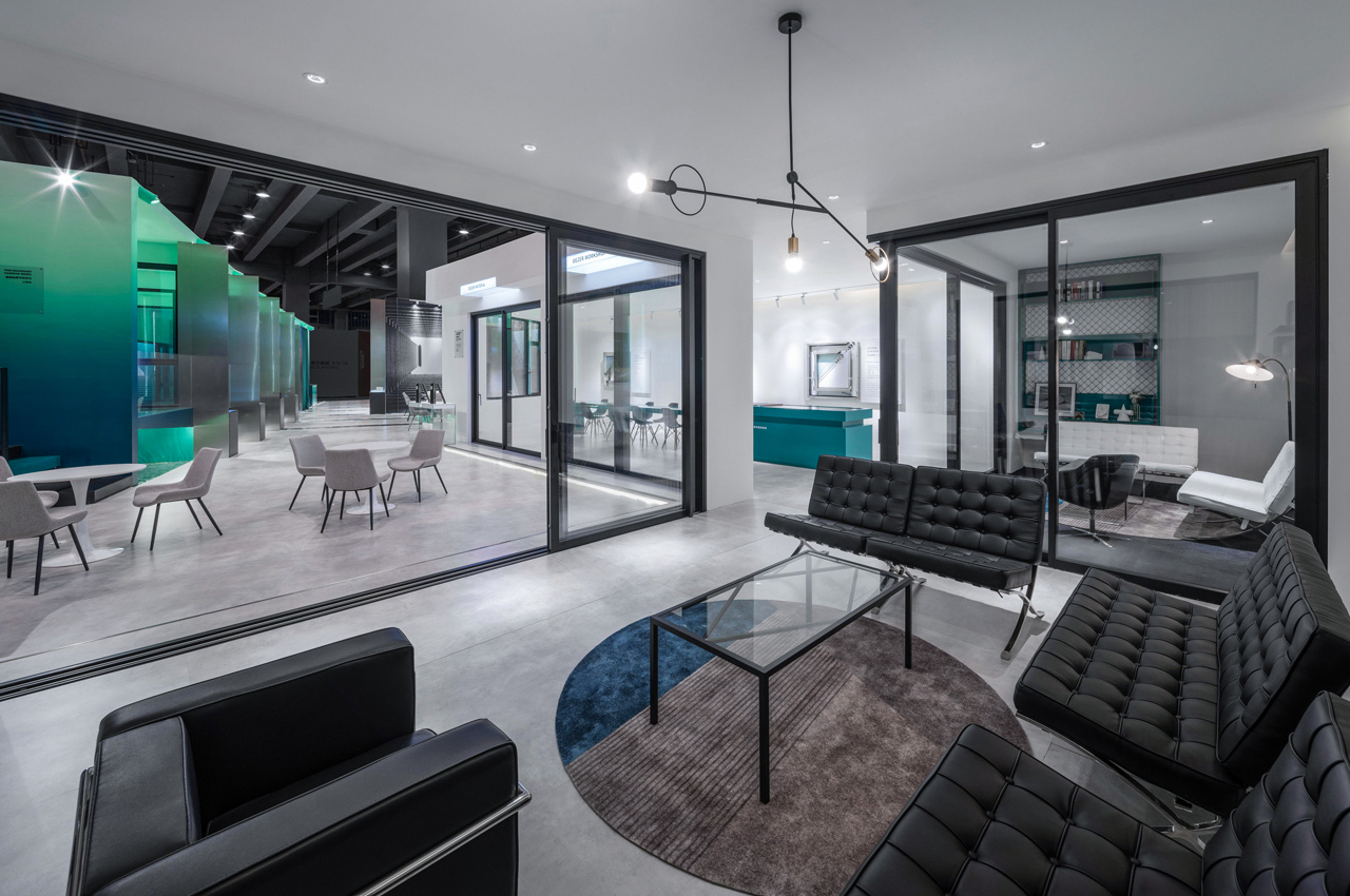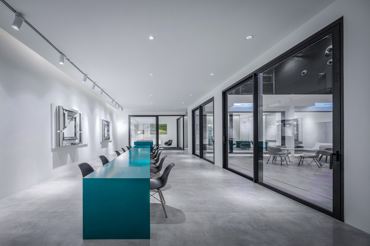 Connecting two ends of the traffic flow, a functional-flexible square that conforms the diagonal direction of the LAB on the deformed area. The retreated entrance position creates a blurry boundary of the interior and an exterior room. Such a blank-leaving technique continues the design language of OEZER’s exhibition room. The flexible square was endowed with multiple and variable functions to hold activities such as lectures and press conferences, letting the dynamic communications and static presentations could possibly happen at the same time, the same place. Hence, the exhibition venue is no longer just a spatial but is able to create abundant and infinite possibilities.