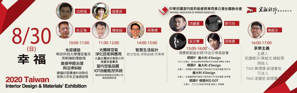 感謝台北市室內設計裝修商業同業公會的邀請, 參予2020 台灣室內計·材料打大展「D-Talk論壇 幸福講座」 詳細參考網址:https://tid.com.tw/