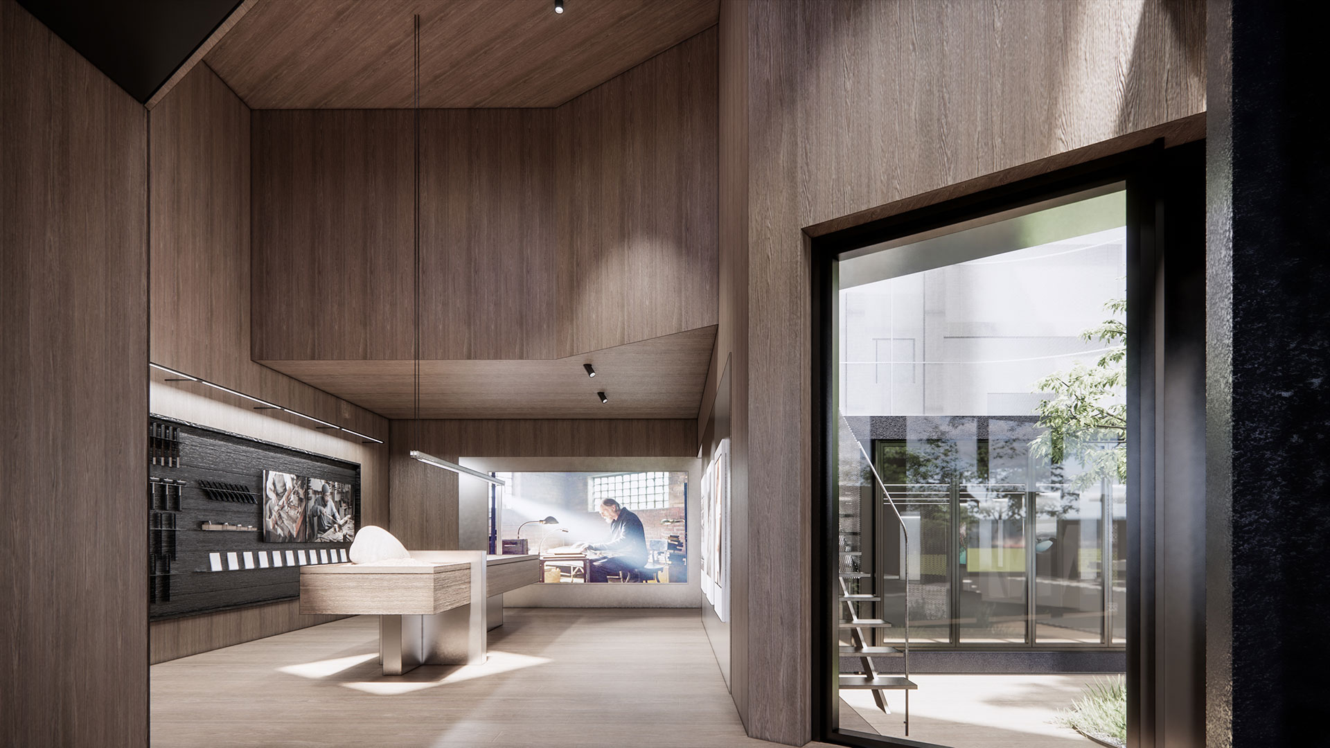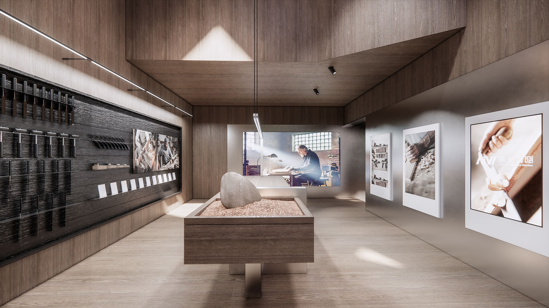 台中總部展廳設計融合榫卯工藝與多材質交替,以環形動線串聯三大展區。步入接待區,首先映入眼簾的是像徵品牌初期的木藝展廳,展現品牌對傳統手工藝的敬重和父輩對兒子傳承匠心精神的殷切期望;隨後的“時光廊道+ BK學院”展現了品牌在設計與研發中的累積與傳承,象徵技藝的薪火相傳;接著進入二代鋁門窗展廳,展現技藝在每一代產品中的進化與優化,最後來到三代智慧AI窗展廳,展現品牌擁抱未來、引領智慧家居潮流的創新精神。
