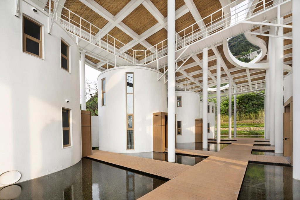 郎酒莊園二期酒歌廣場位於四川瀘州二郎鎮,是郎酒集團的大型造酒基地。設計包含食堂、美術館、特色民宿、文創街區和懸崖酒吧五大模組,旨在打造國際視野的全球性設計規劃案。竹工凡木團隊保留舊酒槽等文化遺構,以新舊合璧的設計手法,重新定義白酒釀造核心區域的價值。採用有機曲線設計的建築造型,輕量化、去邊界化地融入赤水河畔的自然景觀。在「關係論」的設計思維之下,探索建築與自然、情感和商業的和諧關係,創造出極具包容性與連接性的空間新物種。