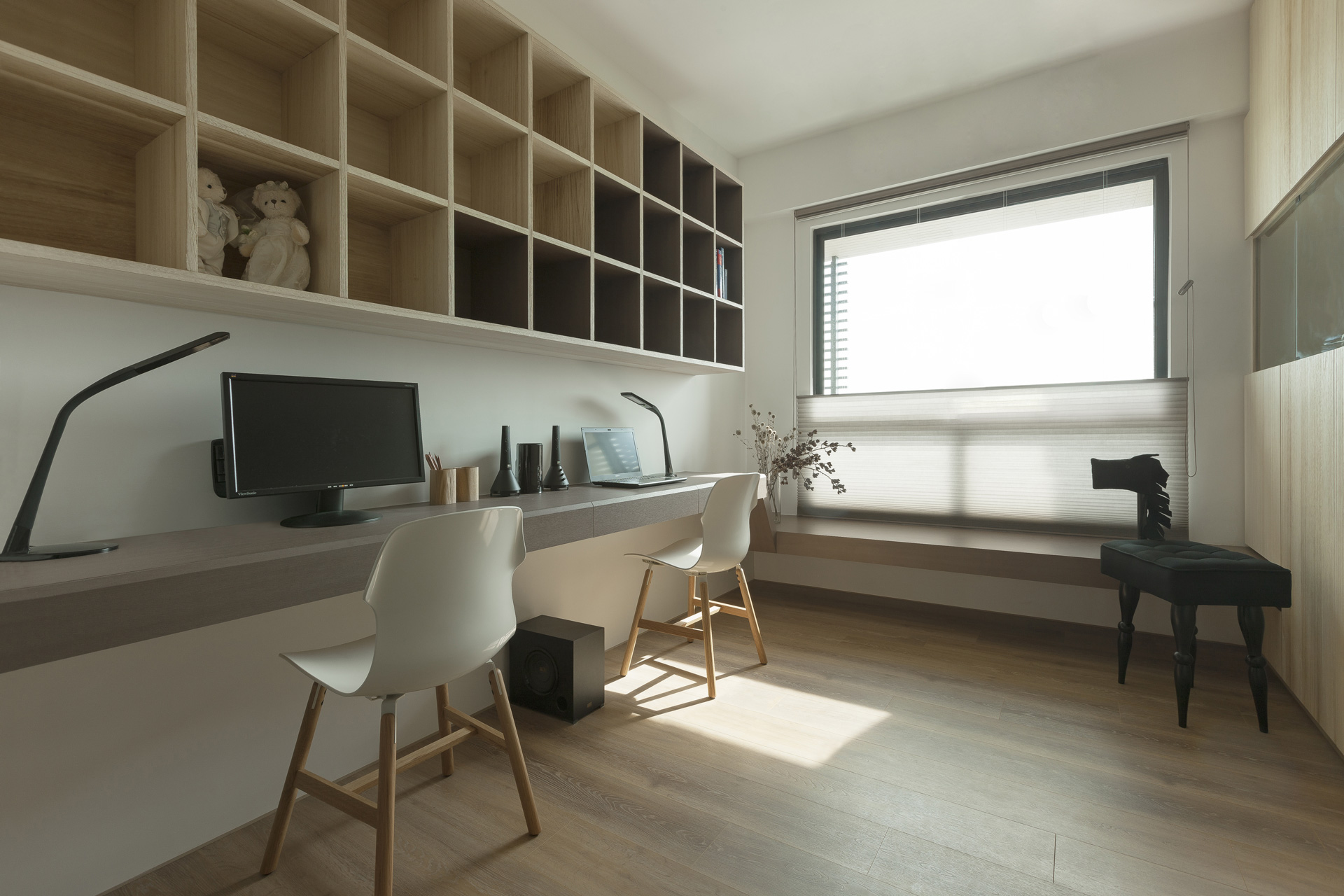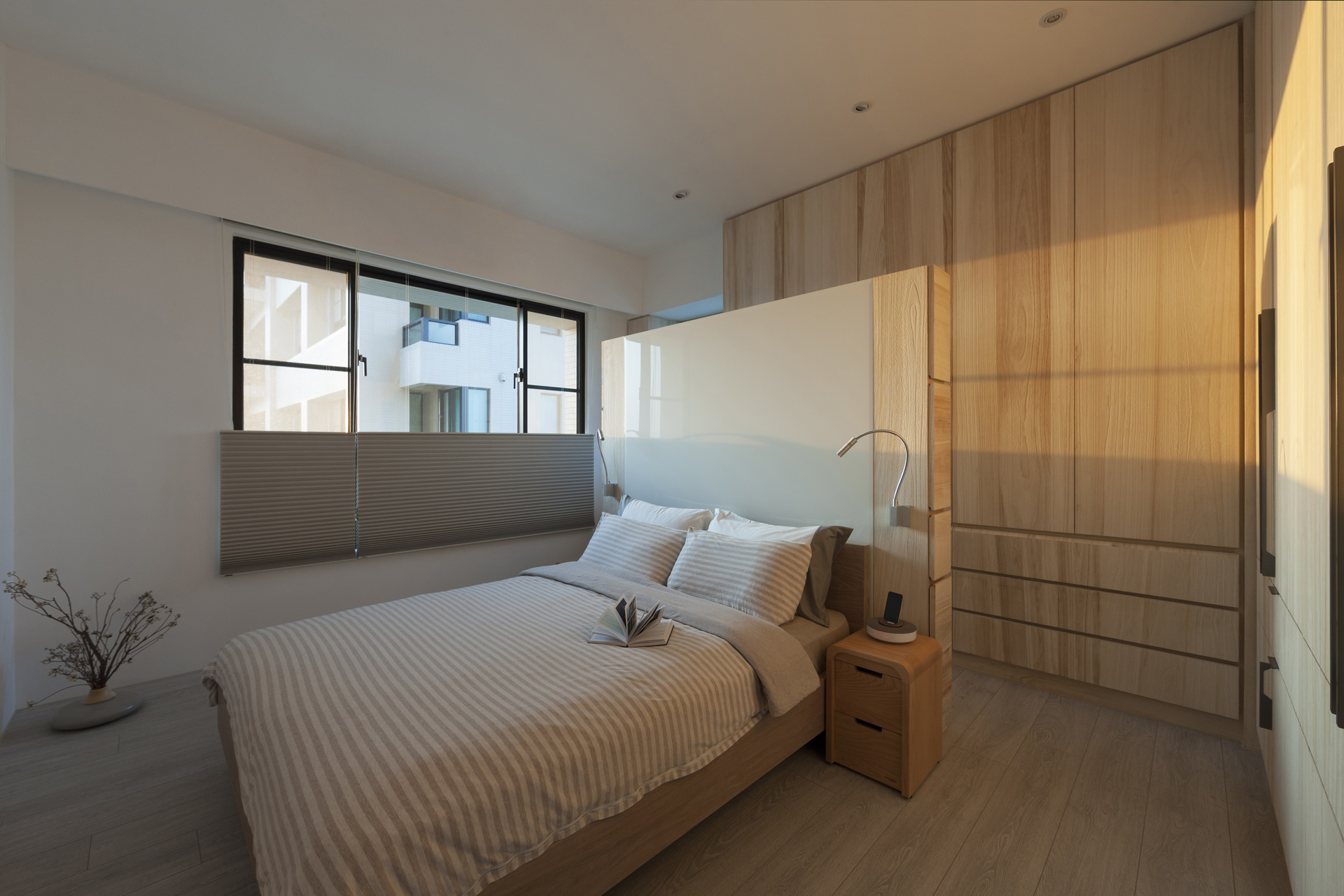我們將床視為生活中一個重要的「空間物件」,有效界定了後方的更衣空間,同時也將記事板、收納和展示的機能化整為零,將其整合為一,成為另一個重要的生活場域。
