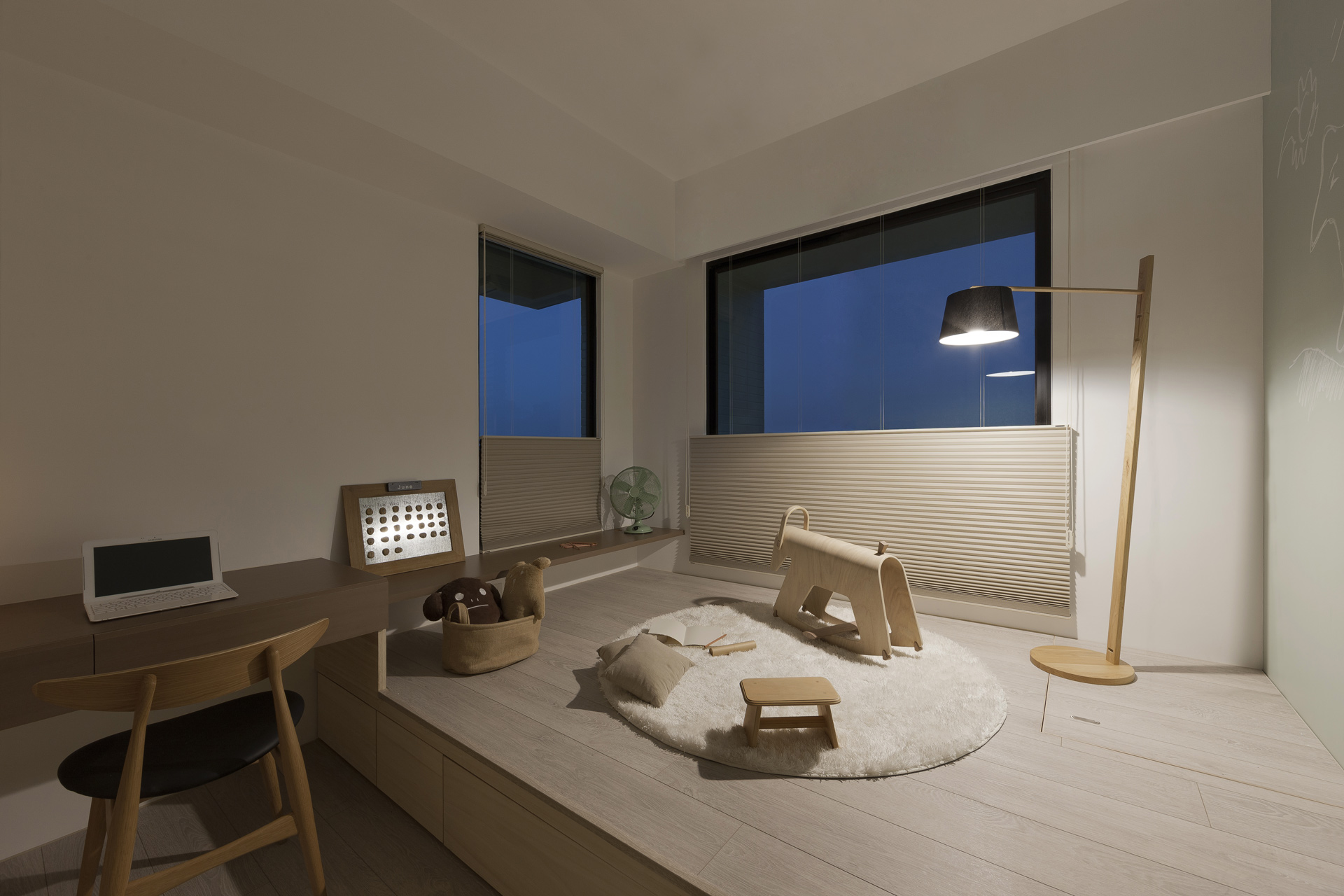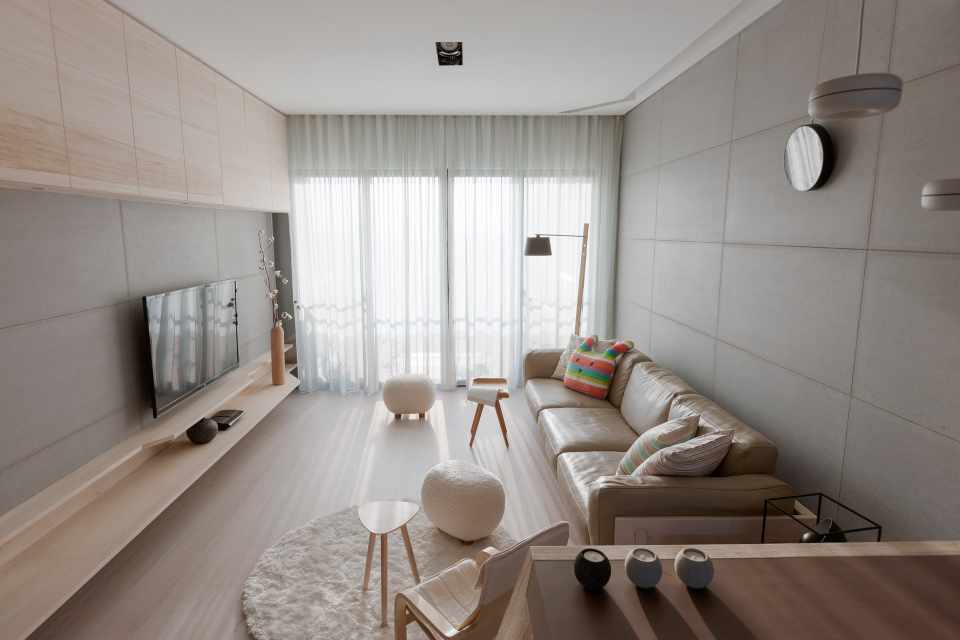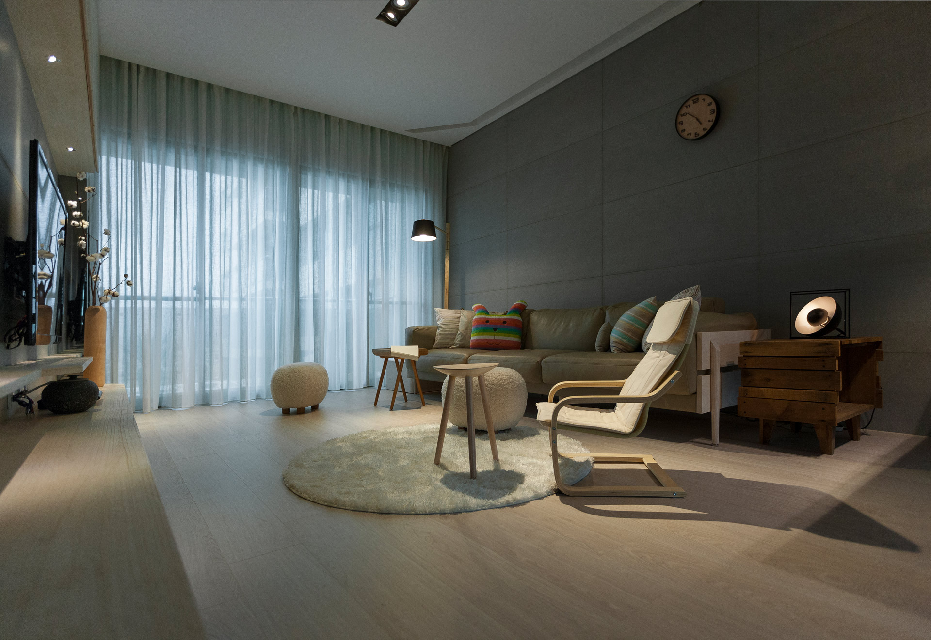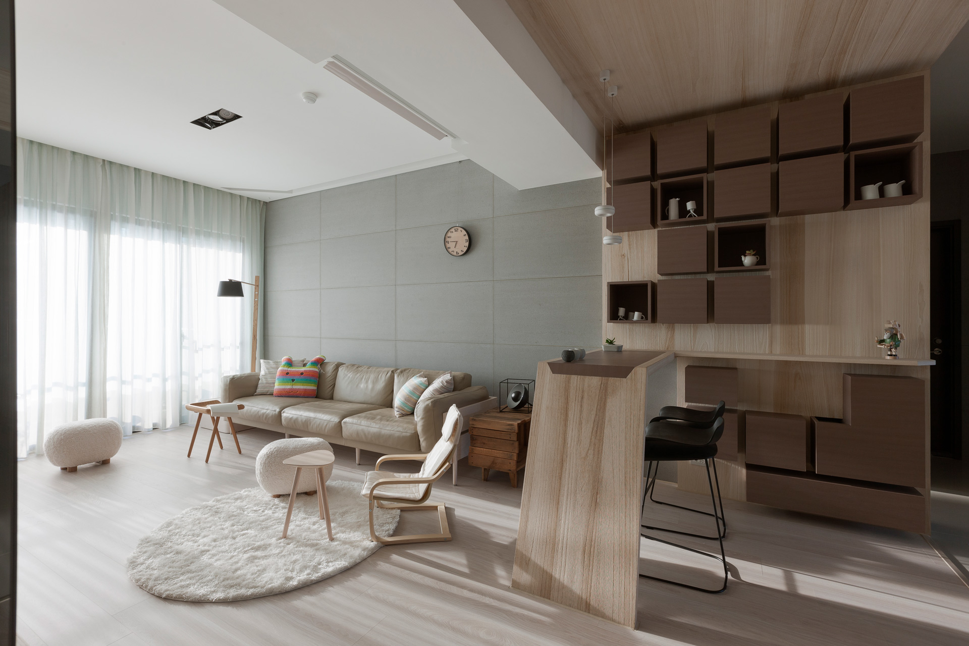台南,一對年輕夫妻的住宅,人生第一間自己可以擁有的「家」,以最簡單樸實的基調添加一抹生活情趣的浪漫語彙,來回應新婚業主對於甜美家庭的渴望與期待。空間物件是觸發生活事件的重要開關,我們置入幾個重要的空間物件,並配置空間的核心位置,如BAR台、沙發組、餐桌、床,藉此使其成為生活的核心場域。我們將沙發視為生活中一個重要的「空間物件」,將四人座的大沙發視為一整體,同時配上幾個活動茶几與造型座椅,試圖在一組序列中置入二個獨立小區的可能,來回應業主的非線性使用需求。
