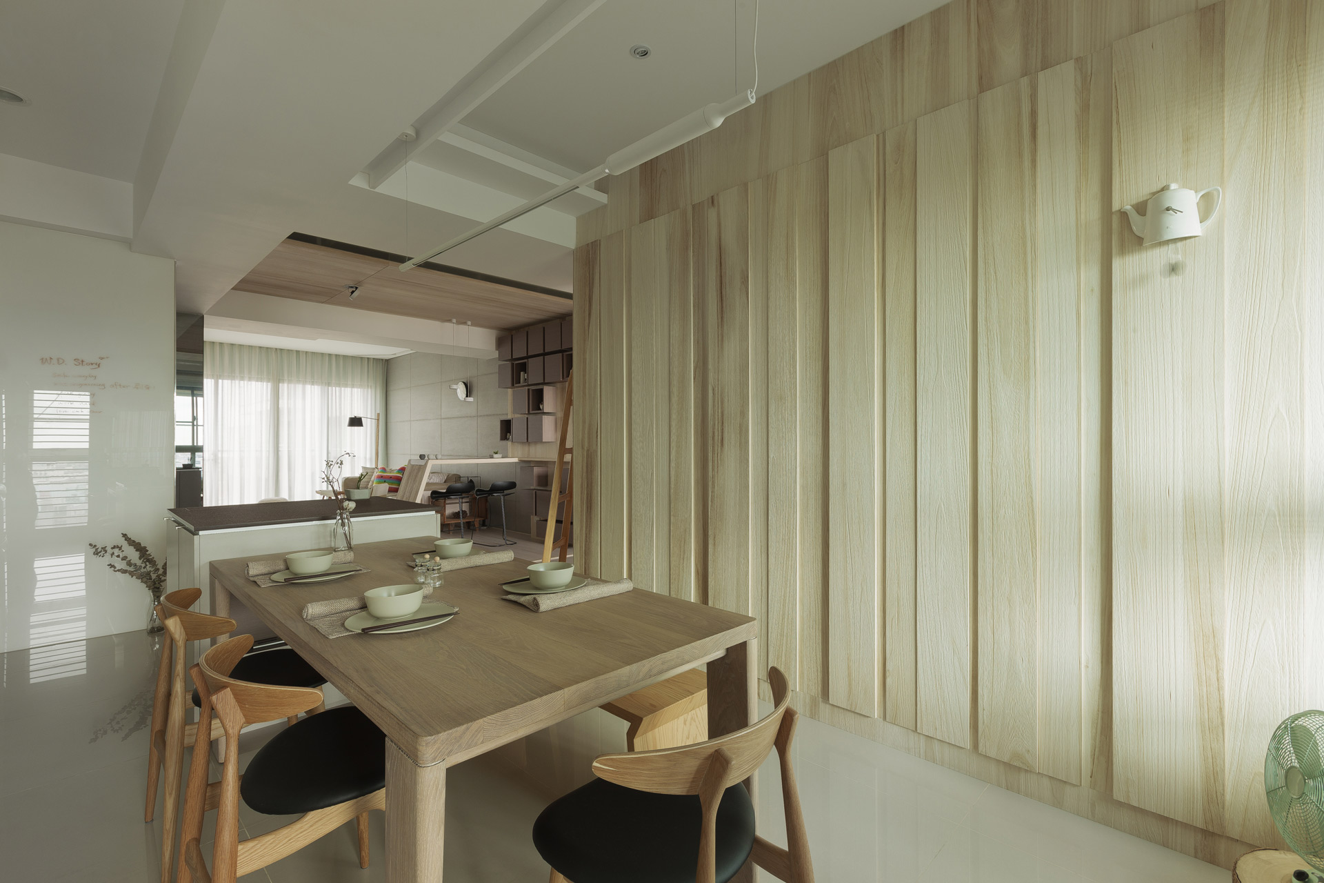 我們將餐桌視為生活中一個重要的「空間物件」來滿足業主多面向的需求,附有伸降電視的訂製木作餐桌,配合單椅和長凳的組合,讓餐桌不僅是吃飯的場所,亦可是成為生活起居、聊天話家常的重要生活場域。