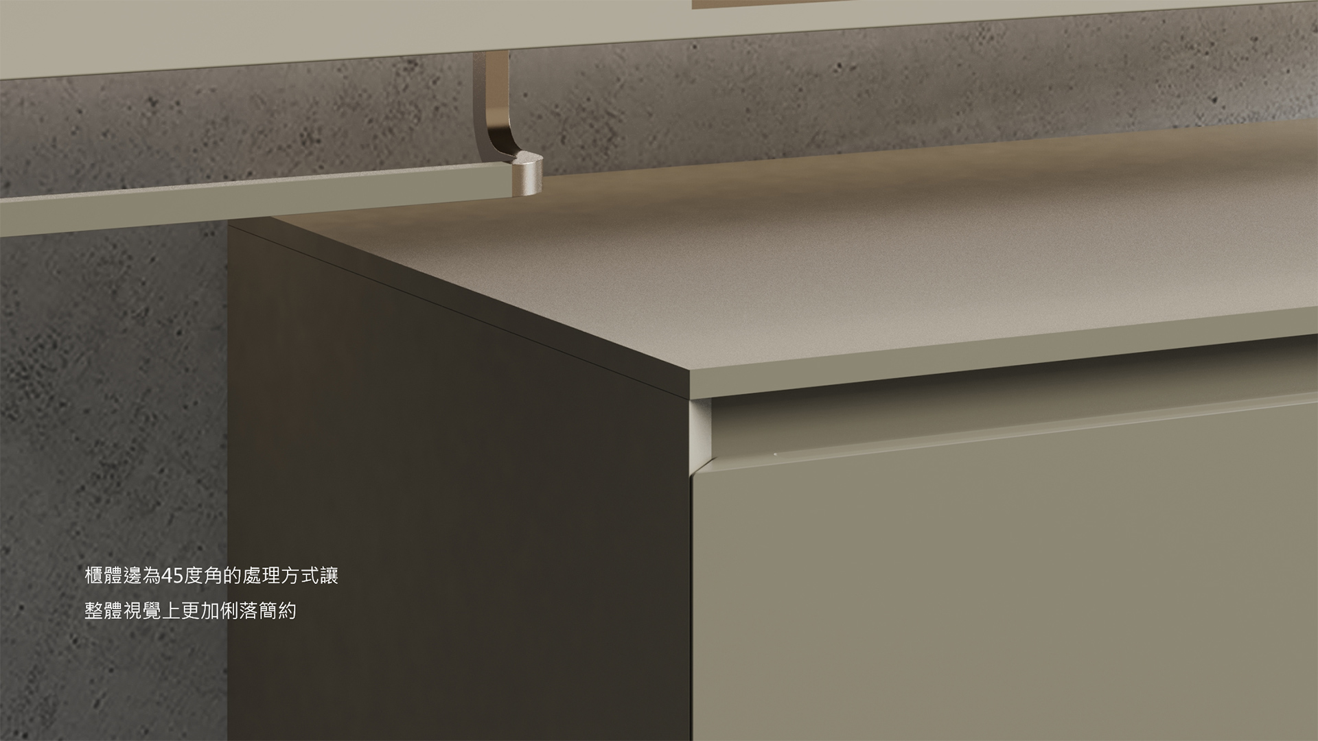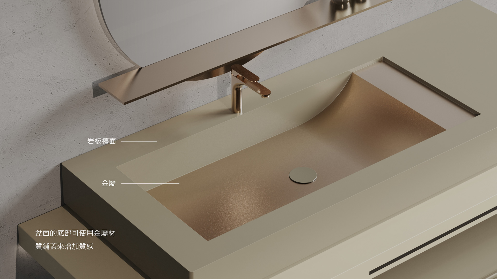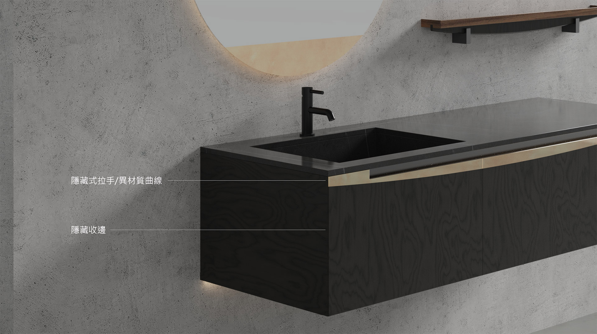浴室櫃系列以建築的馬背元素低調得貫穿整體,並用簡潔塊體錯落的方式製造高低層次,異材質加上整潔的細節帶出細緻感,在極簡限代中創造出東方韻味。