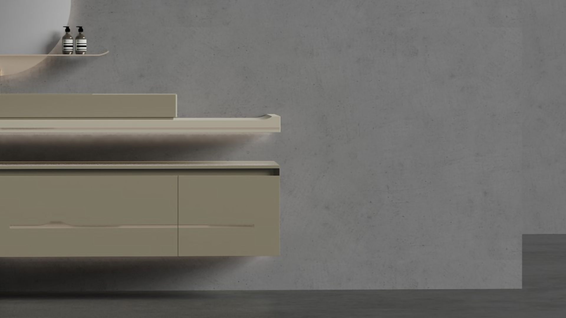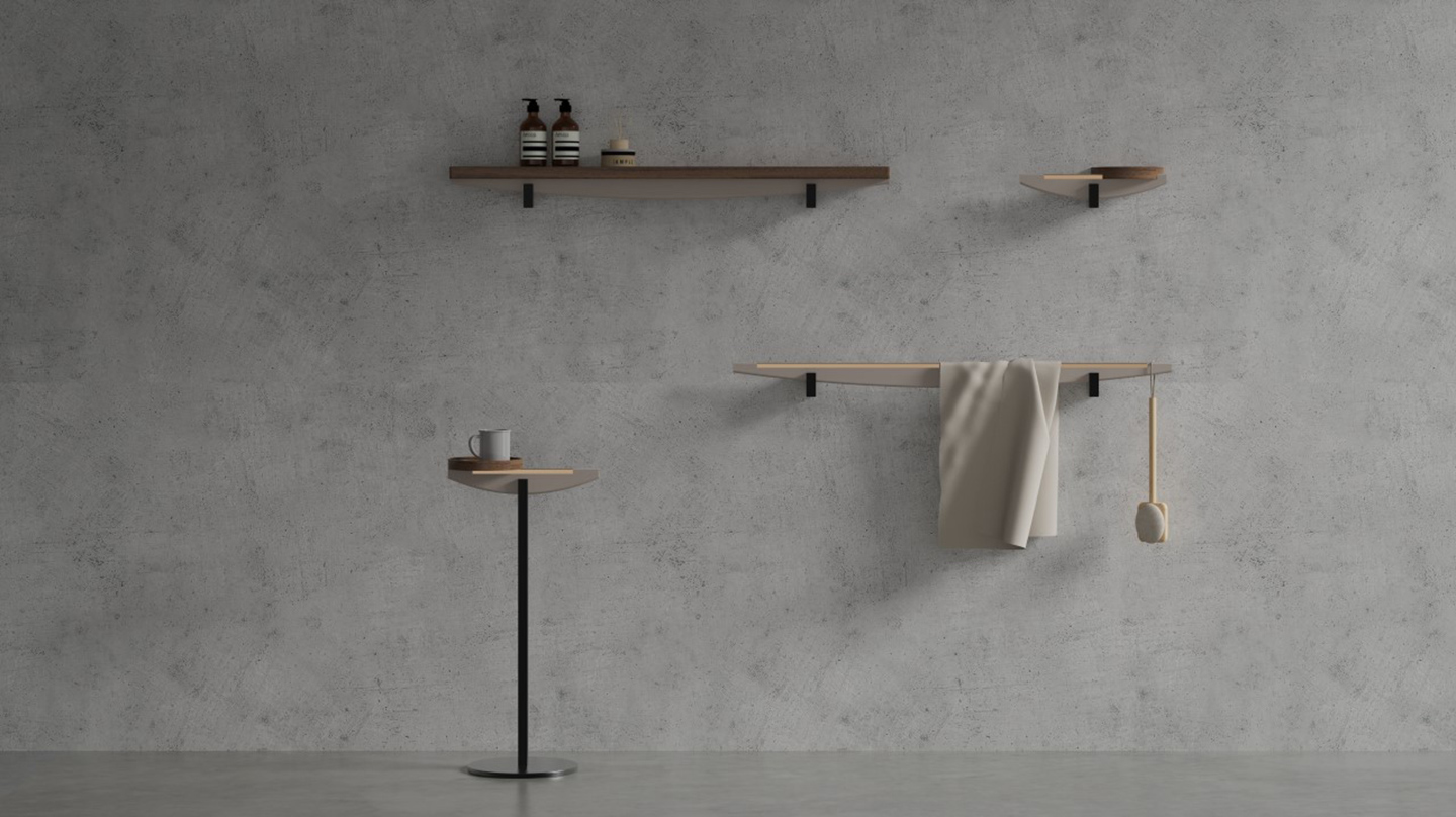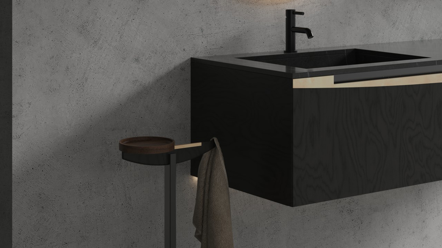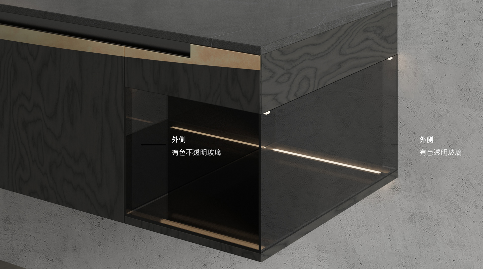 浴室櫃系列以建築的馬背元素低調得貫穿整體,並用簡潔塊體錯落的方式製造高低層次,異材質加上整潔的細節帶出細緻感,在極簡限代中創造出東方韻味。
