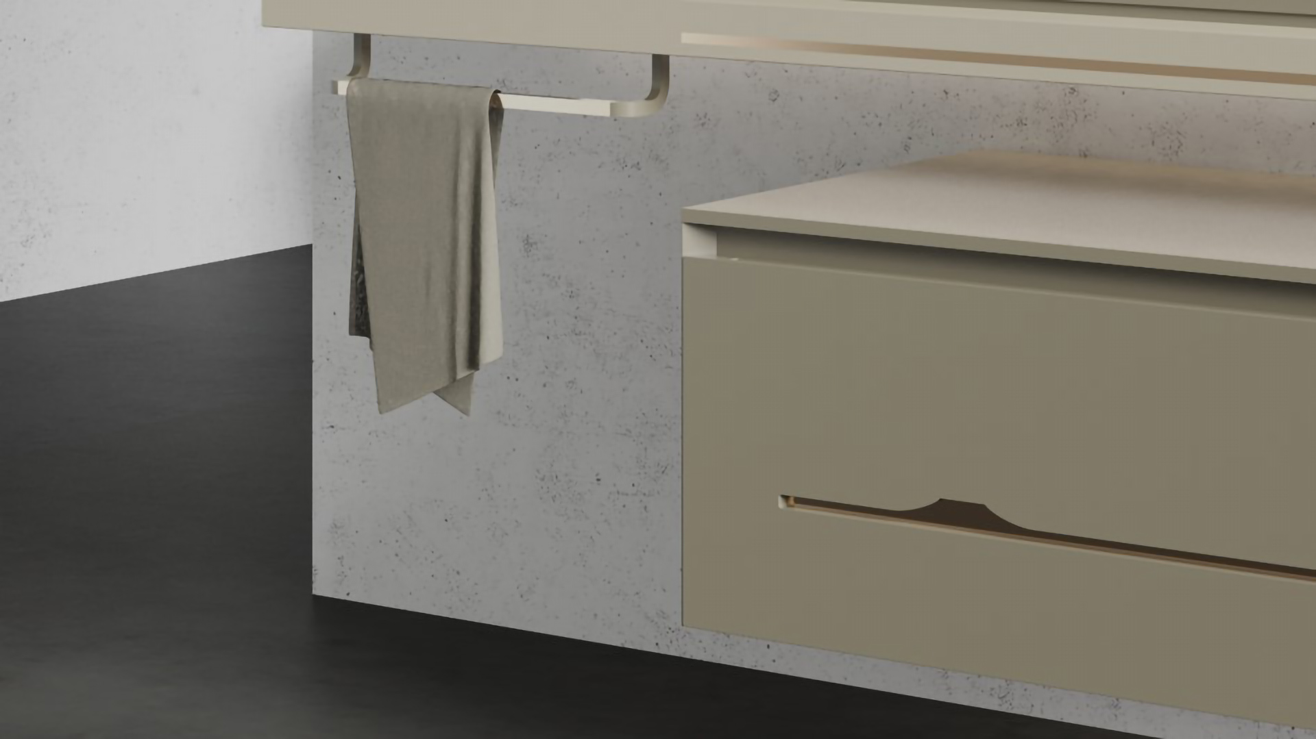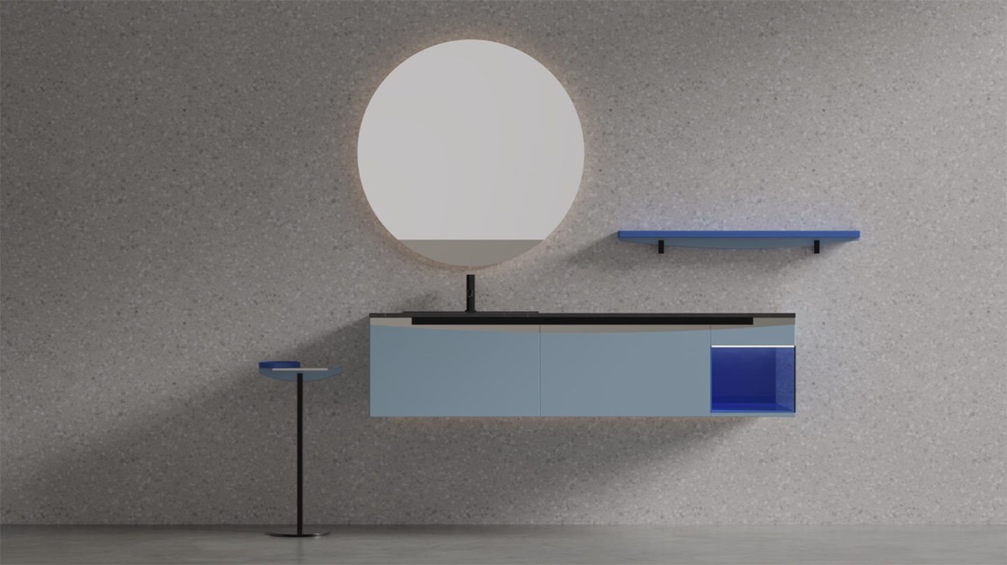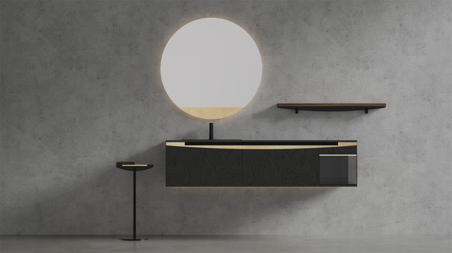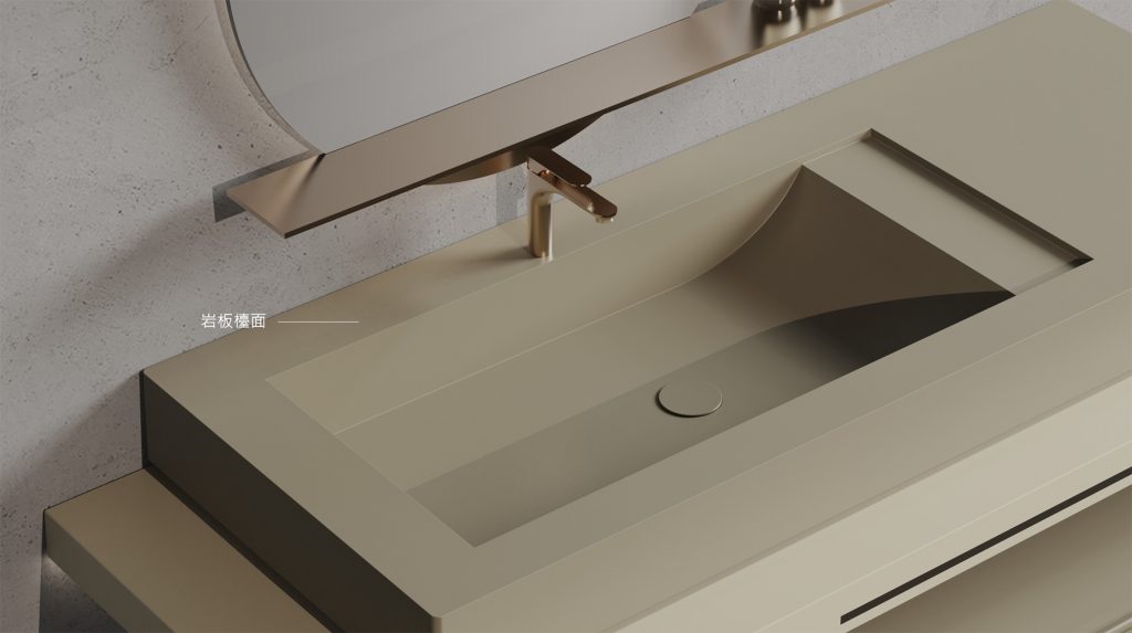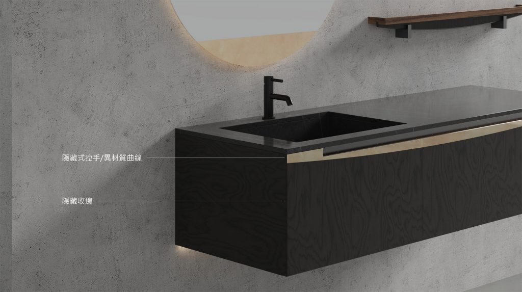 浴室櫃系列以燕尾般的曲線串連整體,並於弧線中置入矩形元素,呈現圓中帶方的意向,在極簡的當代手法下蘊含東方風格的細節。