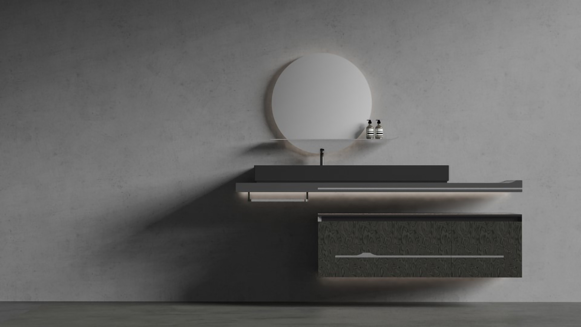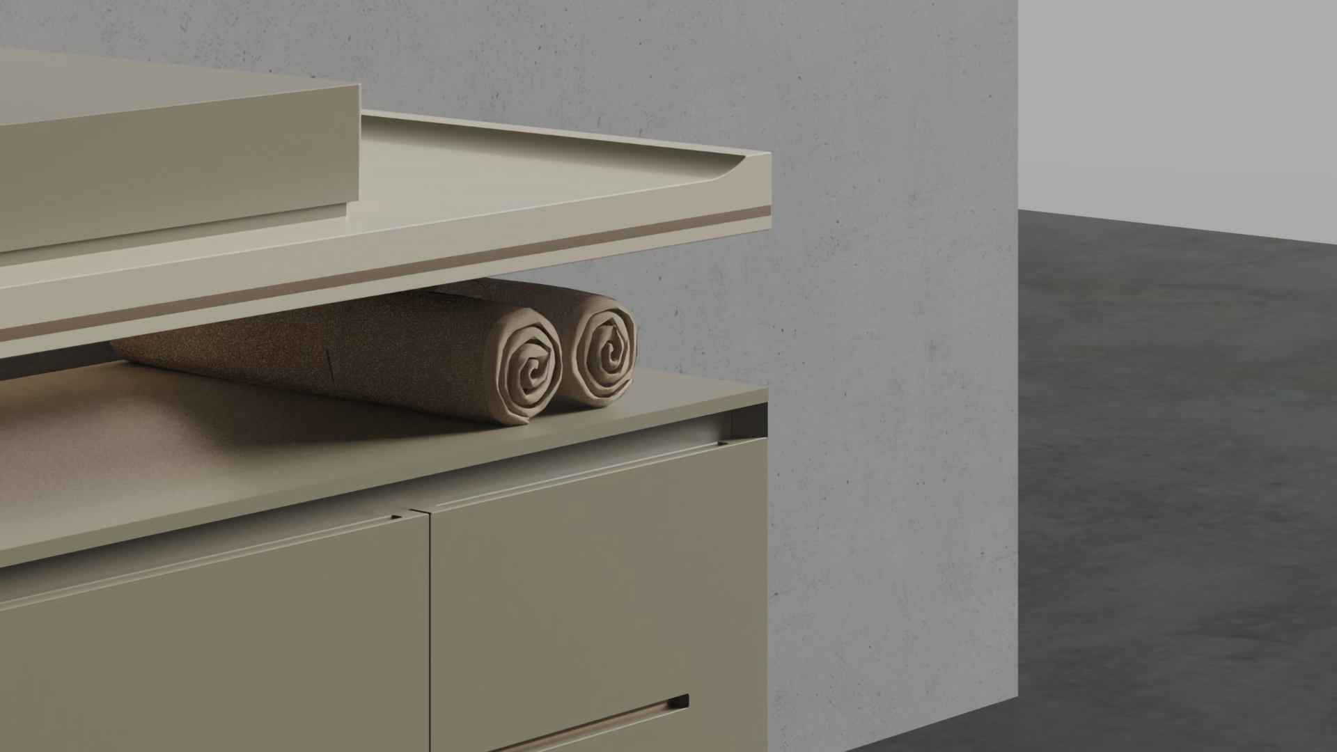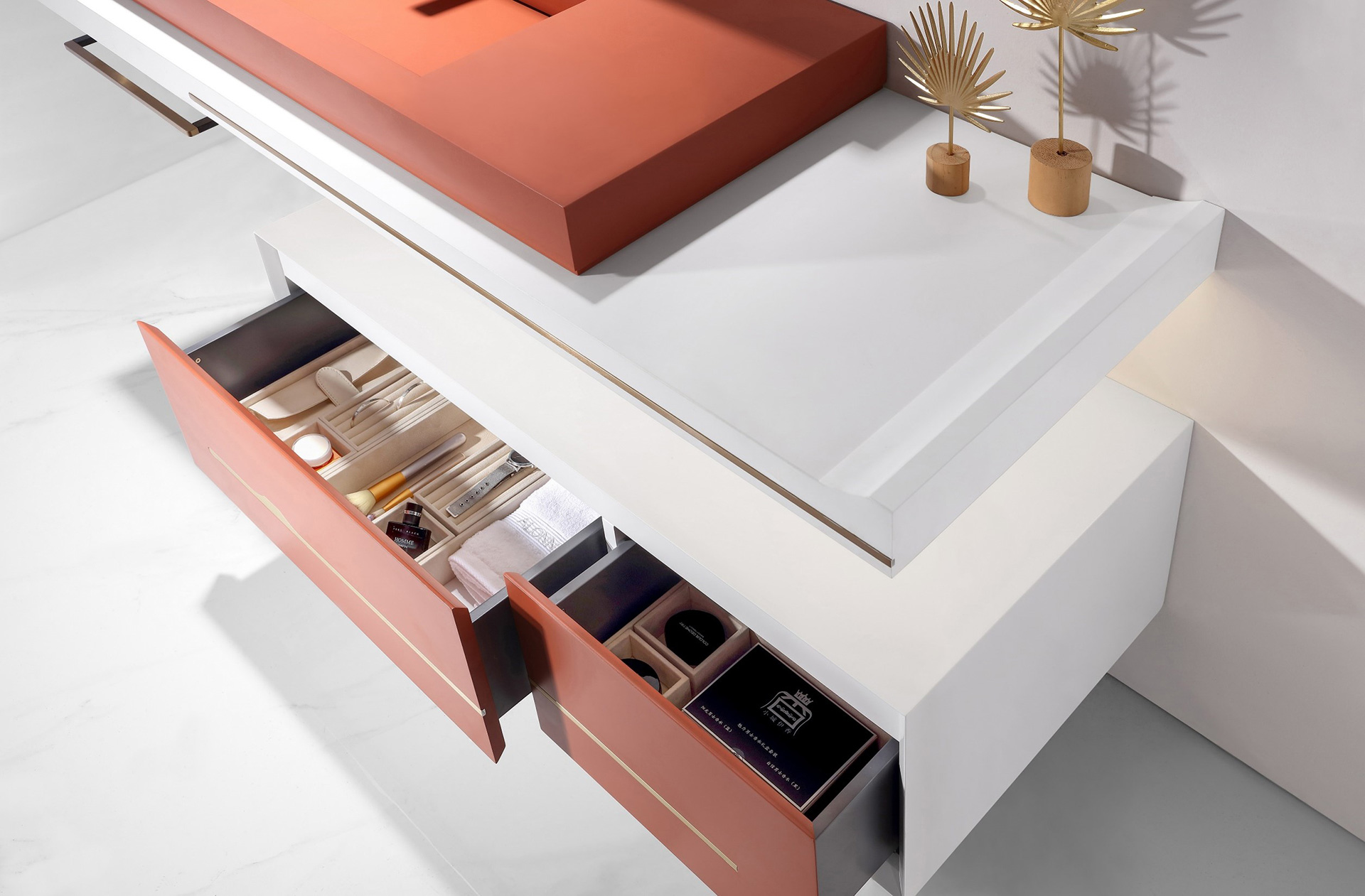 浴室櫃系列以燕尾般的曲線串連整體,並於弧線中置入矩形元素,呈現圓中帶方的意向,在極簡的當代手法下蘊含東方風格的細節。