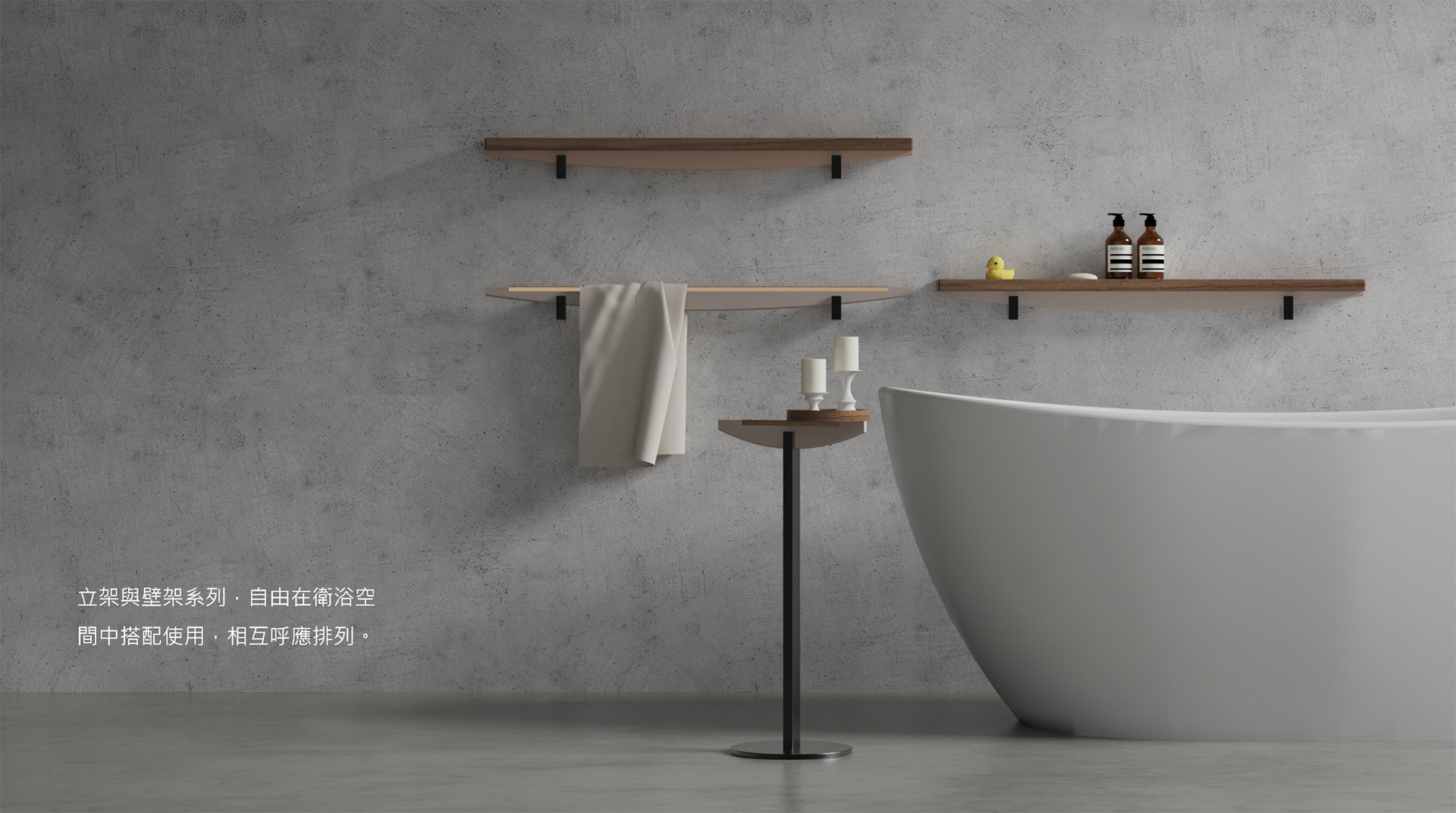 立架與主櫃相互搭配使用,放置在洗手槽旁,可掛擦手毛巾,也能暫放隨身物件和首飾。