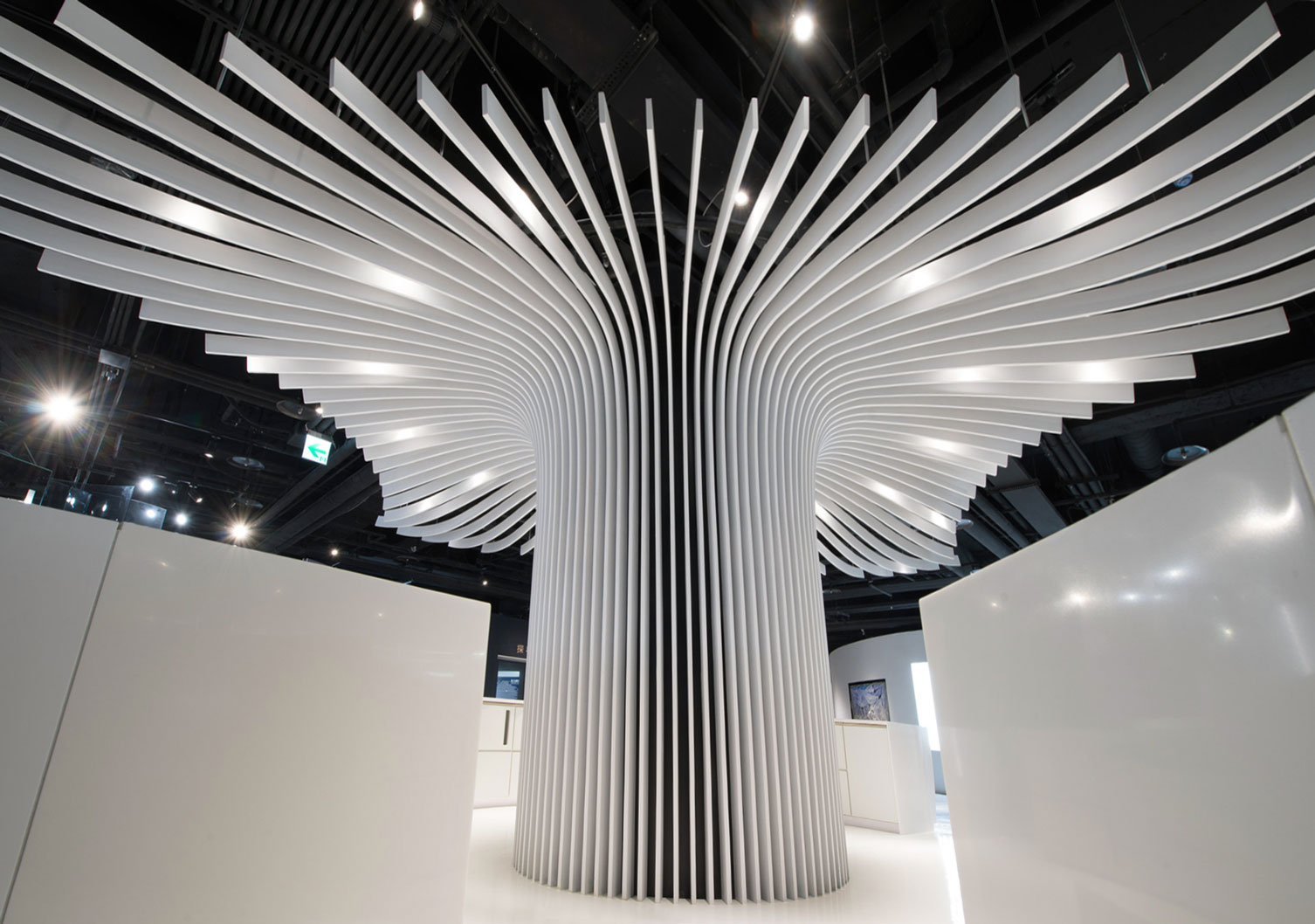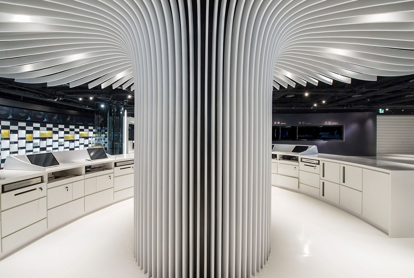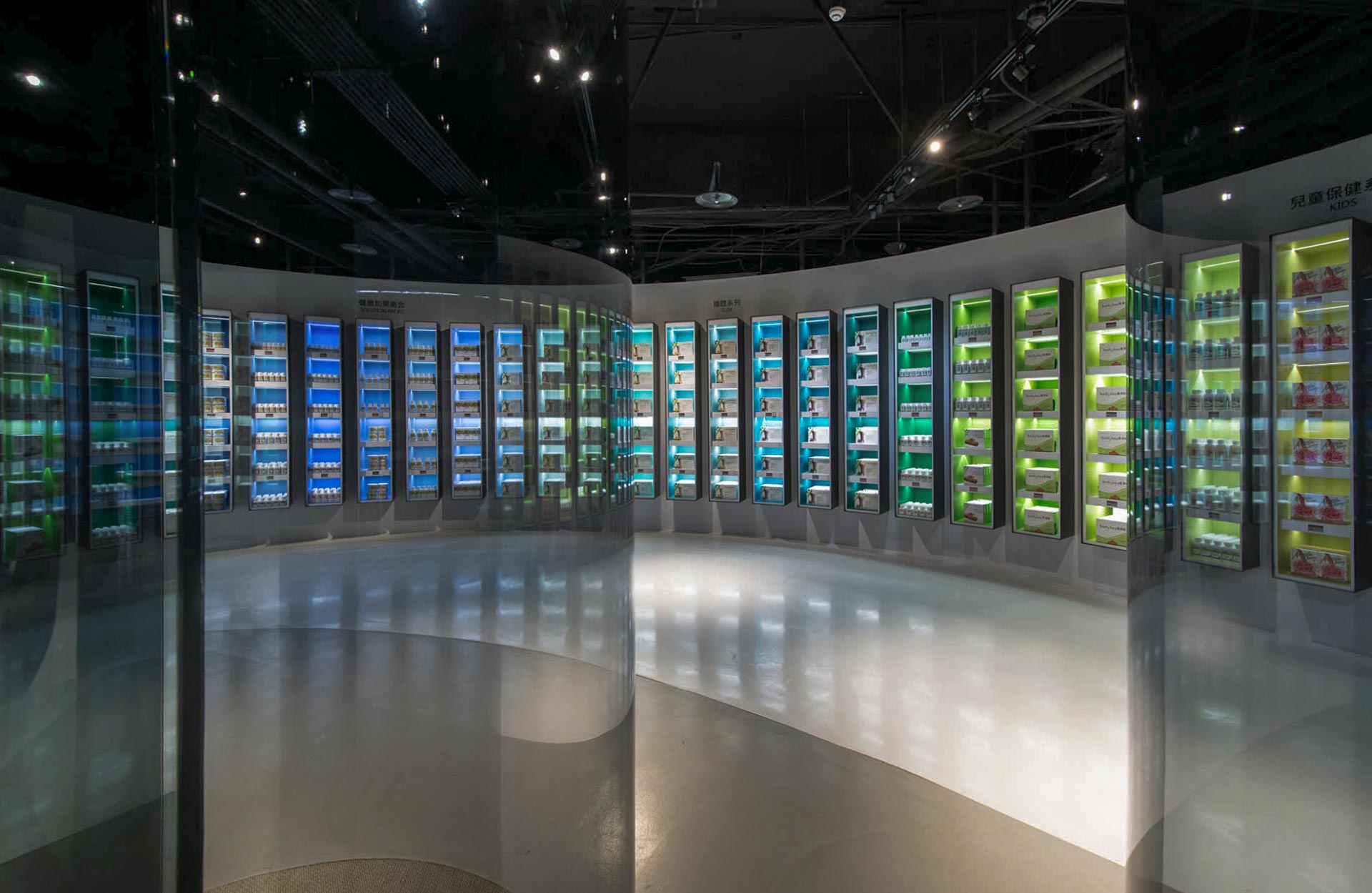 延續黑白色系為主調的室內間設計,主要展售區內,包含化妝品、健康食品與生活用品三種主要銷售類型區塊,以三個相連的弧型區塊界定的空間場域中,透過Light ID、虛擬顧問、InBody、數位展示面板…等多媒體互動裝置,巧妙地運用先進的科學技術,將商品展售與個人化體驗,結合於陳列銷售區域內,以高度的人機互動反饋,創造全新的商品展銷模式。位於整體空間中心的服務櫃台,則以樹為概念,透過數位運算切割的二維板材,恣意排列、圍塑成均直俐落的白色樹形,以開枝散葉的意象,建構開放平面中的視覺重心,創造出未來感空間中冷調、洗鍊的專業品牌氛圍。