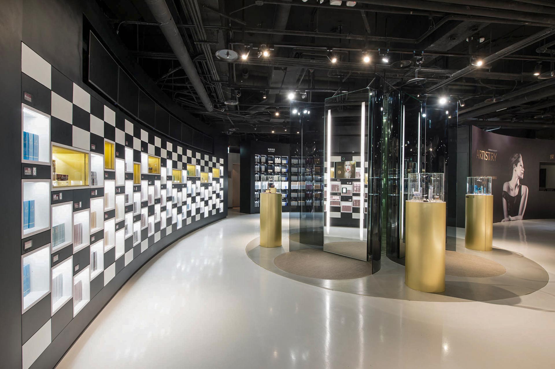 本案位處台北市中心,為知名直銷品牌安麗的體驗中心,在偌大的地下一樓,包含了商品體驗展售區、服務櫃台、基金會、吧檯休憩區、藝廊與倉儲區等空間。我們採自由平面的理念設計,圓弧形的曲面牆作為阻隔不同機能空間的介面,一方面收整因基地本身條件與服務機能空間切割而破碎的平面,同時也藉此區分商業空間與倉儲區域,讓身處其中的消費者能感受到獨到的尊榮感。天花板以黑色系為主調,刻意裸露的管線,搭配白色系的展示牆與地板及大量鏡面的設計,營造出科技化場域中,帶有簡約時尚的數位時代氛圍。