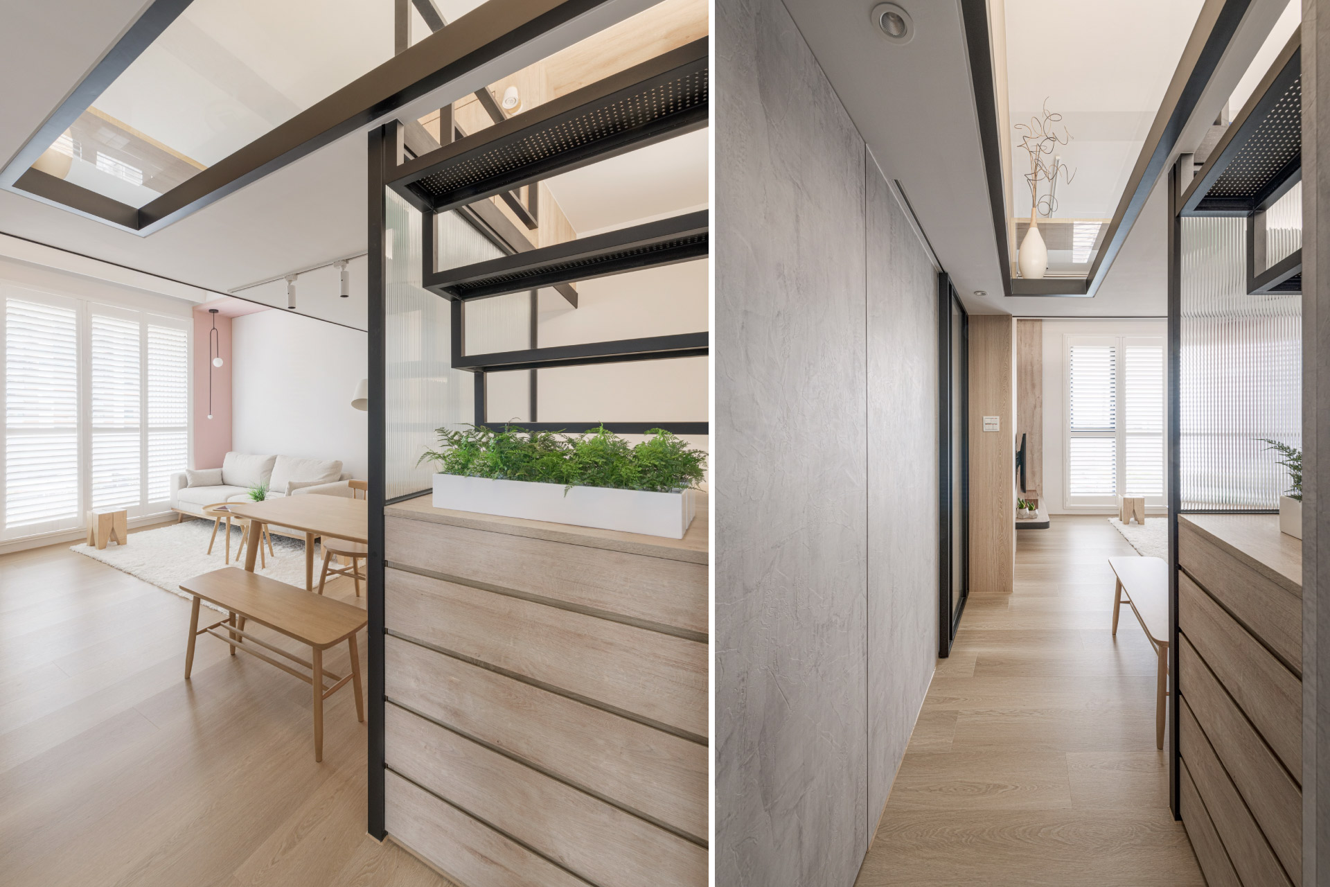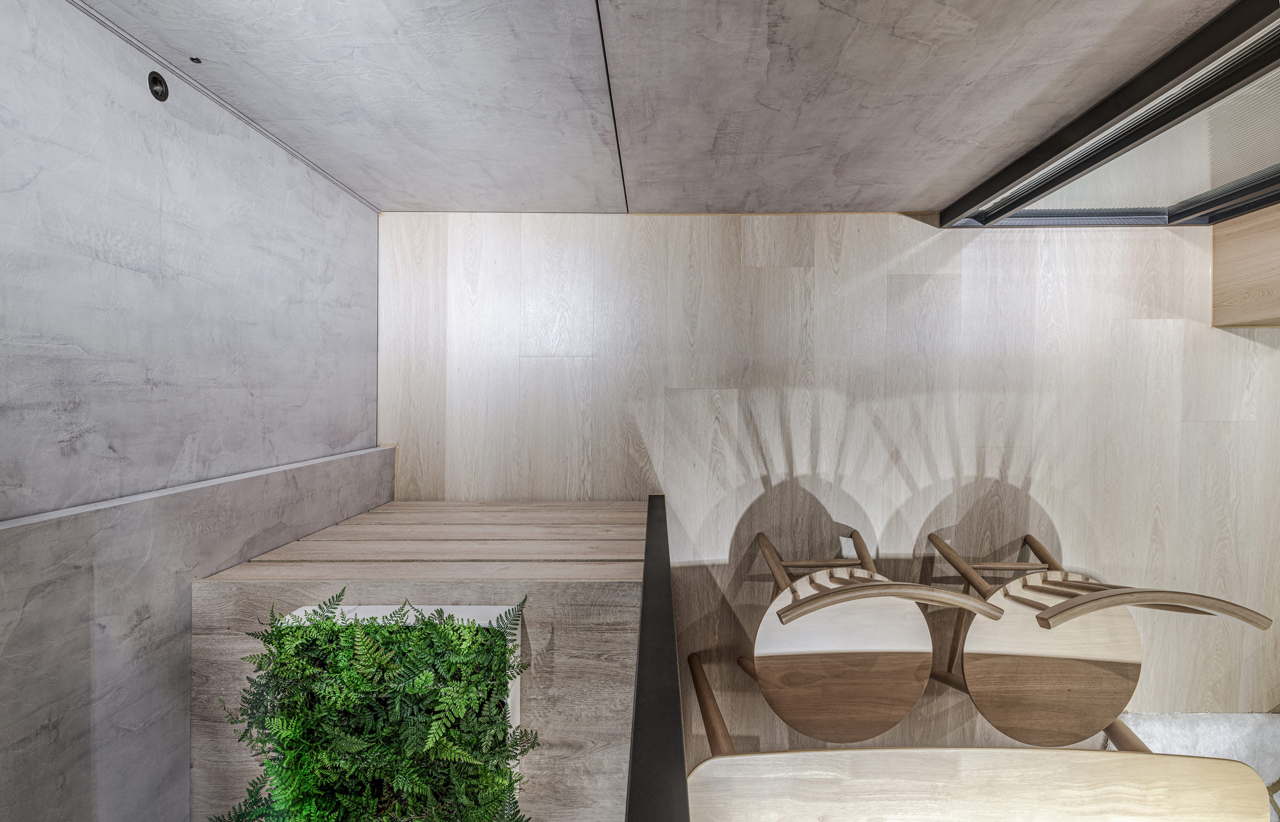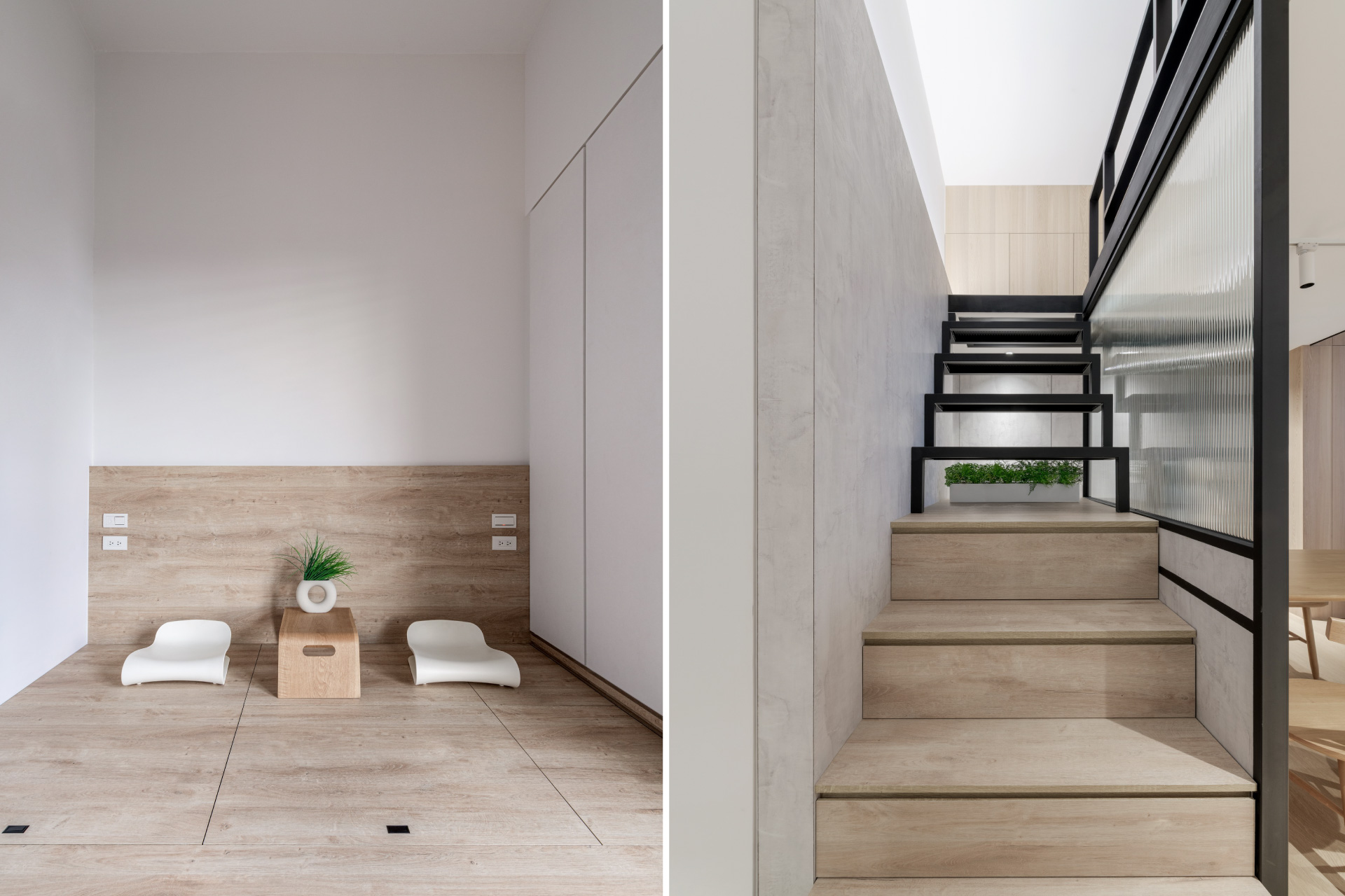 有鑑於實際空間有限,團隊特別於餐廳上方增設1.4米高的夾層,沿餐廳旁的梯階拾級而上,小而精巧的夾層空間成為一個得以閱讀、談天、短暫留宿的多功能場域,兩側牆面以隱藏壁櫃滿足物件收納上的需求。餐廳旁的樓梯在尾端部分與主臥及浴廁出入口相對,藉由梯階平台的高度落差,打造雙向皆可開闔的雙面櫃,讓梯間的正反面都成為視覺上的端景,並能滿足實際功能面的使用。為改善室內中央採光,團隊以長虹玻璃推門為介面,自廚房引入自然光線,在充盈光照之餘亦能保有私隱。同時在夾層地坪臨主臥一側亦以挖空處理,再以玻璃鋪面形成一條帶狀天井,一方面增添下方動線的明亮感,同時亦創造出垂直向度的空間對話。