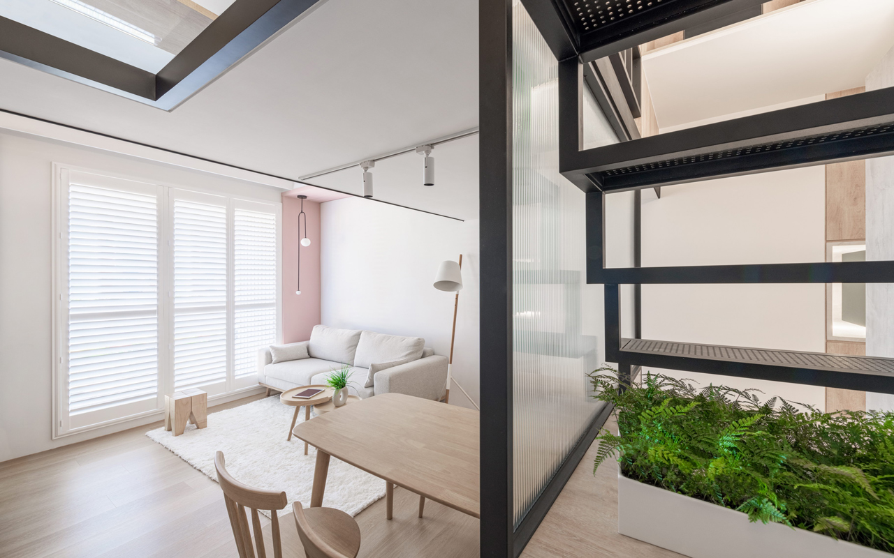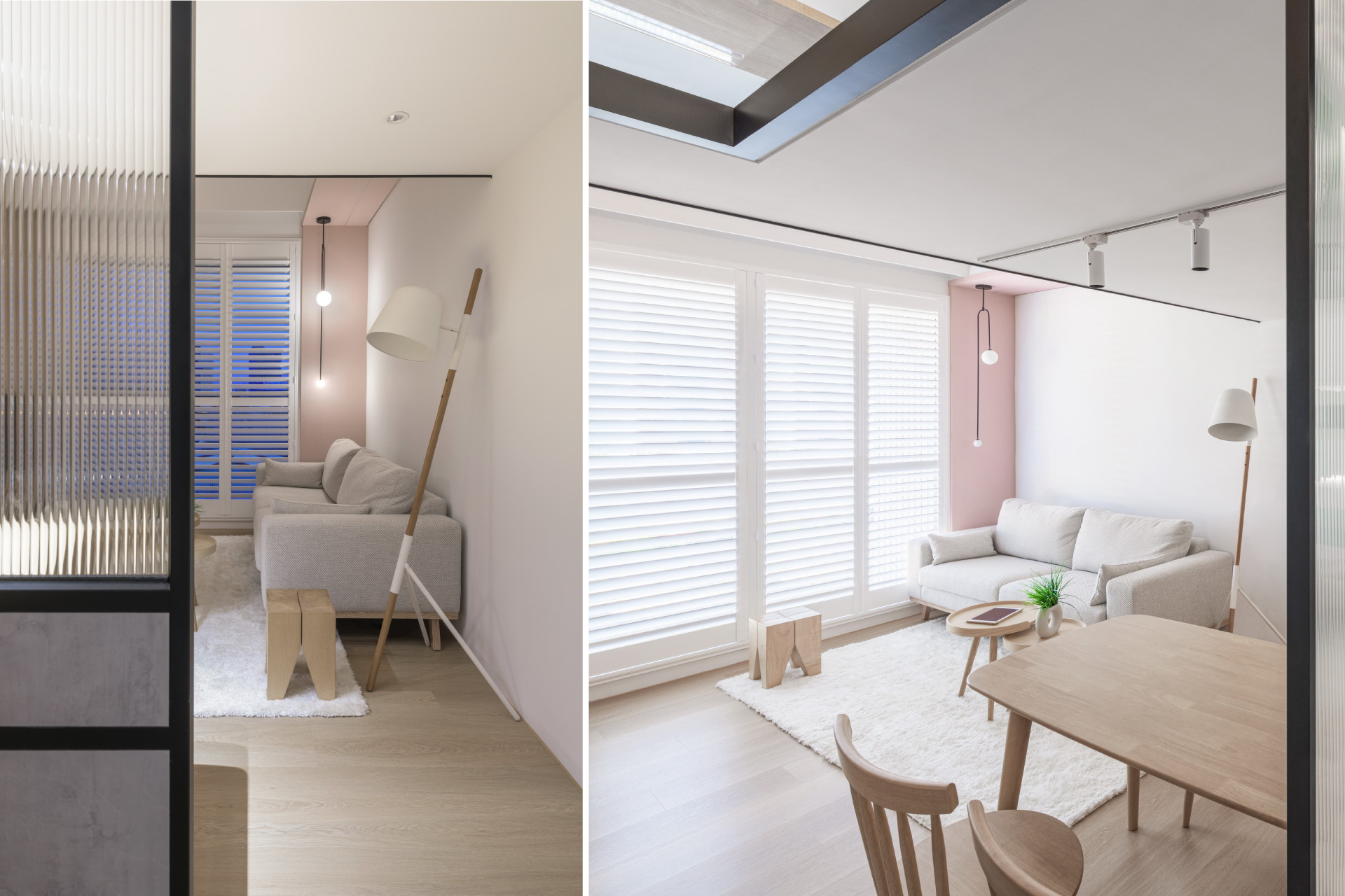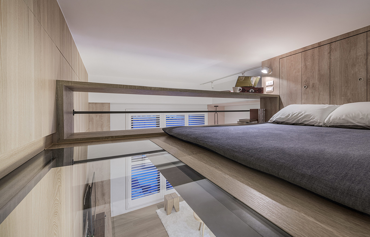 有鑑於實際空間有限,團隊特別於餐廳上方增設1.4米高的夾層,沿餐廳旁的梯階拾級而上,小而精巧的夾層空間成為一個得以閱讀、談天、短暫留宿的多功能場域,兩側牆面以隱藏壁櫃滿足物件收納上的需求。餐廳旁的樓梯在尾端部分與主臥及浴廁出入口相對,藉由梯階平台的高度落差,打造雙向皆可開闔的雙面櫃,讓梯間的正反面都成為視覺上的端景,並能滿足實際功能面的使用。為改善室內中央採光,團隊以長虹玻璃推門為介面,自廚房引入自然光線,在充盈光照之餘亦能保有私隱。同時在夾層地坪臨主臥一側亦以挖空處理,再以玻璃鋪面形成一條帶狀天井,一方面增添下方動線的明亮感,同時亦創造出垂直向度的空間對話。