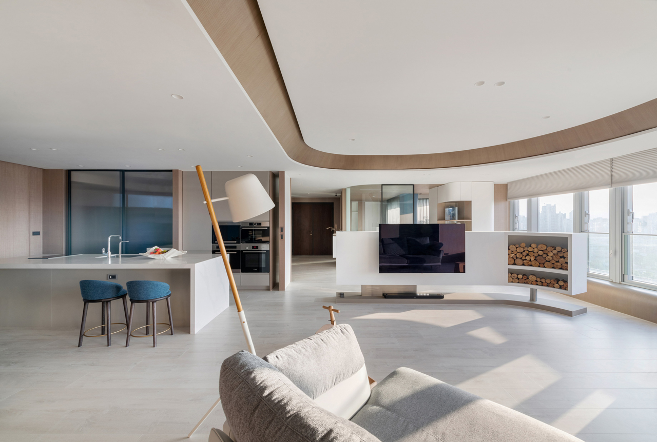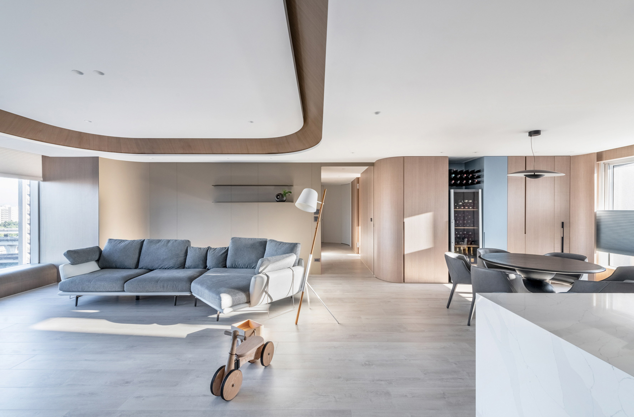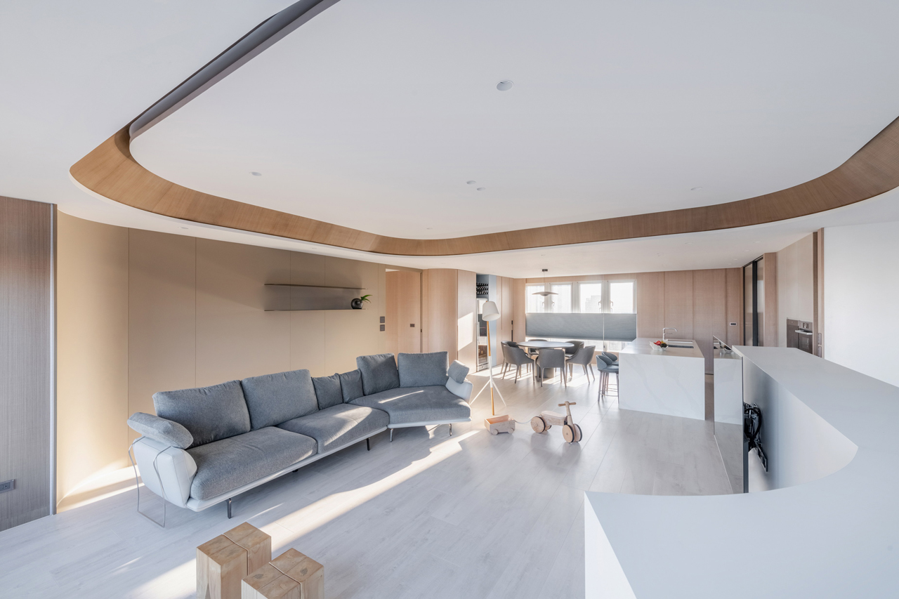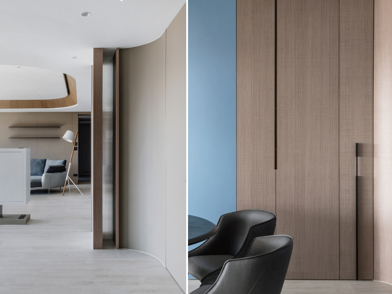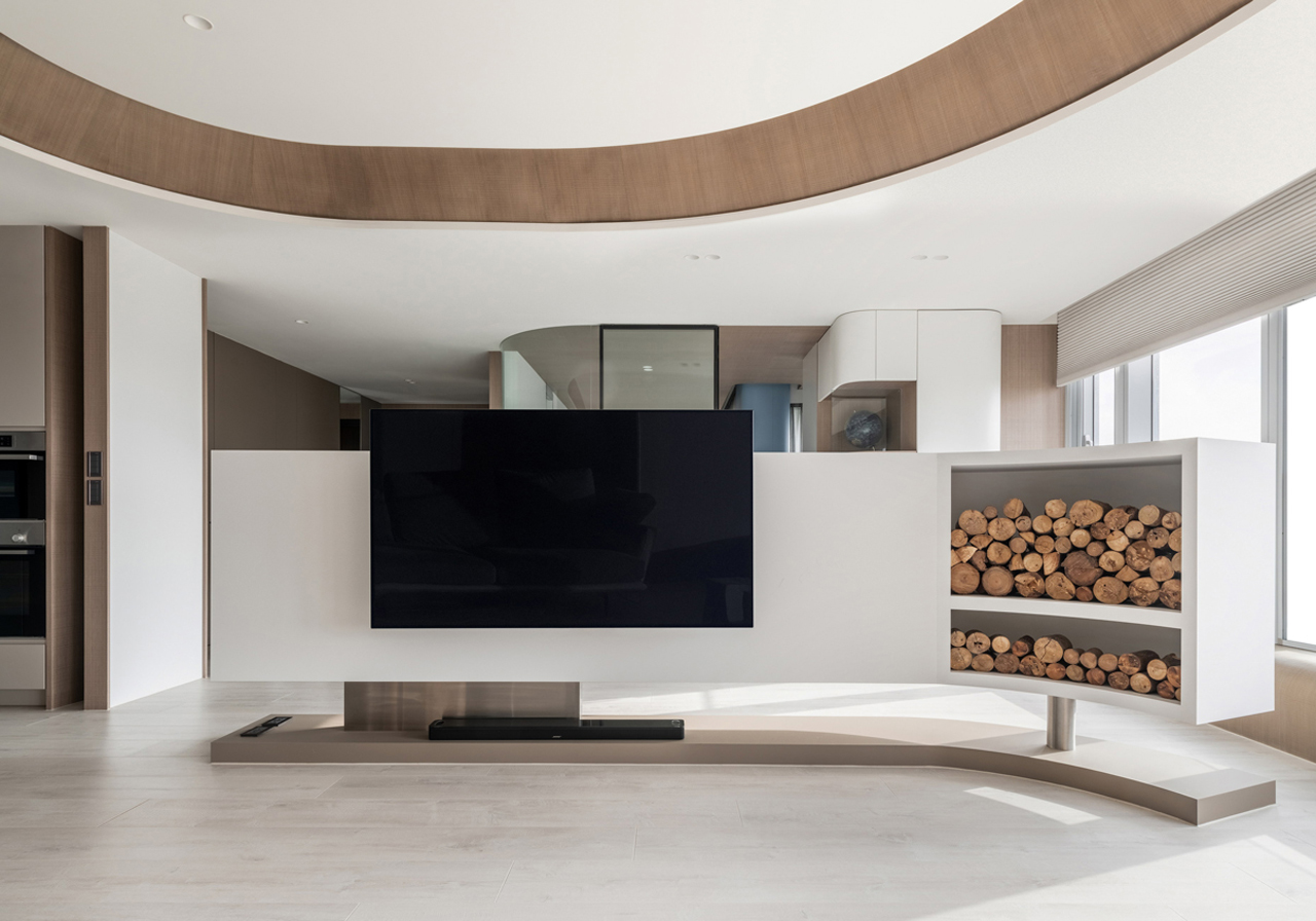 住宅室內為三面採光的設計,單一戶數的設定,讓整體平面呈現方正的佈局。空間規劃大量運用弧形元素,自玄關處踏入住宅開始,便可見以圓弧透明窗作為空間中介的兒童遊戲間,一旁的客廳以弧形電視櫃及沙發,結合天花的星環設計,為空間形塑出環抱的形體意象,身處其中,彷彿就像進入一個小宇宙世界,遠離了現實生活的繁雜事物,在星際間漫遊,那些美好的經歷都被凝縮在這個自在自適的場域中,進而連結對未來生活的嚮往。此外,無論是牆面與牆面,抑或是牆面與天花之間的邊界,同樣都大量採用圓弧語彙設計,藉此在空間中創造更圓滿、包容的視覺感知,並確保孩子們在家中跑跳嬉戲時,能安全無虞而不會因撞到邊角而受傷。