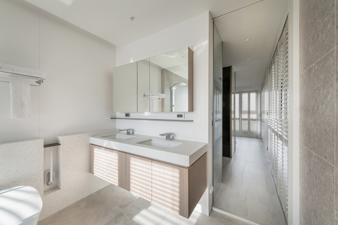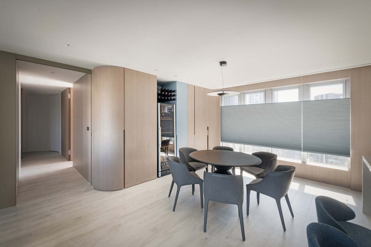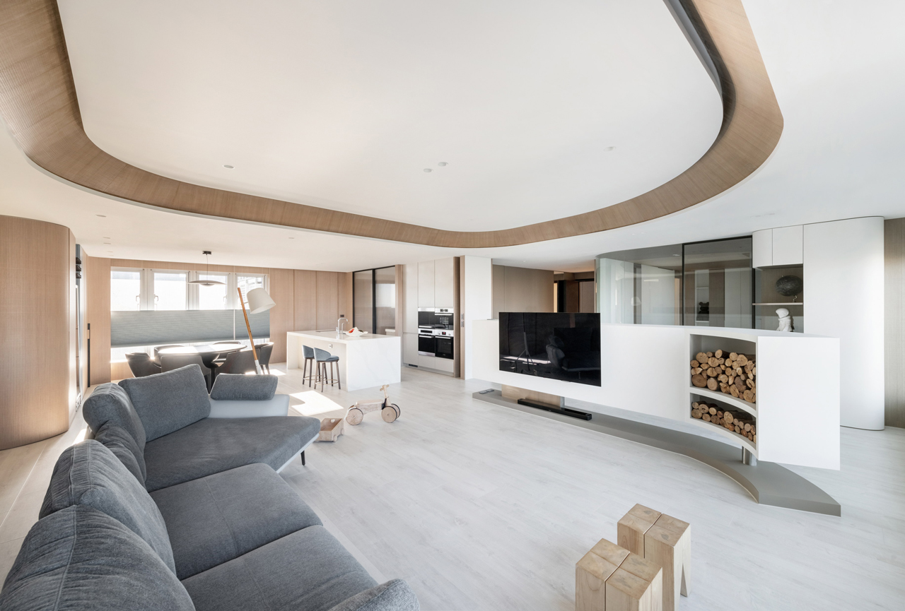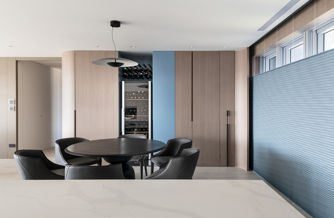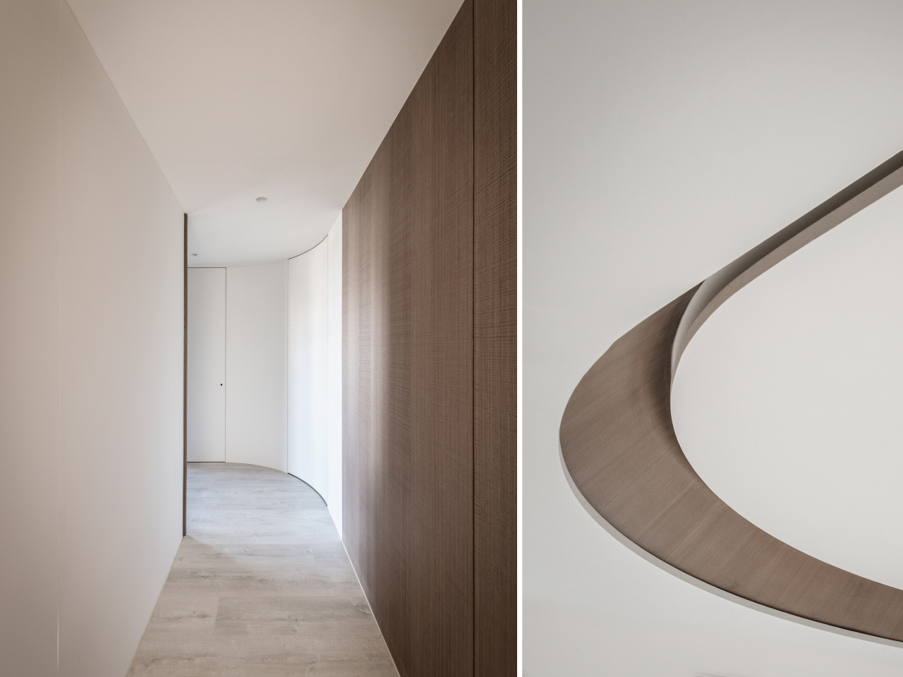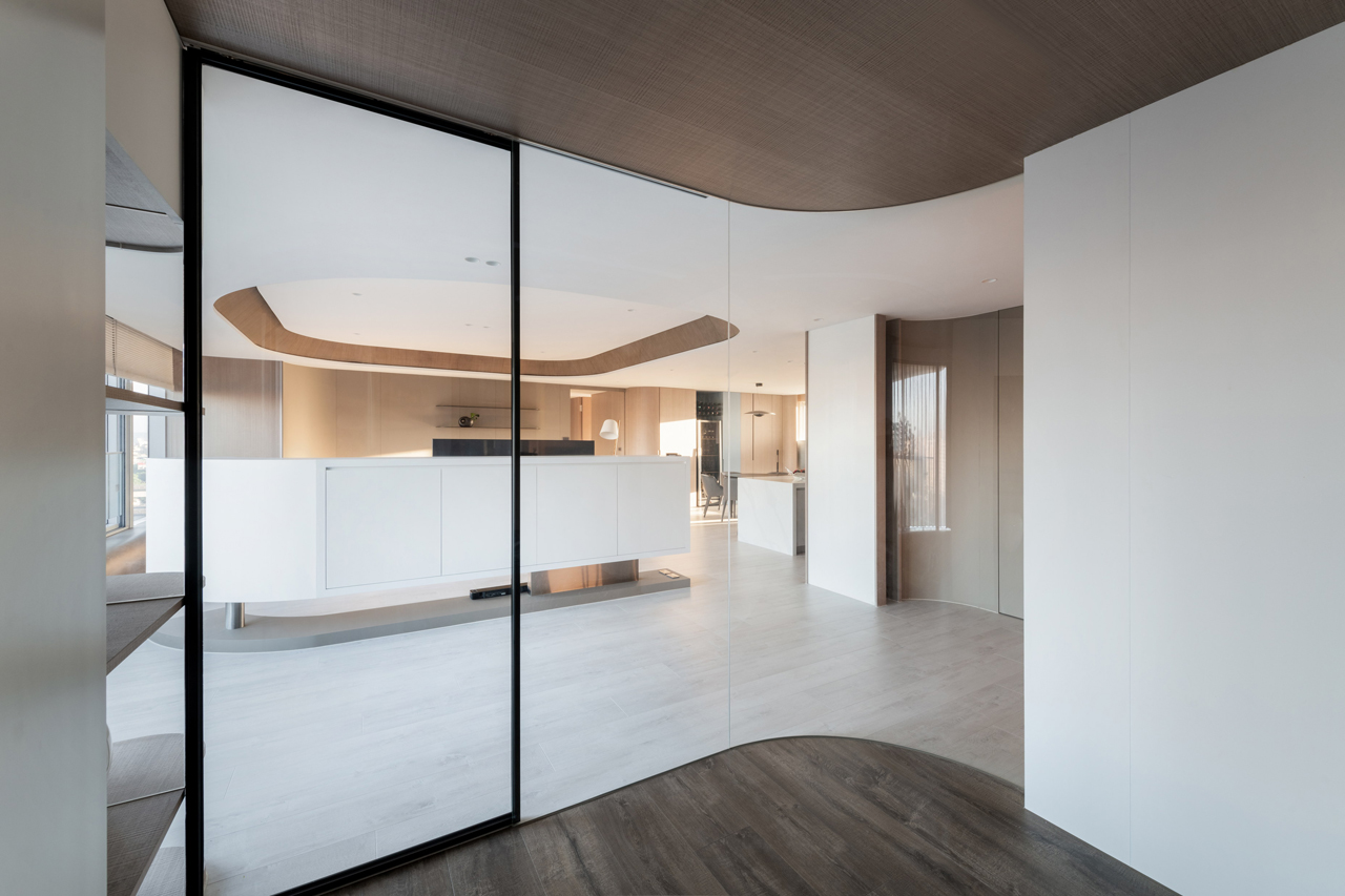 住宅室內為三面採光的設計,單一戶數的設定,讓整體平面呈現方正的佈局。空間規劃大量運用弧形元素,自玄關處踏入住宅開始,便可見以圓弧透明窗作為空間中介的兒童遊戲間,一旁的客廳以弧形電視櫃及沙發,結合天花的星環設計,為空間形塑出環抱的形體意象,身處其中,彷彿就像進入一個小宇宙世界,遠離了現實生活的繁雜事物,在星際間漫遊,那些美好的經歷都被凝縮在這個自在自適的場域中,進而連結對未來生活的嚮往。此外,無論是牆面與牆面,抑或是牆面與天花之間的邊界,同樣都大量採用圓弧語彙設計,藉此在空間中創造更圓滿、包容的視覺感知,並確保孩子們在家中跑跳嬉戲時,能安全無虞而不會因撞到邊角而受傷。