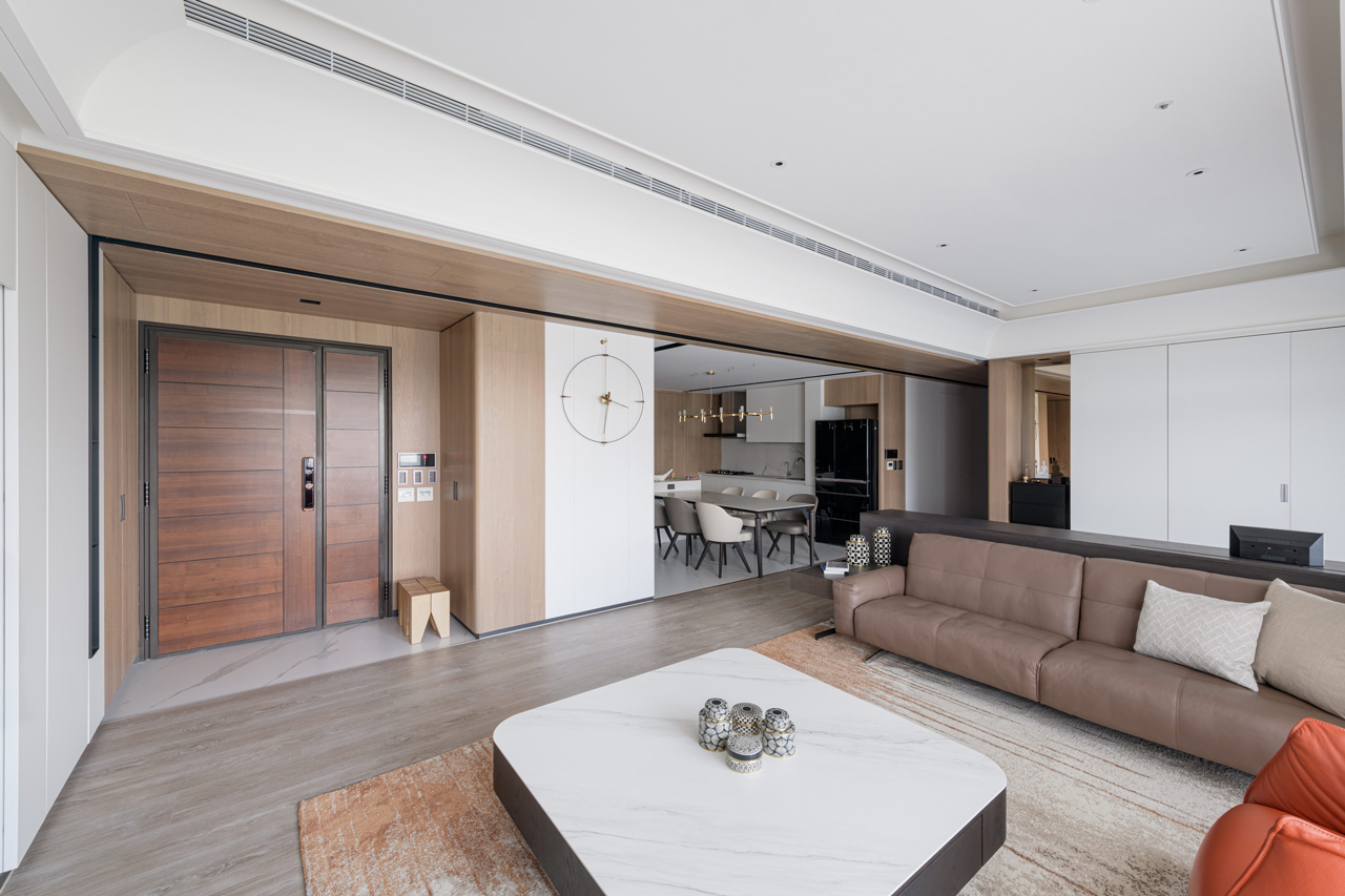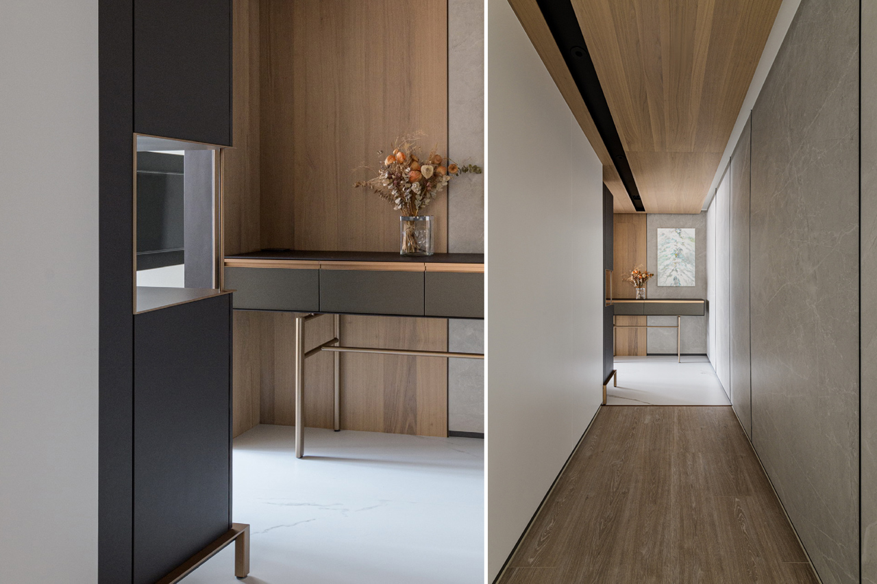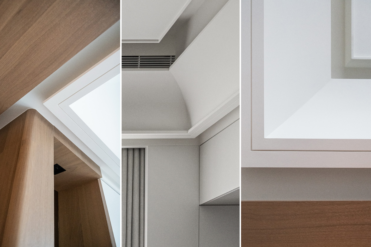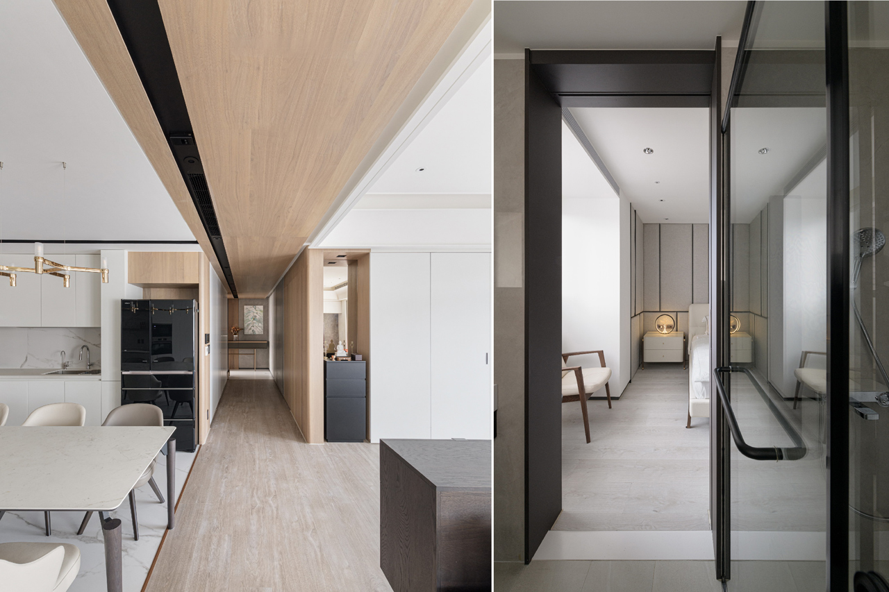 大量的細部工法與異質材料搭接設計亦為本案一大重點,前者體現了室內空間細膩與人性化的一面,後者則做為不同機能領域之間的劃分。在公共區域內連結客廳與餐廳兩者的廊道,團隊藉由不同高程差的天花設計,以多重層次建構一個看似連結,但實則合中有分的隱性空間邊界。在平面佈局上,包括客廳、主臥房、主臥衛浴、孝親房等留白空間皆設有獨立的小玄關,除了作為行進時駐留的轉折之處,也創造層層遞進的空間效果。此外,針對主要機能空間與動線出入口,亦施以弧形收邊的倒角設計,一方面提升長輩在室內活動時的安全性,也可強化柔和、美觀的視覺感受。在空間風格、材料對接等細部設計的精準把控下,成就一座洗鍊、高尚、細緻的質感居所。