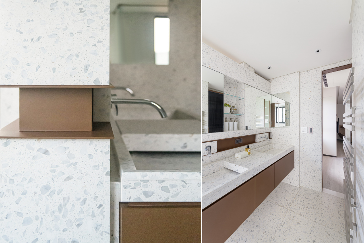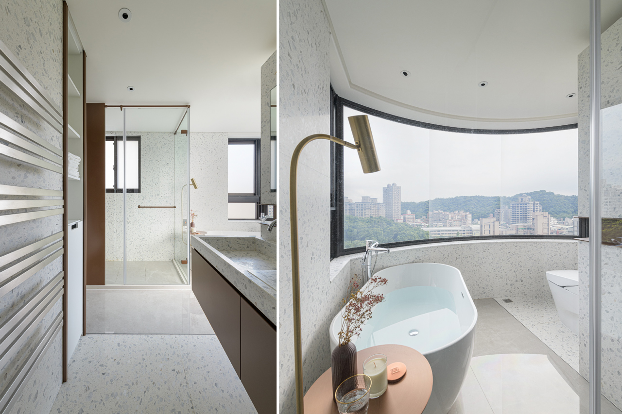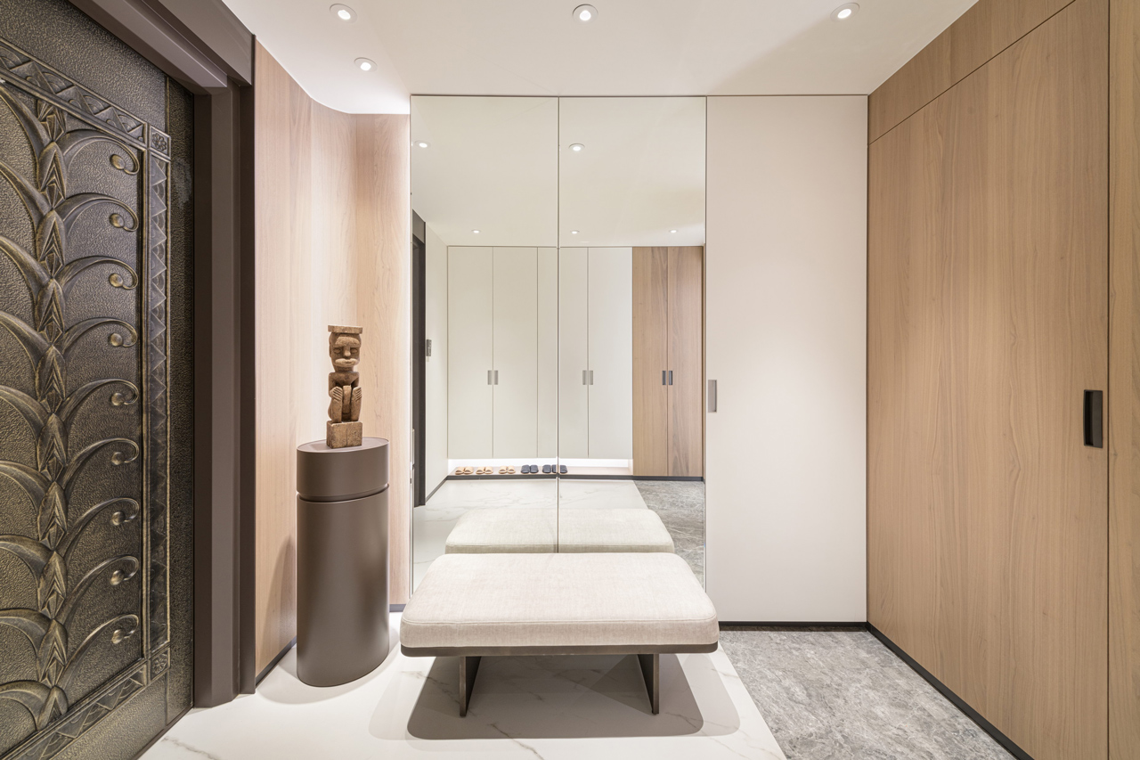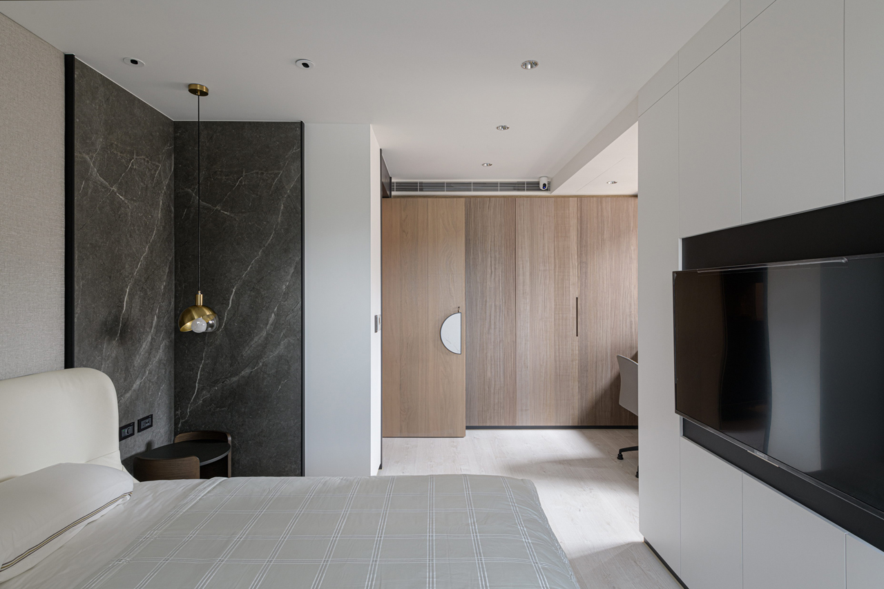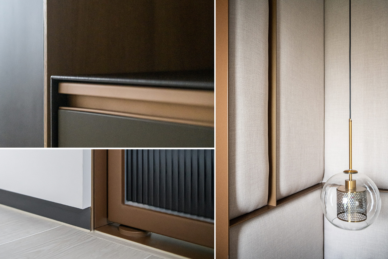 大量的細部工法與異質材料搭接設計亦為本案一大重點,前者體現了室內空間細膩與人性化的一面,後者則做為不同機能領域之間的劃分。在公共區域內連結客廳與餐廳兩者的廊道,團隊藉由不同高程差的天花設計,以多重層次建構一個看似連結,但實則合中有分的隱性空間邊界。在平面佈局上,包括客廳、主臥房、主臥衛浴、孝親房等留白空間皆設有獨立的小玄關,除了作為行進時駐留的轉折之處,也創造層層遞進的空間效果。此外,針對主要機能空間與動線出入口,亦施以弧形收邊的倒角設計,一方面提升長輩在室內活動時的安全性,也可強化柔和、美觀的視覺感受。在空間風格、材料對接等細部設計的精準把控下,成就一座洗鍊、高尚、細緻的質感居所。