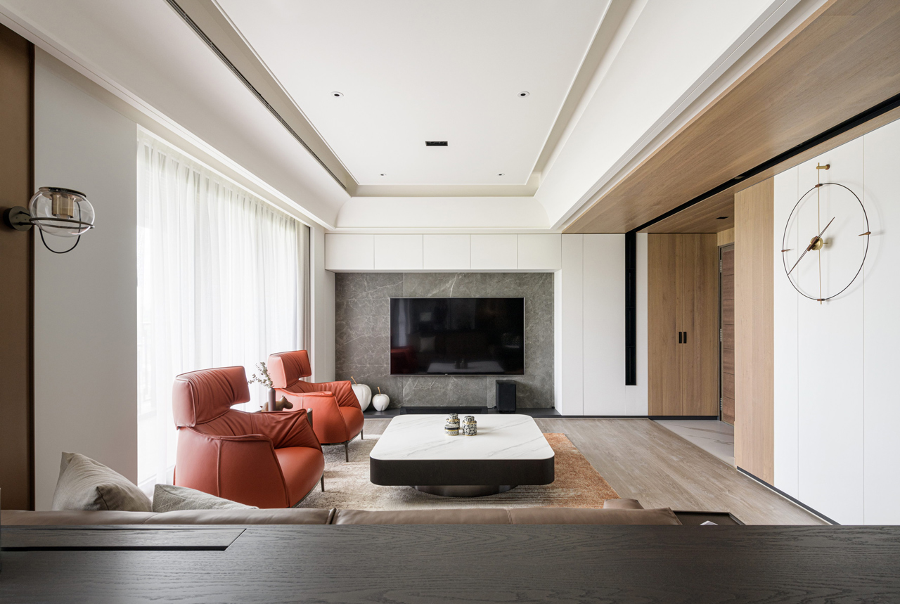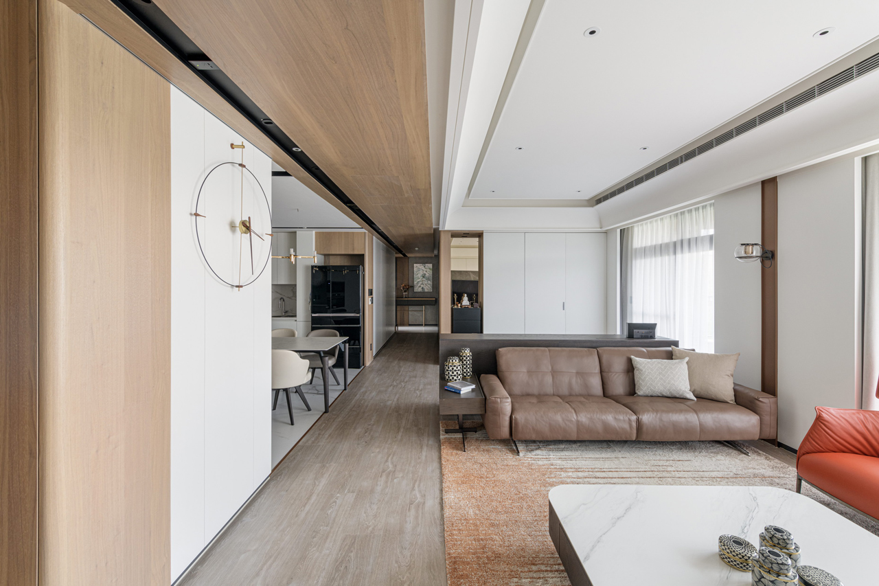 對企業主而言,歷經多年打拼,在準備進入人生下半場的心境轉換之際,能與家人恬居質感居所,認真感知並品味生活,乃是探尋生命本源,找回初衷的第一步。本案為台北內湖核心區的建高層住宅,鄰近滿佈綠植山腳下的一處僻靜社區,身任跨國企業創辦人的屋主夫婦與年邁的母親三人共居於此。住家同時享有市中心便捷的交通與生活機能,又有著宜人的自然山景環繞,在好山好水中打造優質的生活形態。有鑑於屋主期許能從新居營造美好的半退休環境,團隊以開放思維重塑室內,將臥房之外的公共區域全部打開,讓客廳、餐廳、廚房、書房連成一氣,彷彿建構了大型開放空間,即便在寸土寸金的台北都會區內,也能坐擁寬廣視野,與一個重視生活質感、強調優質生活方式的場域。