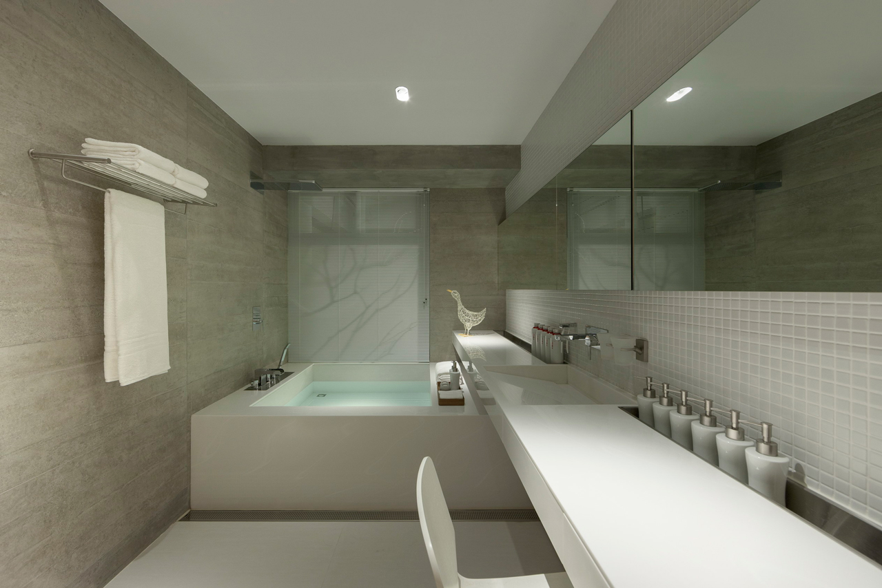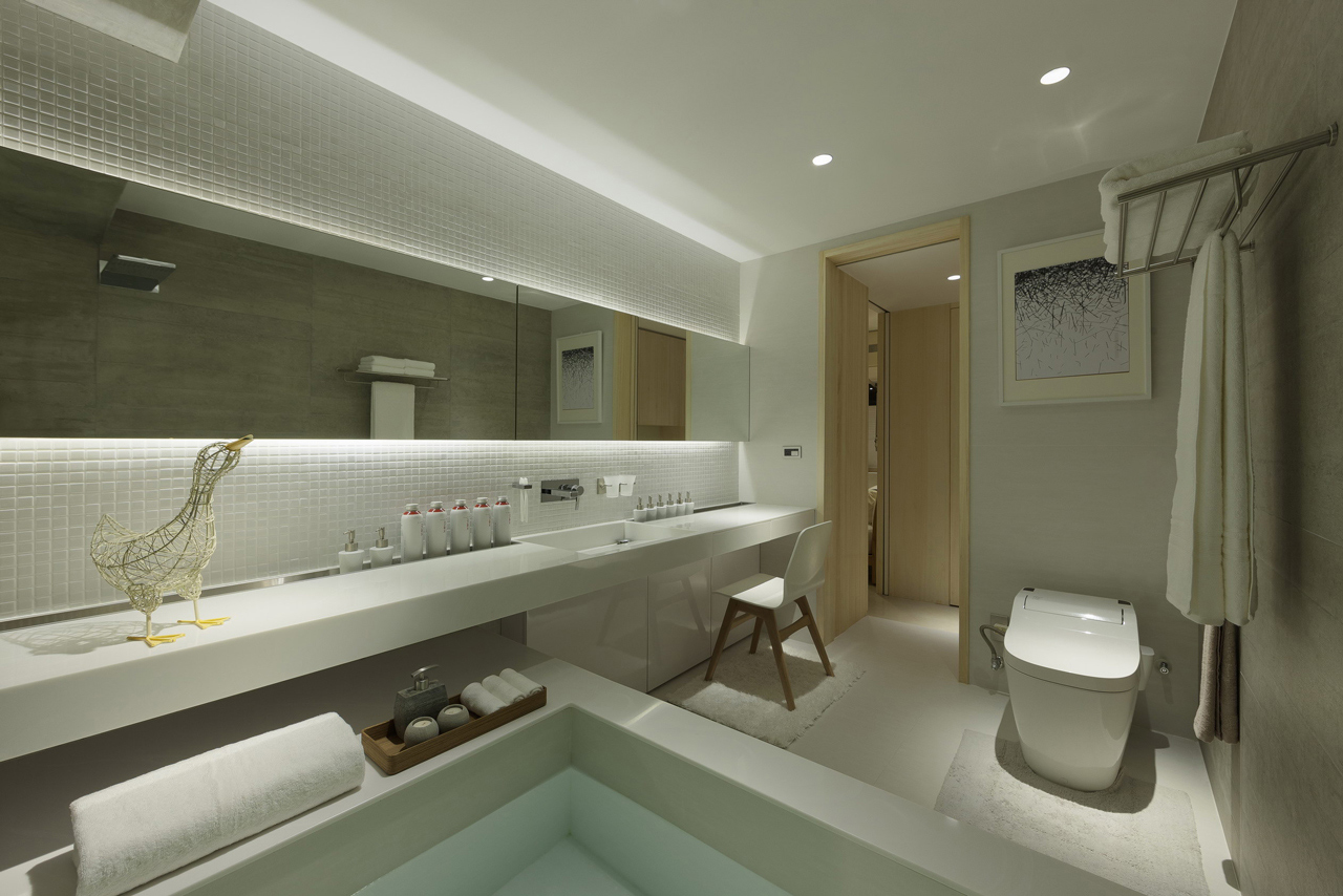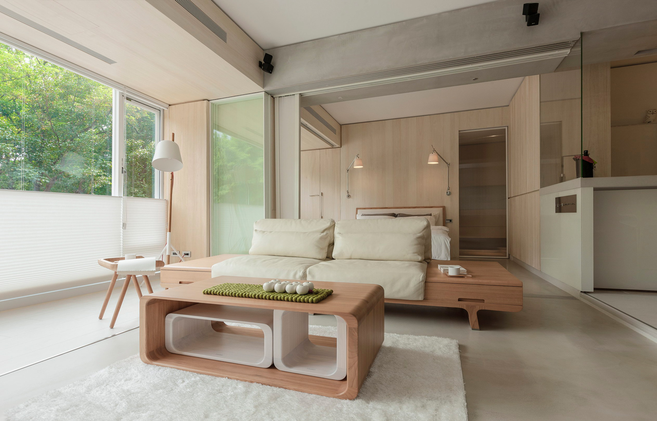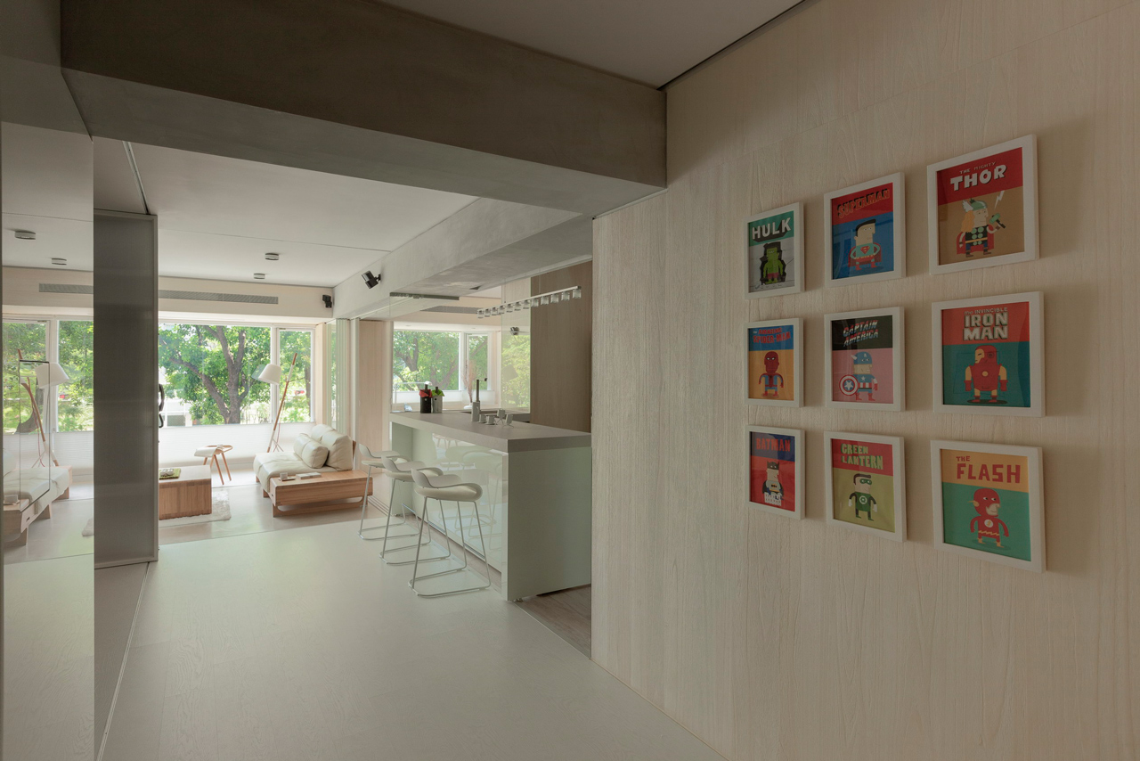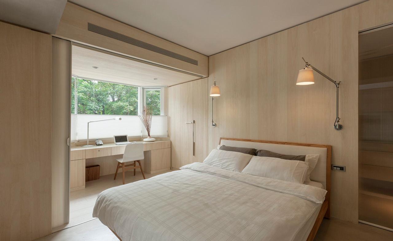 設計規劃上,我們打破傳統以牆面與門板出入口做區分不同使用隔間的作法,轉而以「關聯」來思考空間佈局的可能性,以建構最少壁面牆體為原則,搭配彈性的介面,讓不同空間場域之間得以順應使用者需求進行鏈結與分離,為使用者創造了一個游移漸變的空間經驗,並藉由有限的牆面整合收納機能,減少空間組閣,進一步讓落地窗外的世界漫射入室內,建構了光、影、景三者在場域間的鏈結。