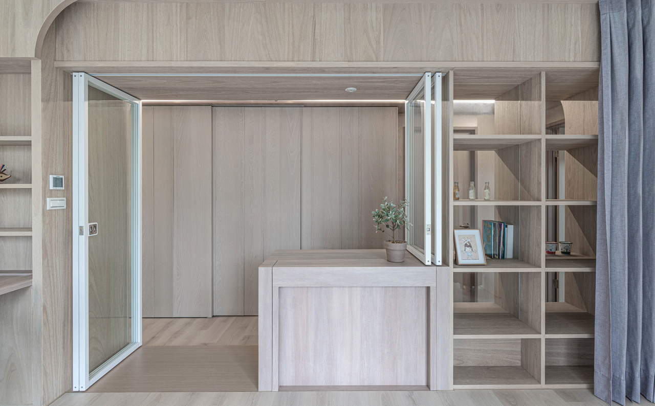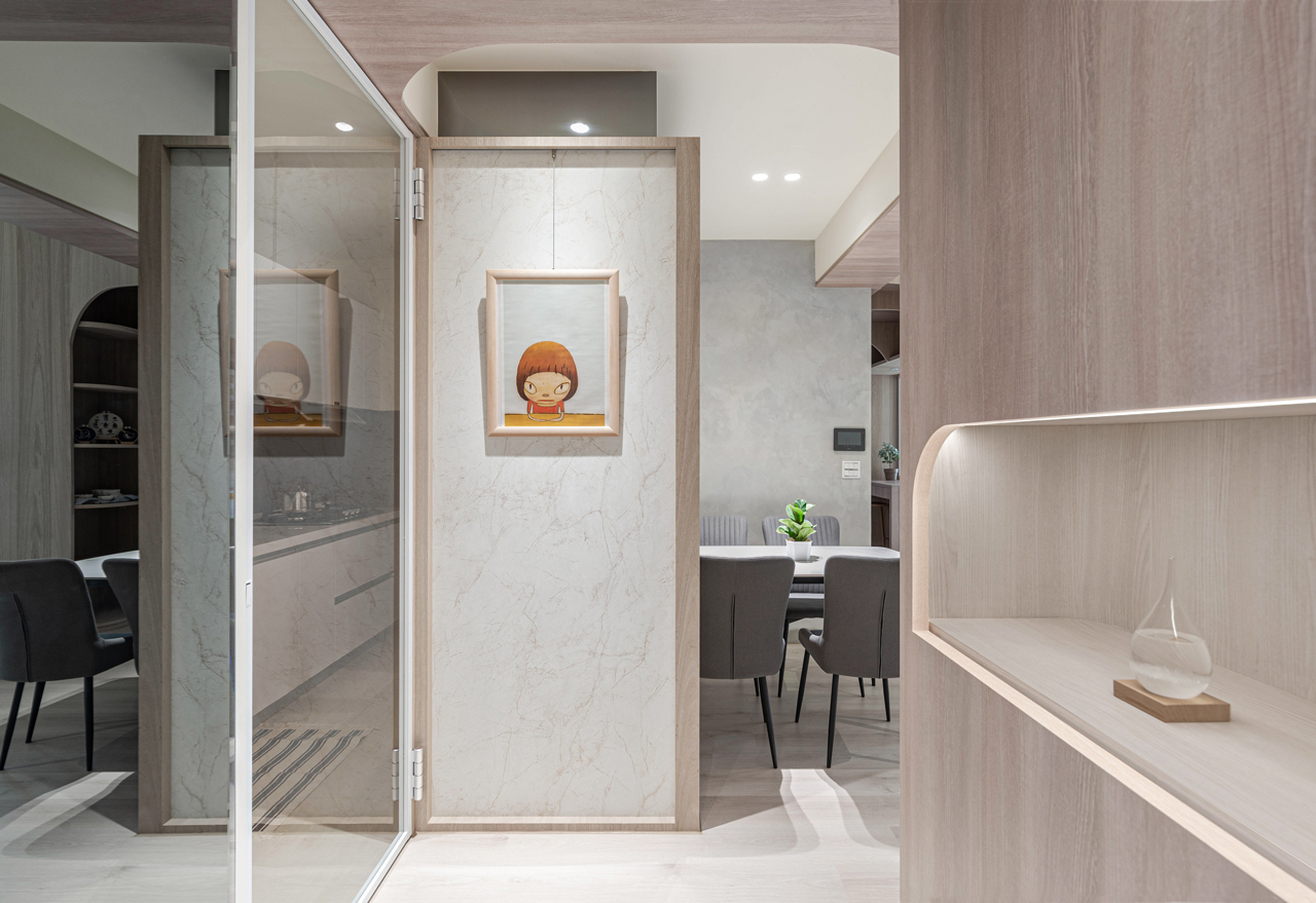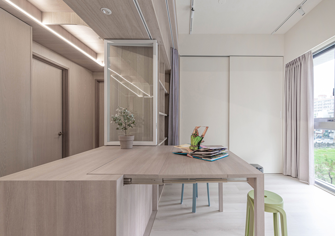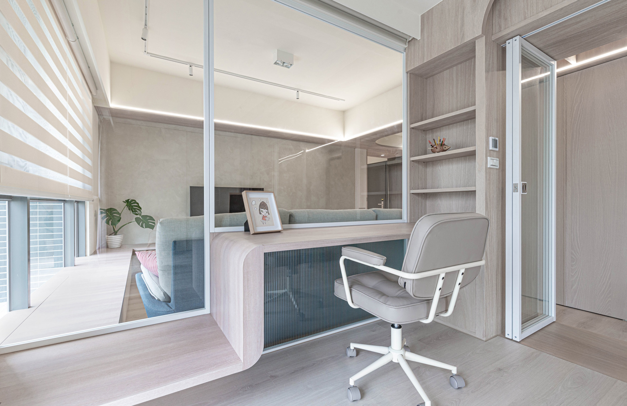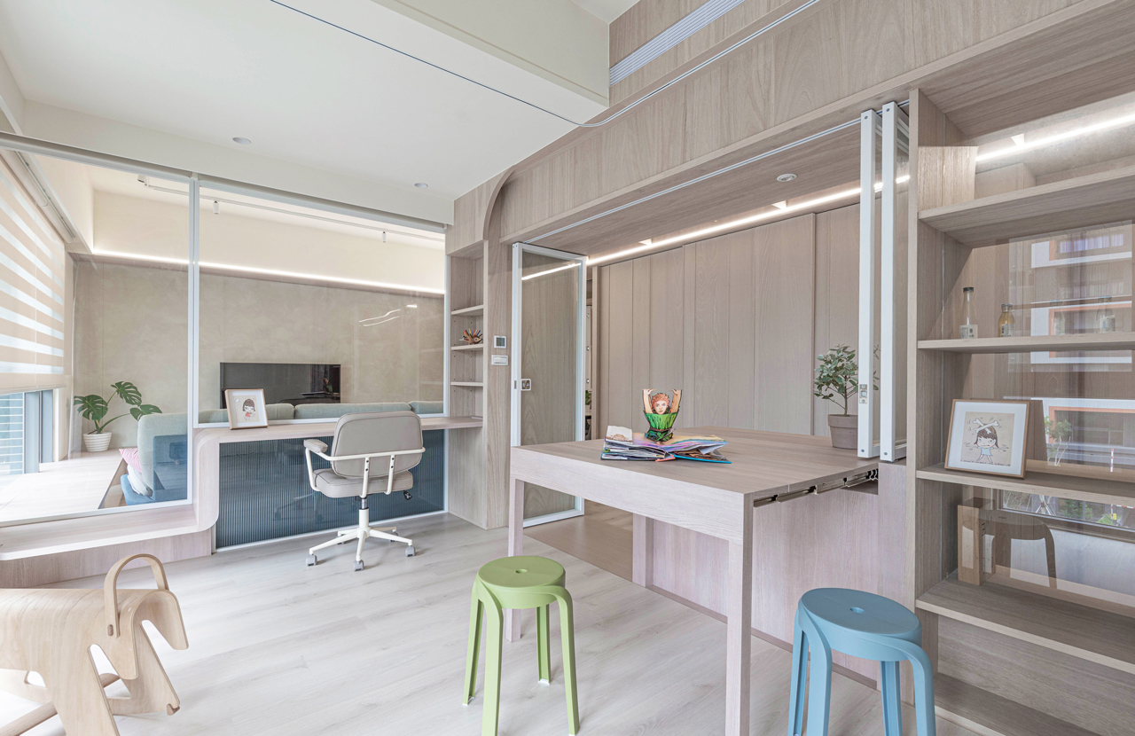 踏入室內,門廳和緊鄰的餐廚區域共構了獨特的公領域範圍,團隊以吧檯結合玻璃折窗形式調整廚房與餐廳之間的既有牆體,讓下廚工作與餐桌用餐得以密切互動,除了建構更開闊的場域連結,亦為玄關塑造出具緩衝區隔功能的端景牆。結合多重使用需求設計的主動線廊道與書房為住宅的另一亮點,前者以兩側牆體內退的手法拉大其尺度與空間感,並在180公分寬的動線中隱藏大量收納壁櫃,後者則以玻璃為介面,藉由其通透質地,讓光線得以充盈於室,形成一個「會呼吸的盒子」。書房內考量男女主人與孩子的不同使用狀態,包含辦公、手作、繪畫、遊戲等,透過可開闔的長桌與玻璃折窗增進使用彈性,開啟時長廊可作為擴大的工作區延伸,閉合時亦可作為獨立私密的臥房使用,使書房成為家人對內互動、交流的主要核心。