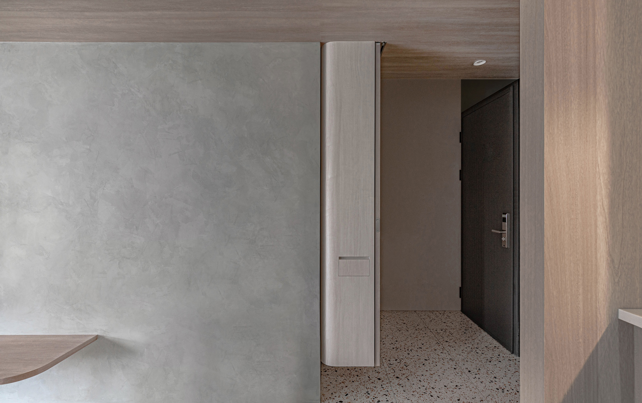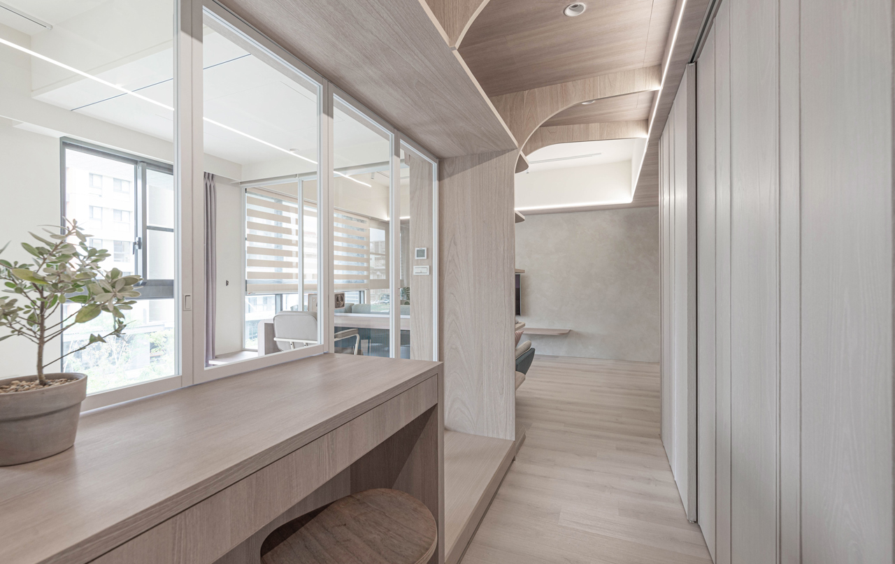 室內整體以木質素材的壁面、平台與地坪營造自然、溫潤的家宅氛圍,輔以灰色特殊漆材質及簡約白牆、天花的搭配點綴,打造明亮、質樸的生活情境。空間規劃上透過天花與平台、上與下的平行串聯延伸,將電視櫃、窗台臥榻、沙發串連在一塊,也讓玄關、餐廳、客廳、書房等不同公私領域,透過水平向度的軸向性連接與通透的室內窗,形構出可互動對話的居家場域。在牆角、壁櫃、天花等壁面接合處,運用大量圓弧語彙的半圓、拱圈造型,以極具包容感的彎角與倒角收邊,在創造軟性柔和的視覺審美之餘,也讓孩子在成長過程中能無拘無束地自在奔跑、跳躍,安全從事娛樂、遊憩、運動。