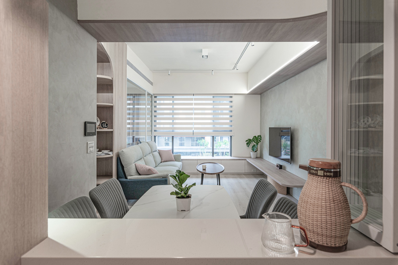對應當代人多元、異質,強調「斜槓」的工作形態,人們對空間的使用方式與居住的基本認知有了全新想像,並影響當代住宅的構成與運用模式,展現出不同於傳統公私領域分明、空間機能彼此獨立的家居規劃。本案位於台南永康,屋主是初為人父人母的新手爸媽,作為夫婦倆與年幼孩子共同生活的場域,在室內坪數面積有限的住宅內,藉由模糊邊界、空間延伸的理念設計,開放式平面的佈局設定,巧妙地將當代都會對日常生活的體驗思維融入其中,讓「家」能回應不同居家成員在工作、生活、學習、成長等不同面向的需求,以多樣化、可彈性變動調整的使用模式提升坪效,創造小而溫馨、具多重功能導向的宜人居所。