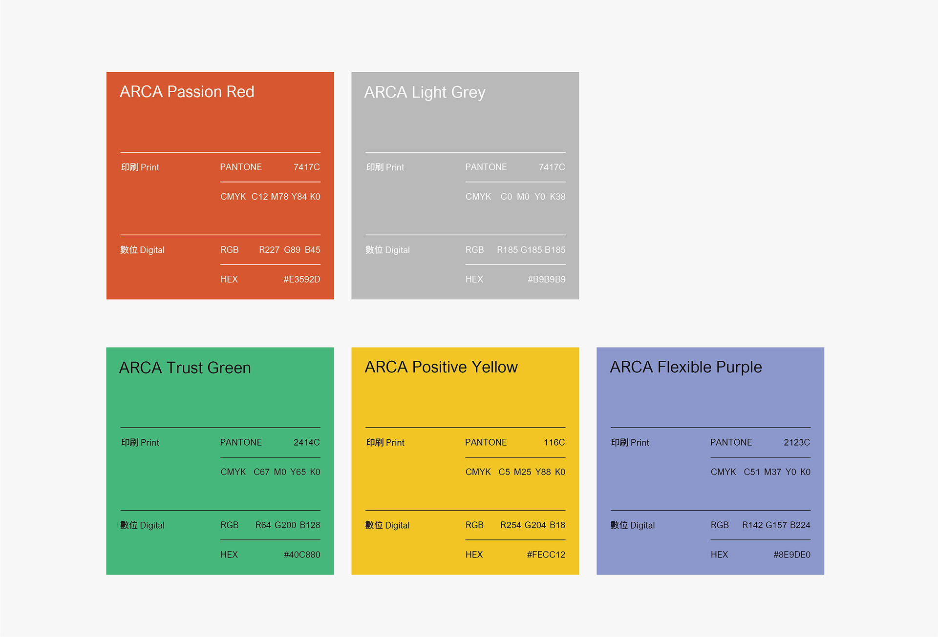 ARCA的品牌精神相較其他金屬網公司,更具親和力與軟性特質。我們以「設計師的夥伴」為主軸,挑選出五種帶有活潑、具啟發性的色彩。