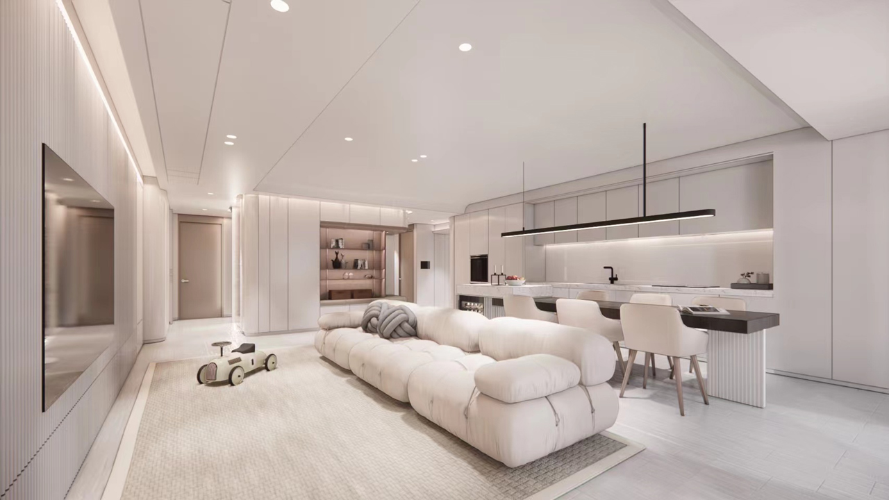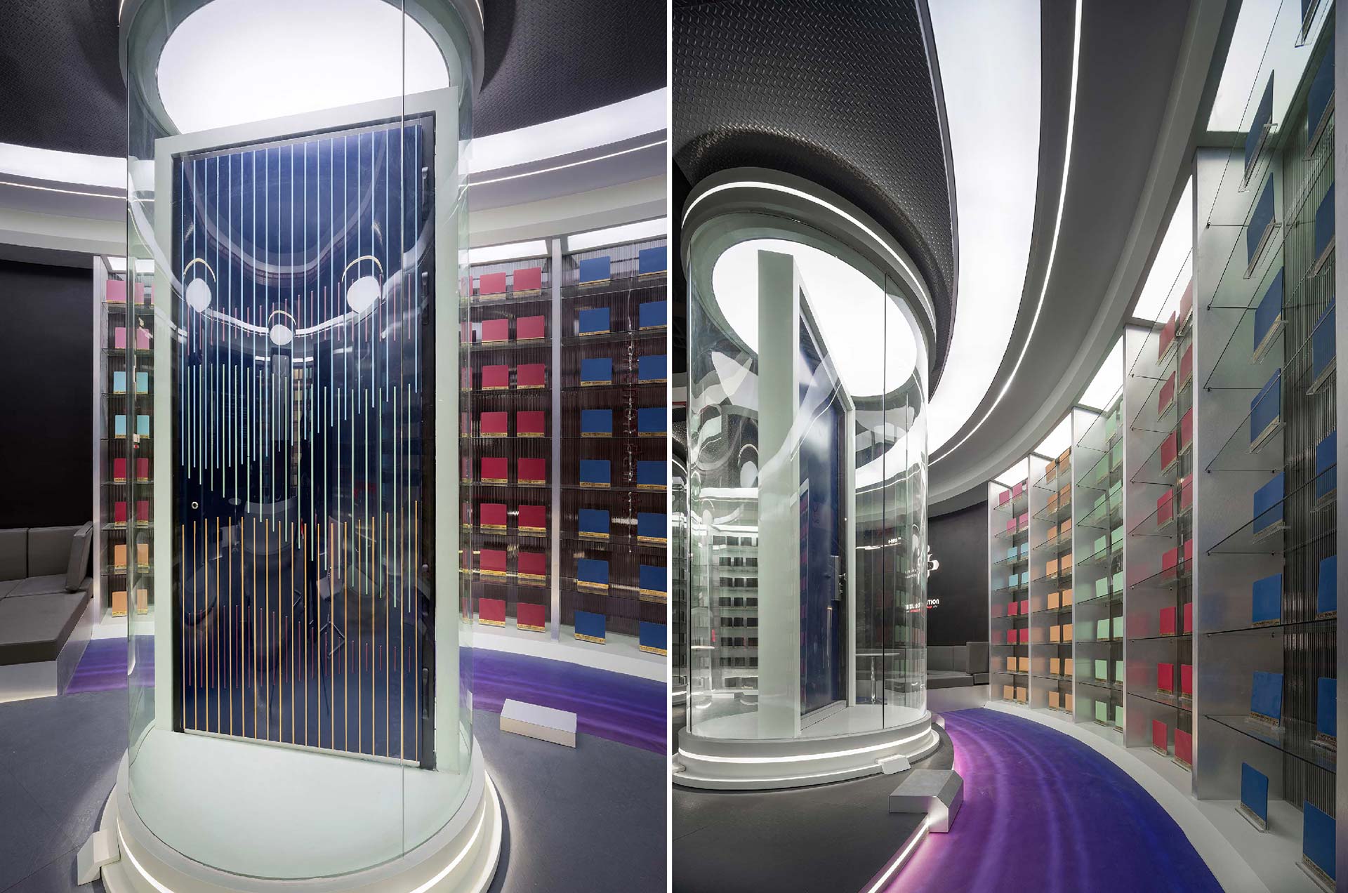 此款設計主要以運動中的韻律感與波動為基礎來增強視覺性,具有明顯的三維立體金屬條,其靈感源自海上運動者乘風破浪,在波光粼粼海面迎向層層浪濤,運動者的身體與海洋的波浪靈活互動,如同門把設計,門框的醒目飾面更能呈現個性訂製的自我時尚,與獨特的門板內層皆採用獨特的藏青藍金屬漆色,與飾面設計相得益彰。