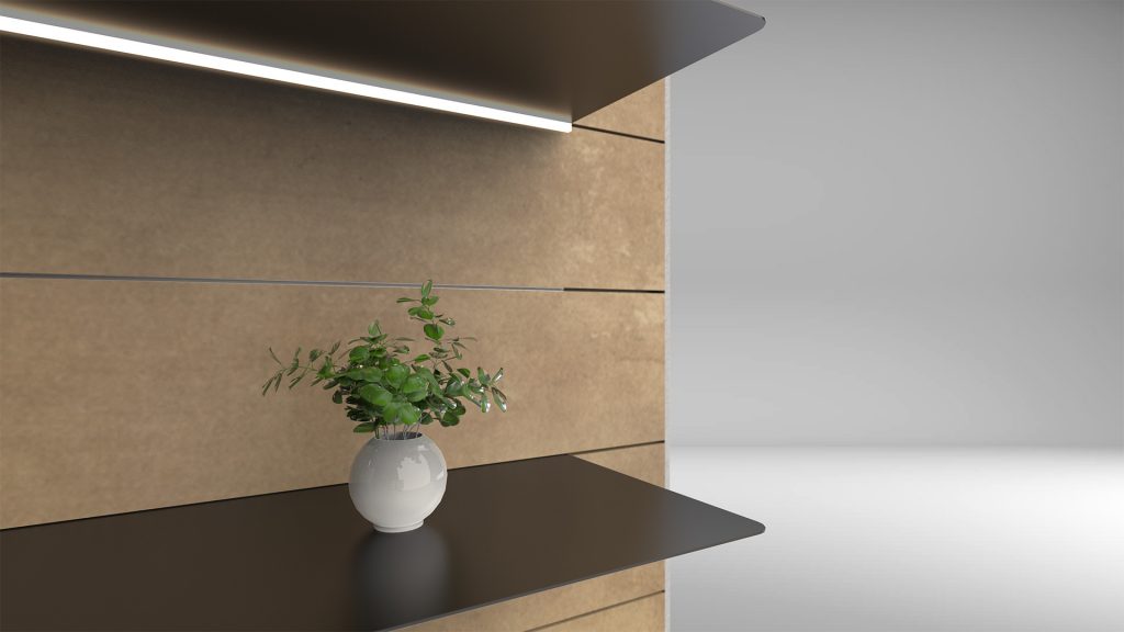 - 複合式配件層架:以橫向插入組合的開放櫃體,上方可供置物,下方則施以嵌燈。並設置插座連接以供日常電器使用。