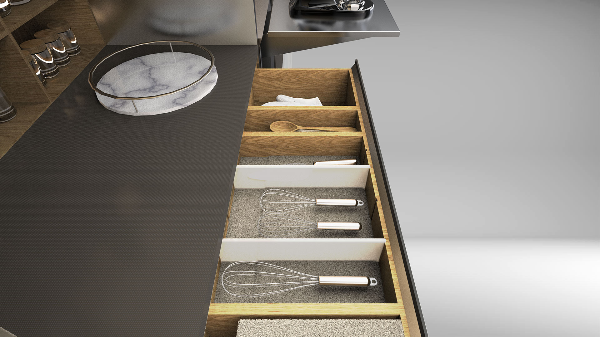 - 隱藏式按壓收納櫃:櫃體下方的收納系統將瓶瓶罐罐、刀叉筷匙都歸納於內,並以按壓式設計美化視覺。