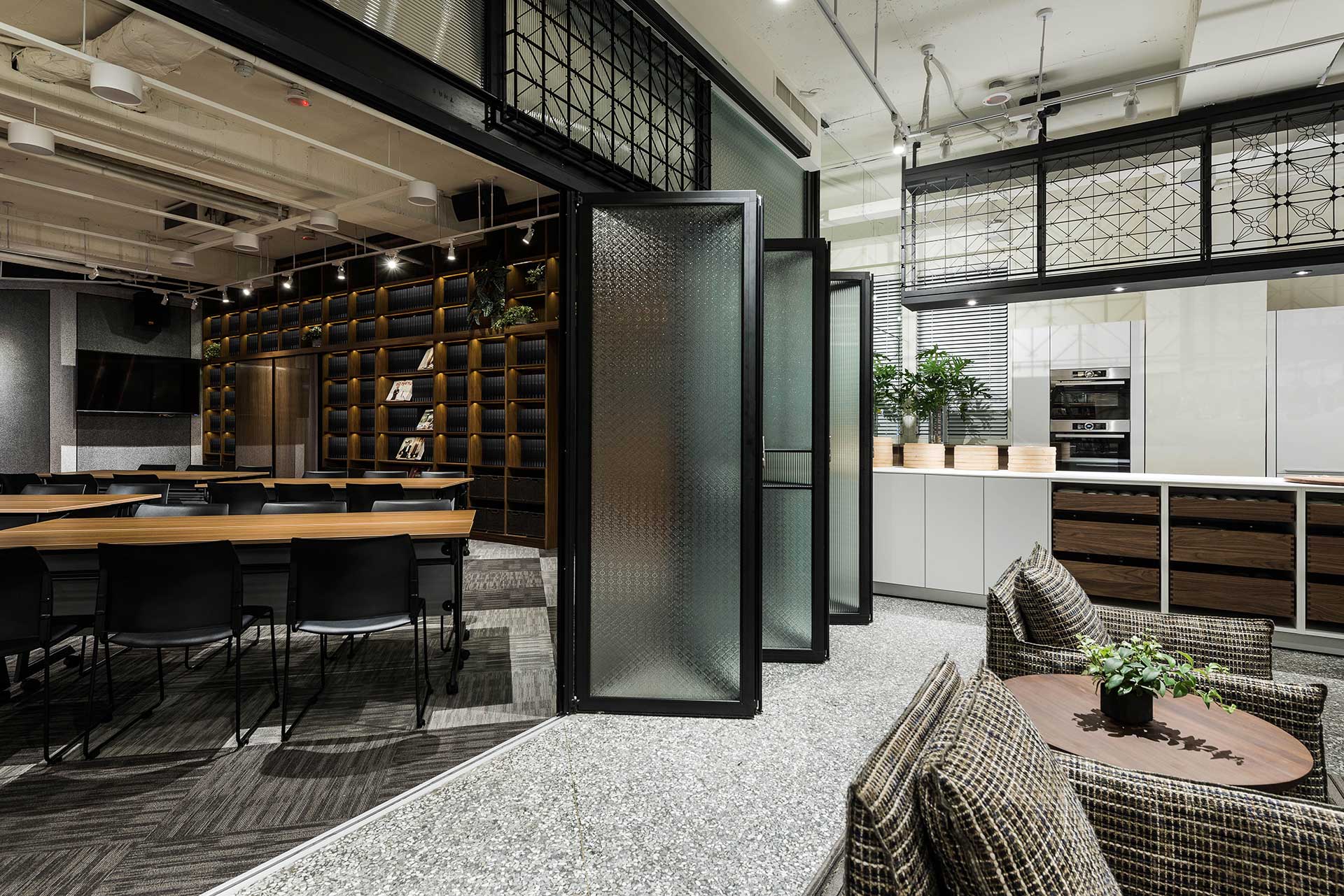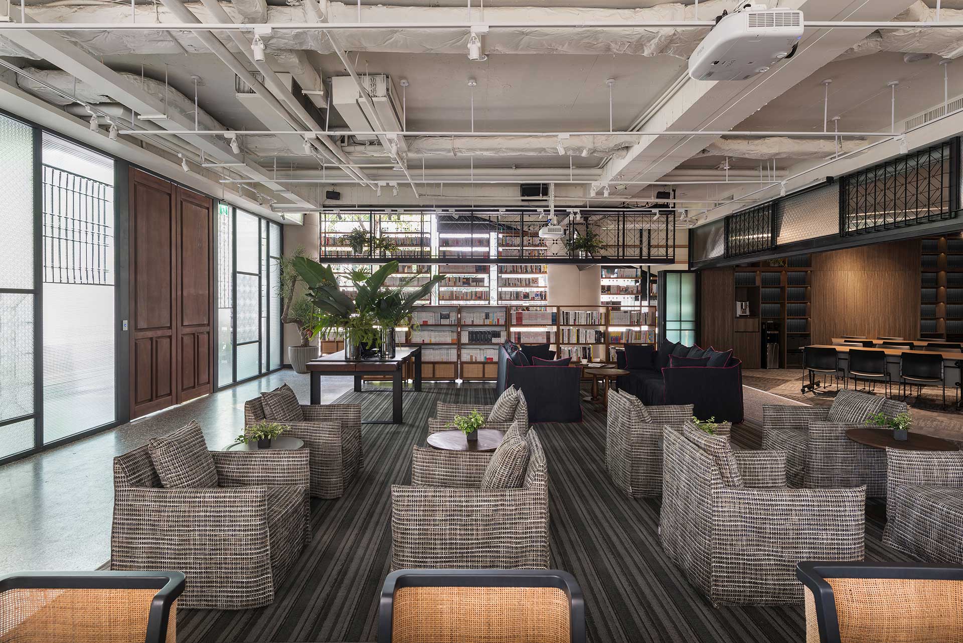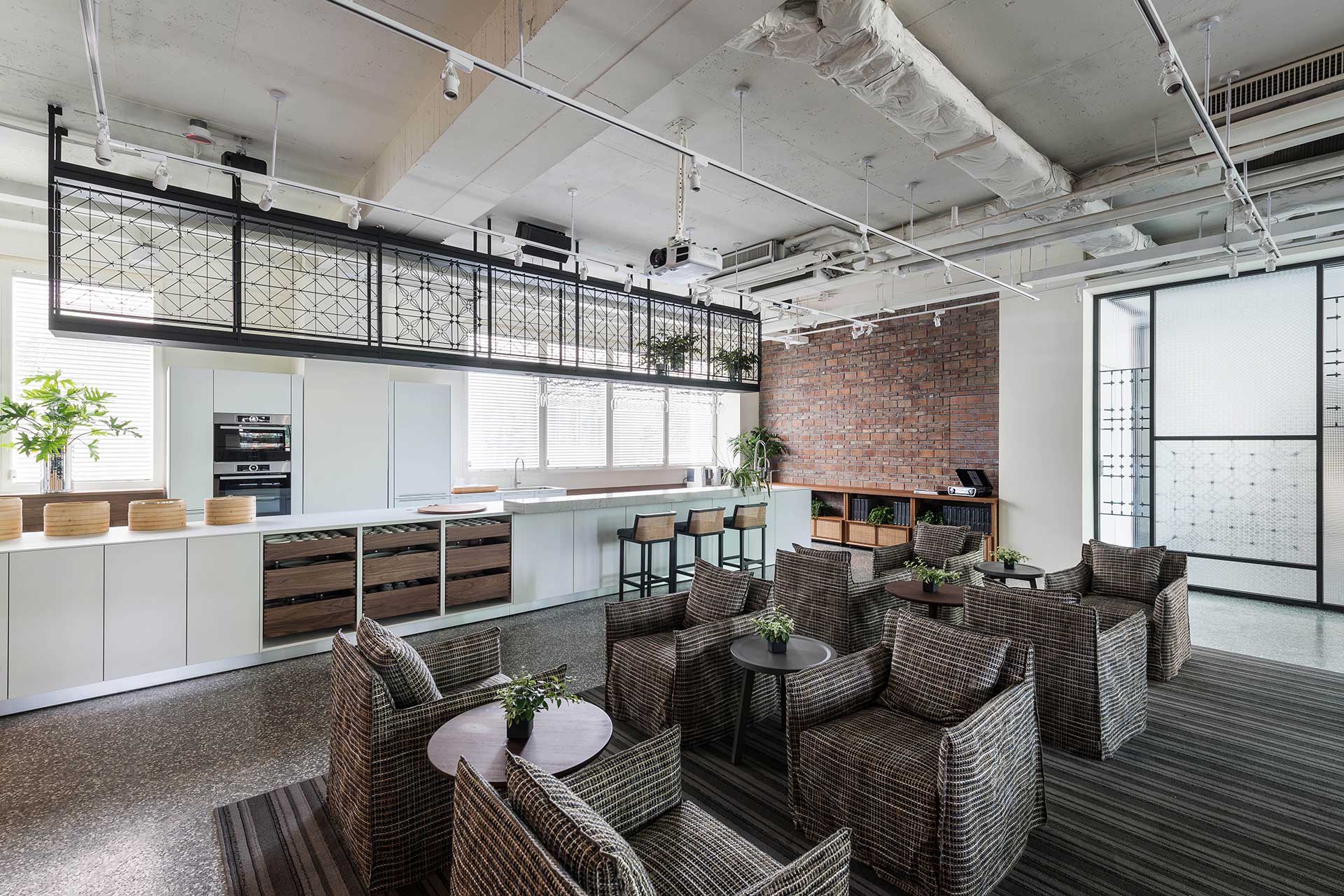 With regards to this iconic publishing corporation, the design was to create a charming ambiance of knowledge, life and aesthetics of Taiwan in this office through its unique traditional building materials and techniques. As surrounded by ample tropical plantation and flora, the spacious interior comes to symbolize the vibrancy and freedom of the open era. With the traditional Hokkien-style red bricks, pebbles, and blue-dyed colors and other materials, along with mixed-technique elevations complemented by traditional metal grille, embossed glass screen, and rectangular Taiwan eucalyptus long table, and wooden door, with rich colors, materials and techniques, as the metaphor of the enriched history of architectural aesthetics, and the spirit of the unique craftsmanship of the craft era.