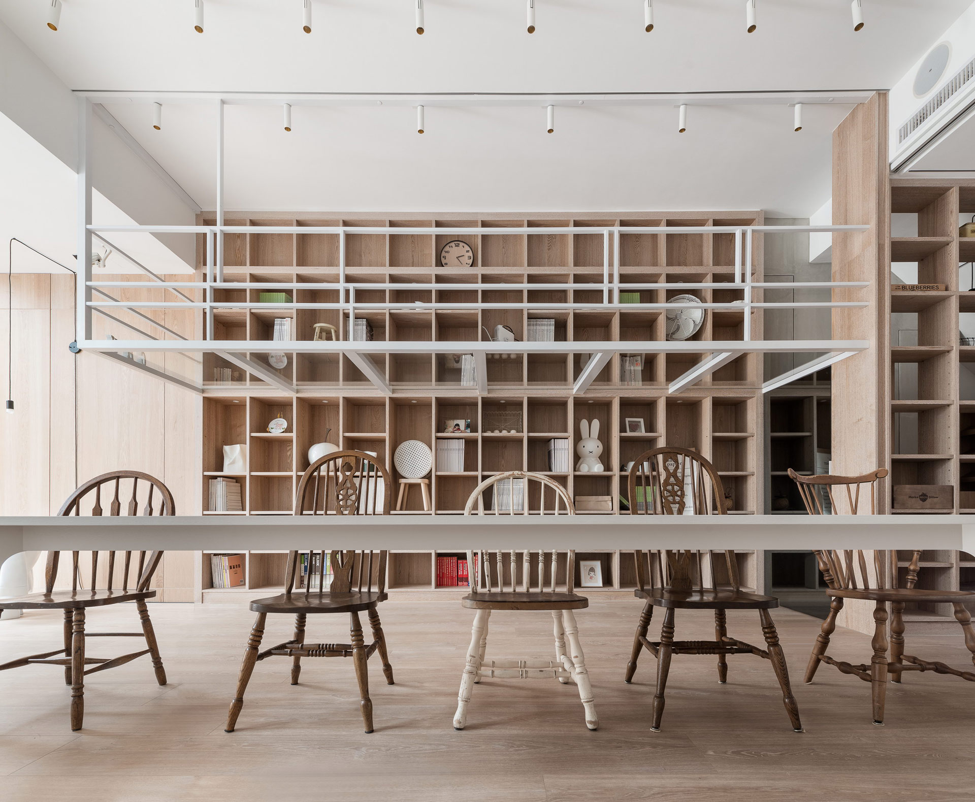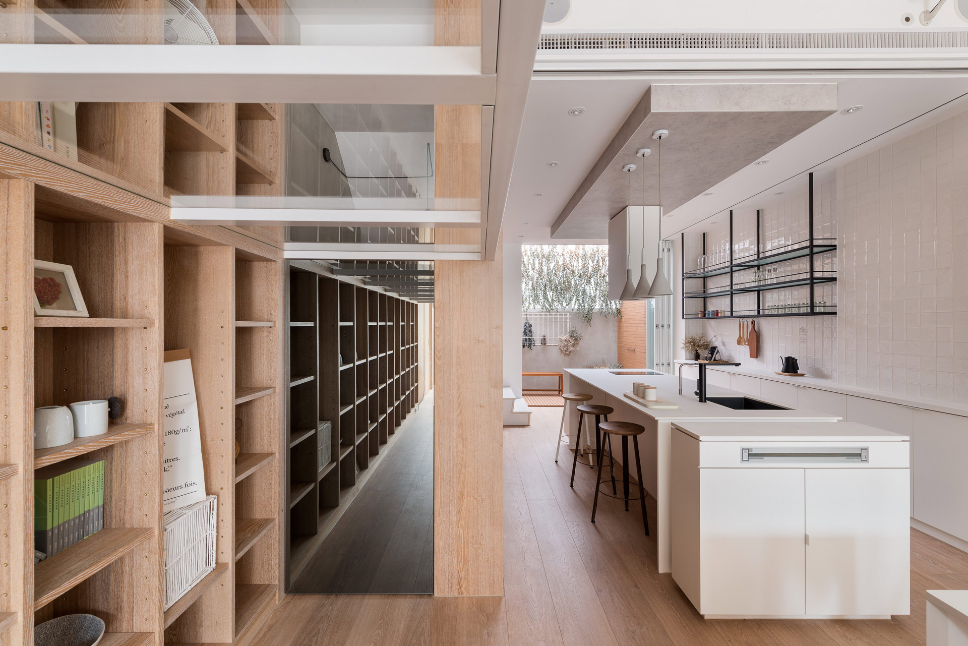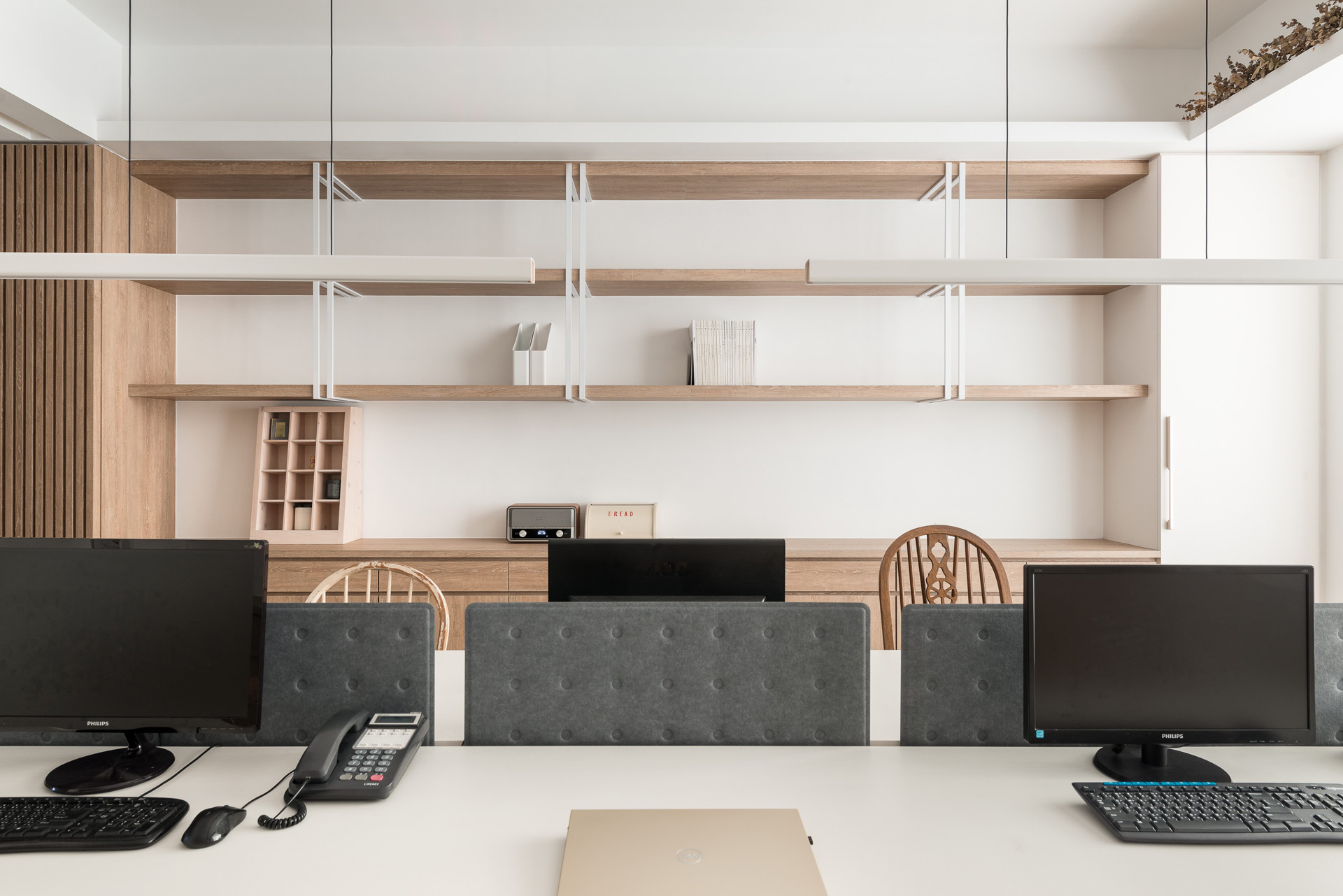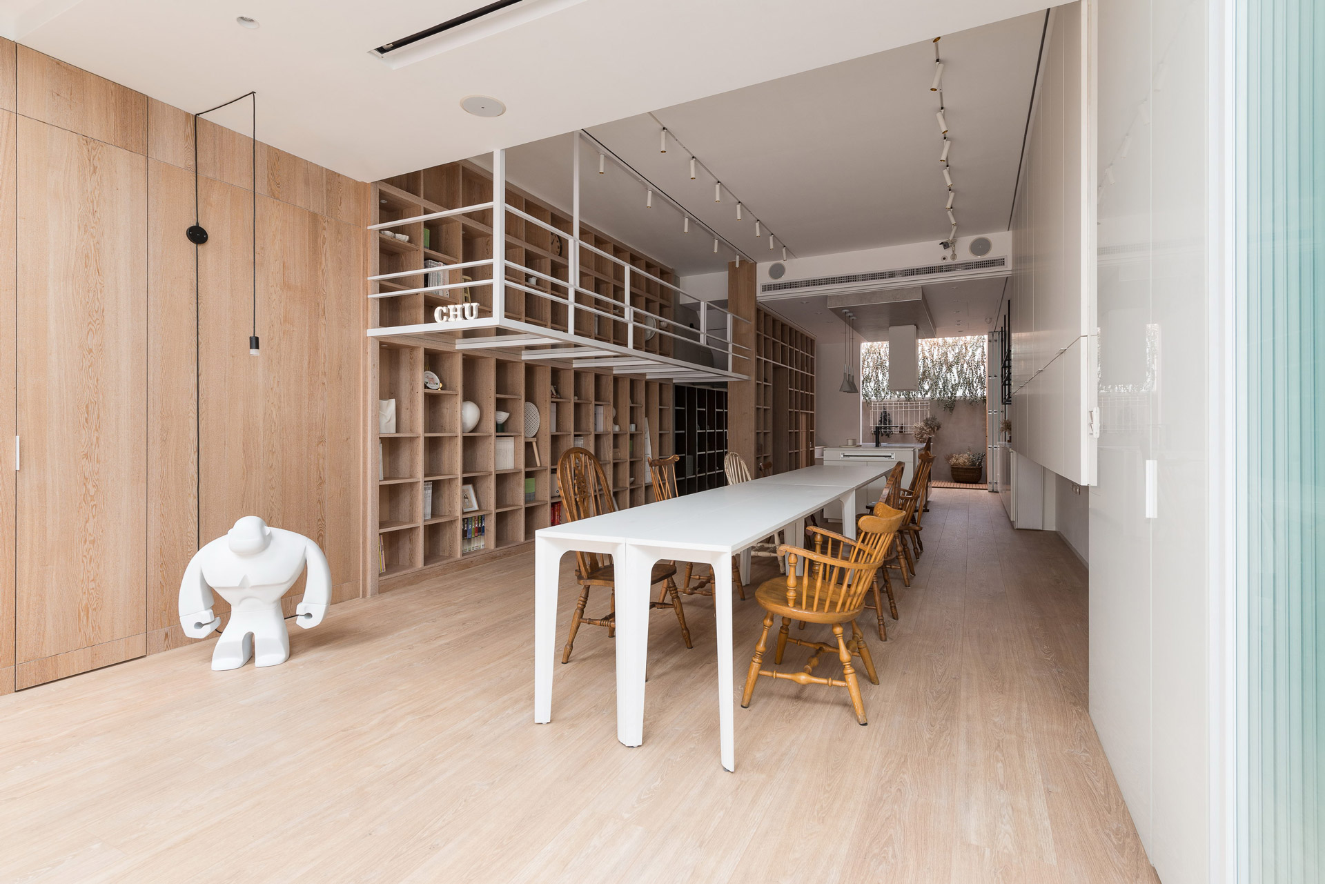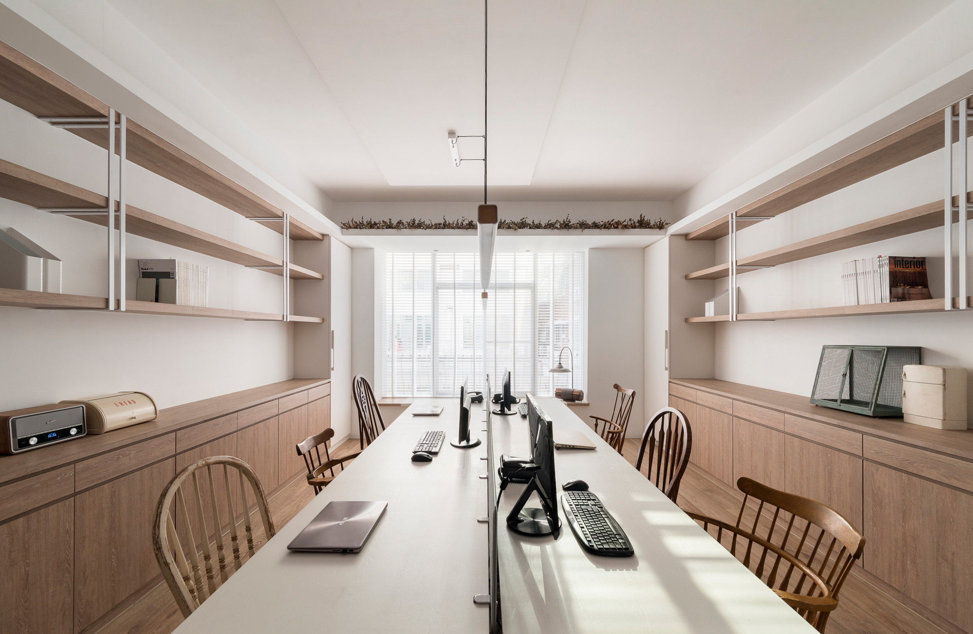 因基地本身空間不大,為了讓空間有效使用,整個空間以最少的隔間連結了空間的流動性,同時透過反射性材料的運用強化了空間放大的效果,也將綠、光、影連結至室內,創造「第二自然」的感受。前後立面的大面開窗,大量將天光引入室內,白天幾乎不需要開燈;她像是一幅具極生命力不斷更迭的畫作,將天氣的情緒連結至室內空間,讓設計師們随著時間與天氣的轉換與渲染,有了身心靈上的連結與對話,放鬆解壓一整天設計工作上的煩憂。