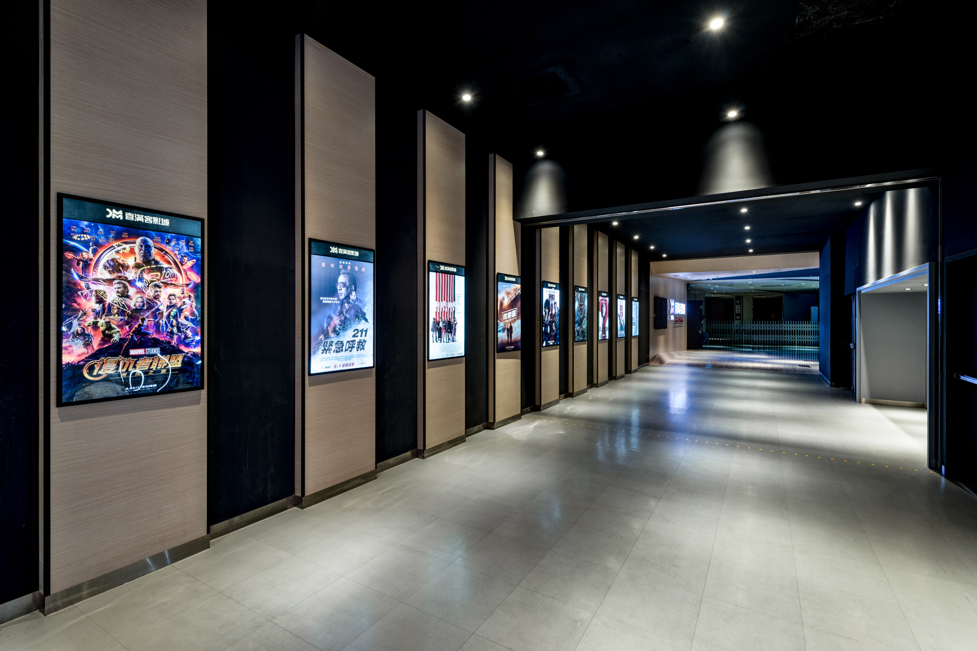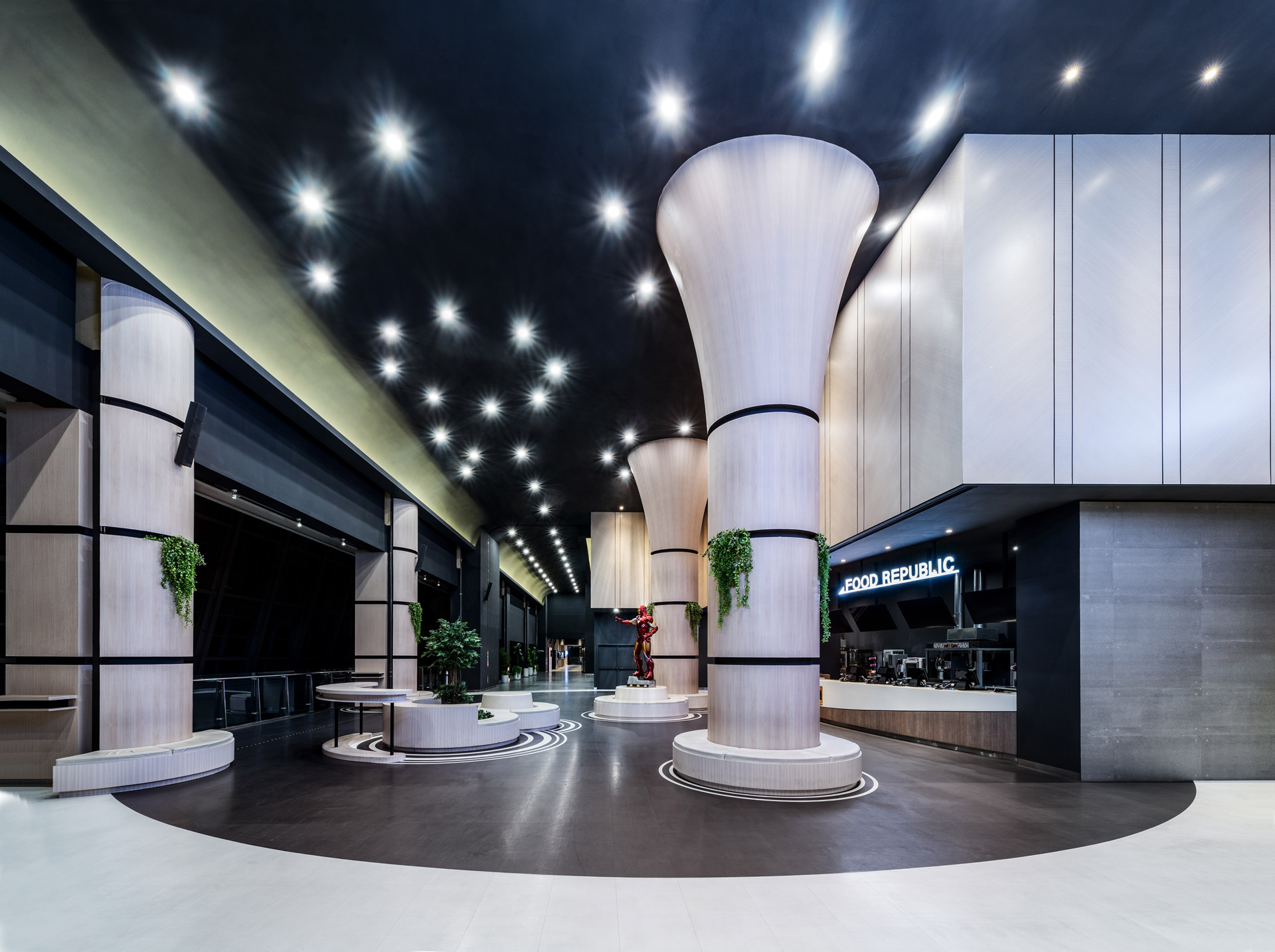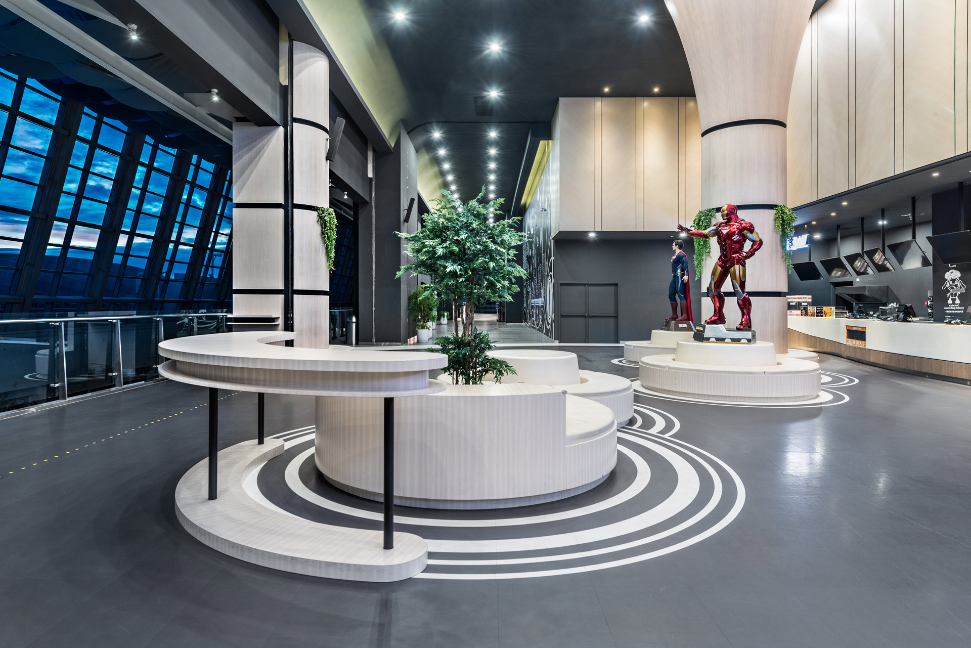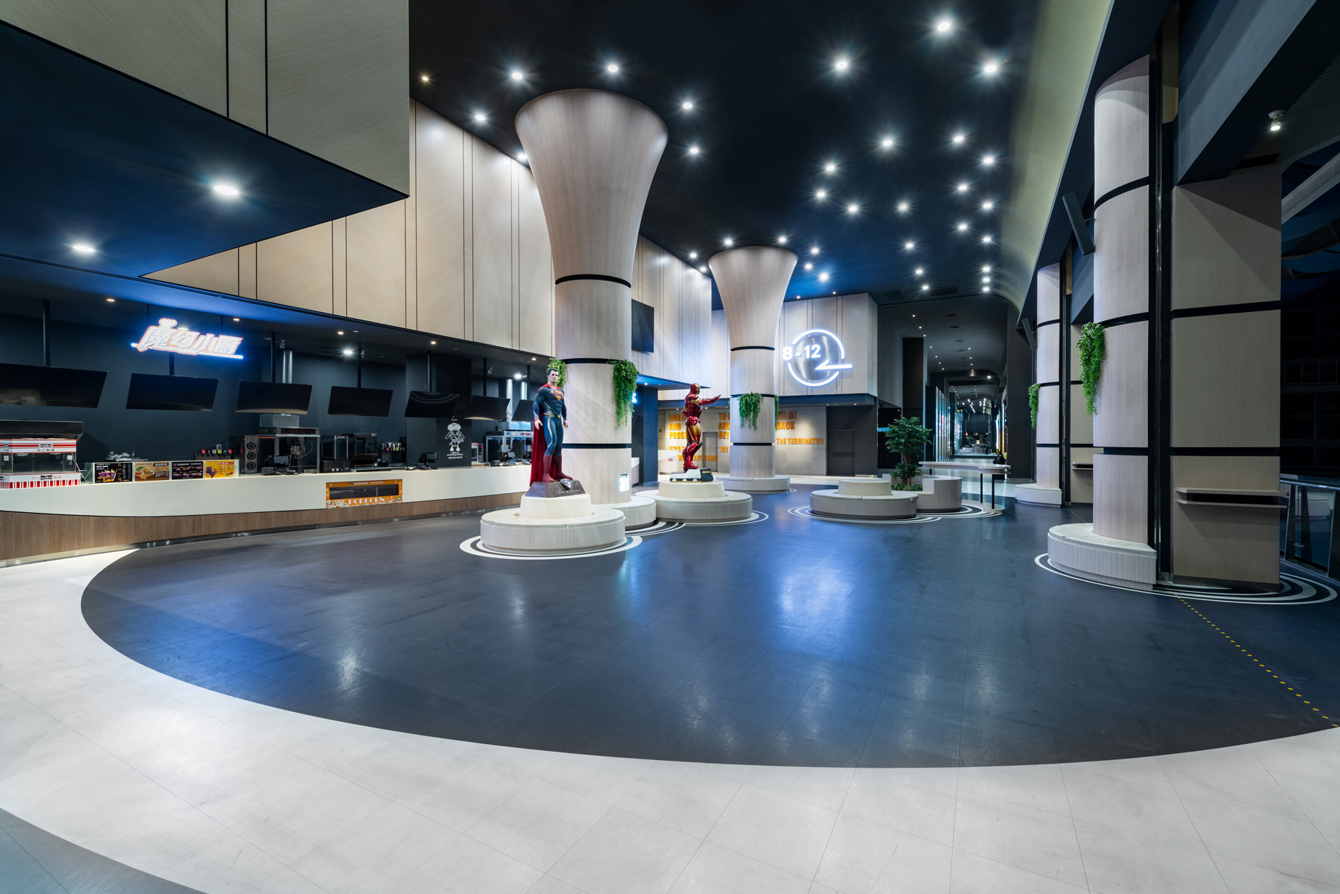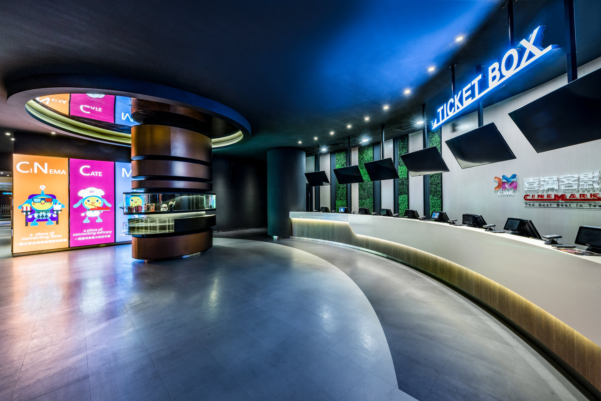 本案位處高雄夢時代,為購物商場內的電影院改裝計畫,在設計規劃之初,我們即希望打造一個不只是電影院的電影院,希冀在空間中總合各種不同的機能與體驗,強調場域的複合性,包括市集、藝廊的理念都含括其中,讓觀者感受到與過去強調聲光感受截然不同的多元質感。由商場的主要出入口進入影城區域內,以東方元素形象創造的「滿」字LOGO以紅藍綠三種色彩的整合形象映入眼簾。圓弧造型的挑空大廳除了作為休憩、食物與票卷販售區域外,亦為周末市集的舉辦地點,攤商、逛街民眾與觀影朋友在場域中,多維度的經營在空間中共譜出豐富多變的景象。