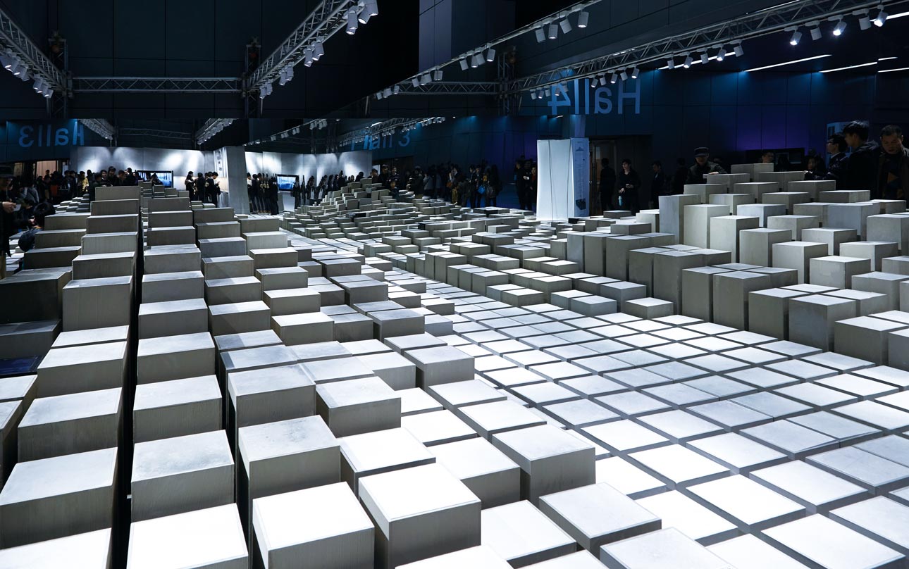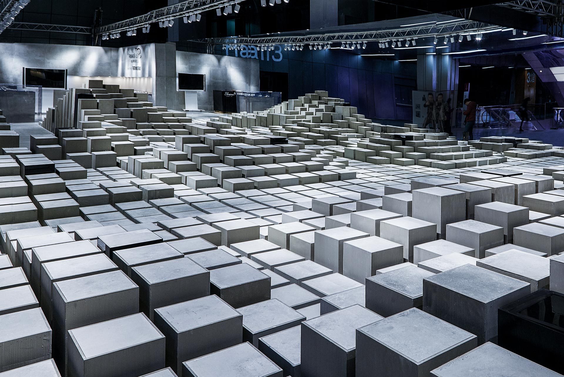 因而在國際廣州設計週上 ,我們以佛山的城市地景為藍圖,創造了一個地景的類藝術裝置,並以都市密度和等高線為表現手法,重新構建和堆疊屬於佛山的超現實地景,用一層層堆疊的量體喚起對於城市的記憶,用一片片的磚拼貼出屬於當下的體驗。同時,參觀者能遊走進入地景展場,並輕易碰觸到水泥磚豐富細致的表面,感受水漬、刮痕,斑駁的紋理,企圖回應再現城市角落的畫面,重新勾勒及連結場所的記憶。