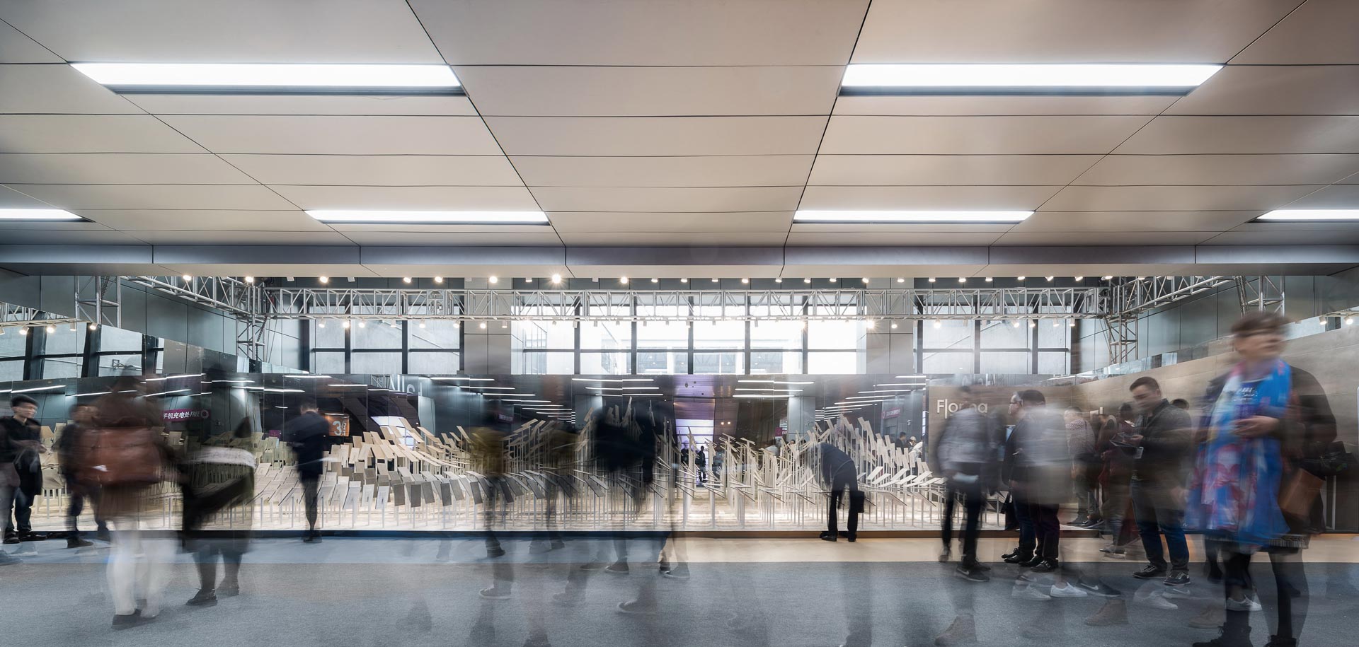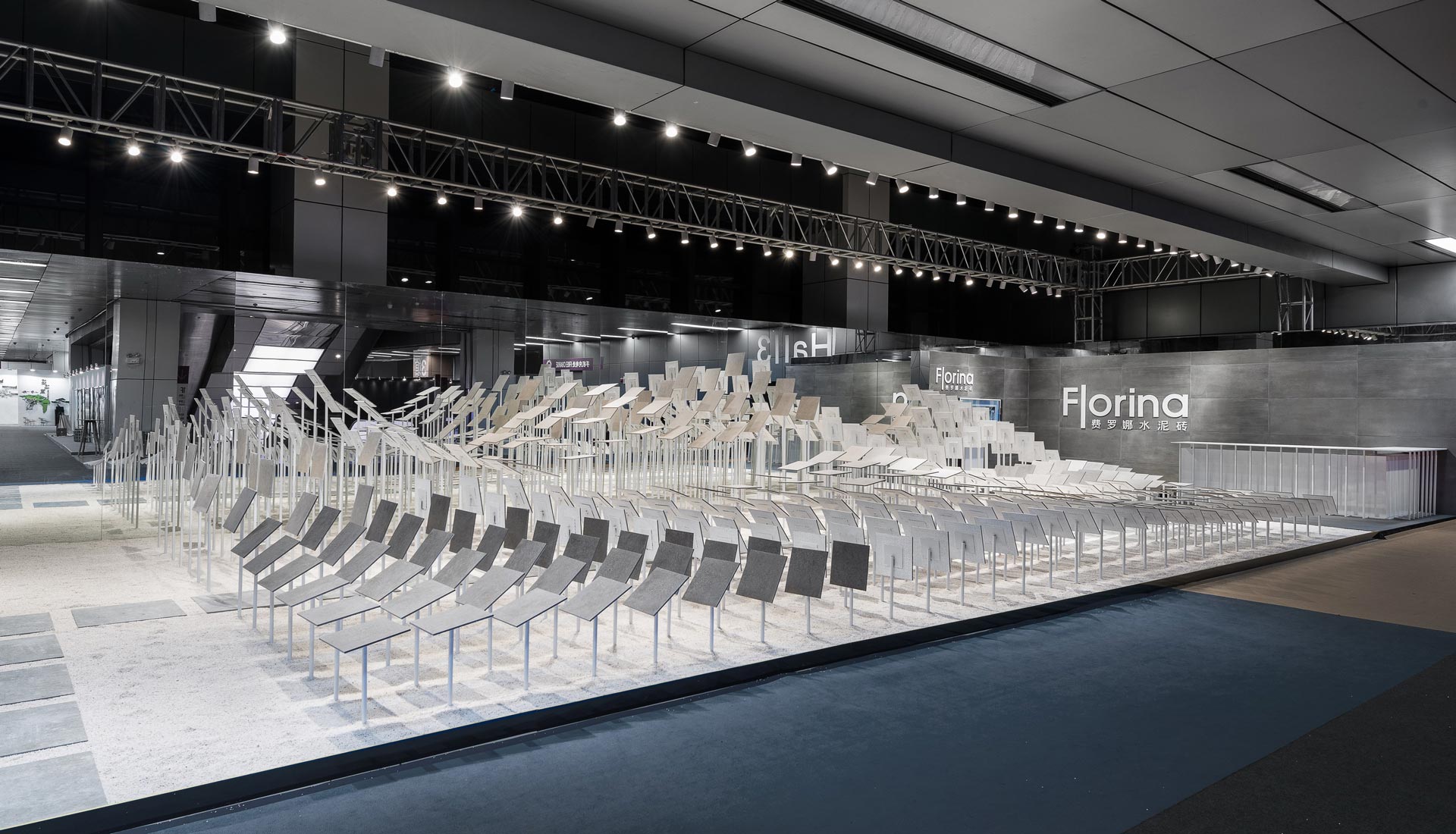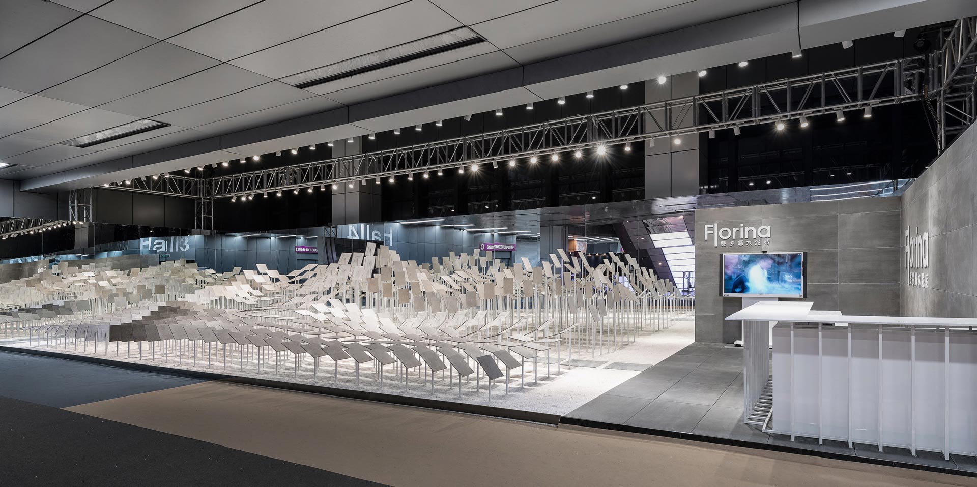 本案為出身廣東佛山的費羅娜磁磚 (FLORINA) 於廣州設計週的主展廳設計。展示規劃專業自十九世紀伴隨歐洲博覽會的興起,成為一種高專業度、稀有性物件演繹的場合,引人入勝的物件與展場內,產業進步與國力宣揚的精神隱隱蘊含其中。近年隨著時代演進,當代的展場內容不再受限特定產物,多元化的主題、包羅萬象的展品,藉由設計與藝術的手法呈現,讓觀者在無形中感受品牌精神,接收到企業文化的真諦。