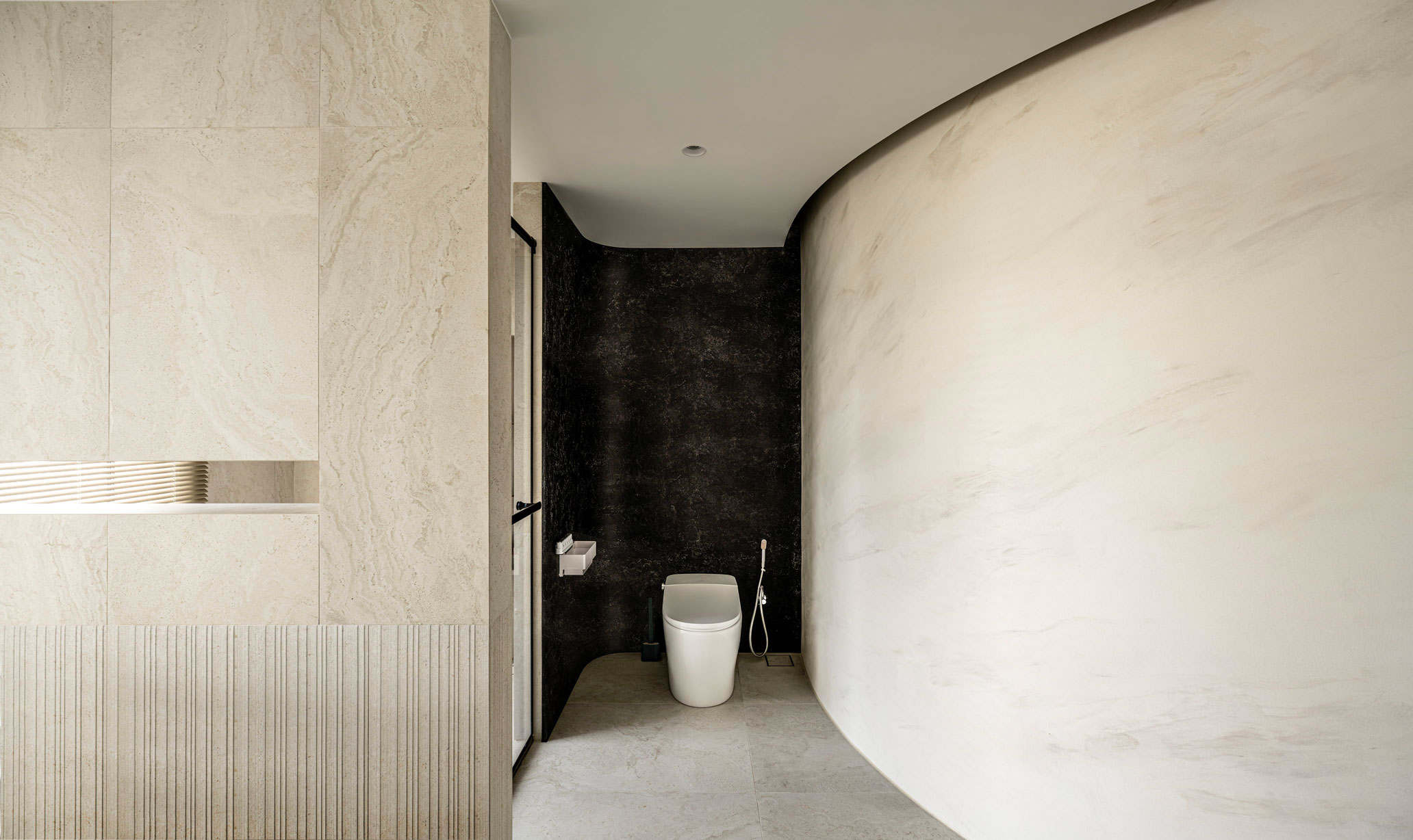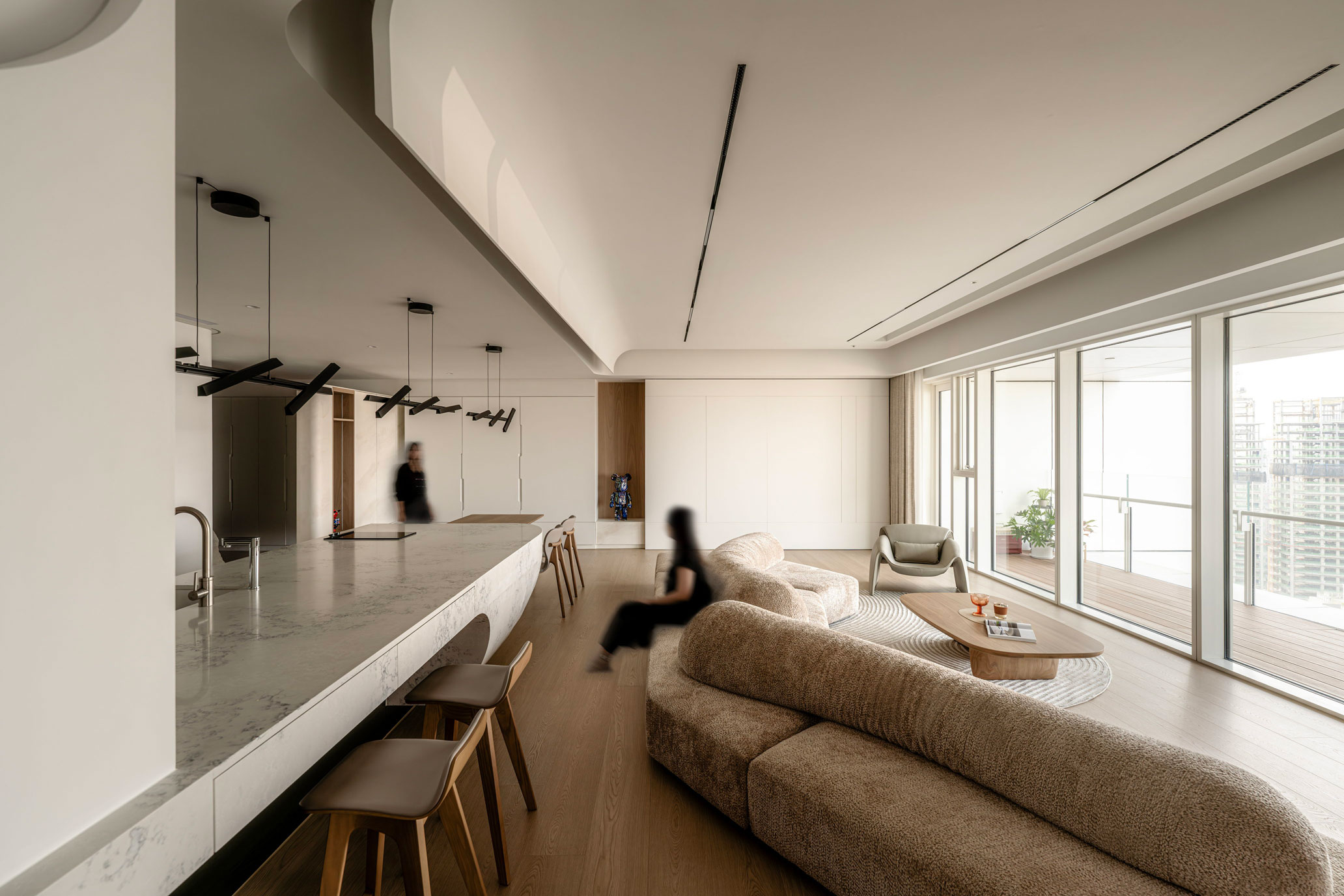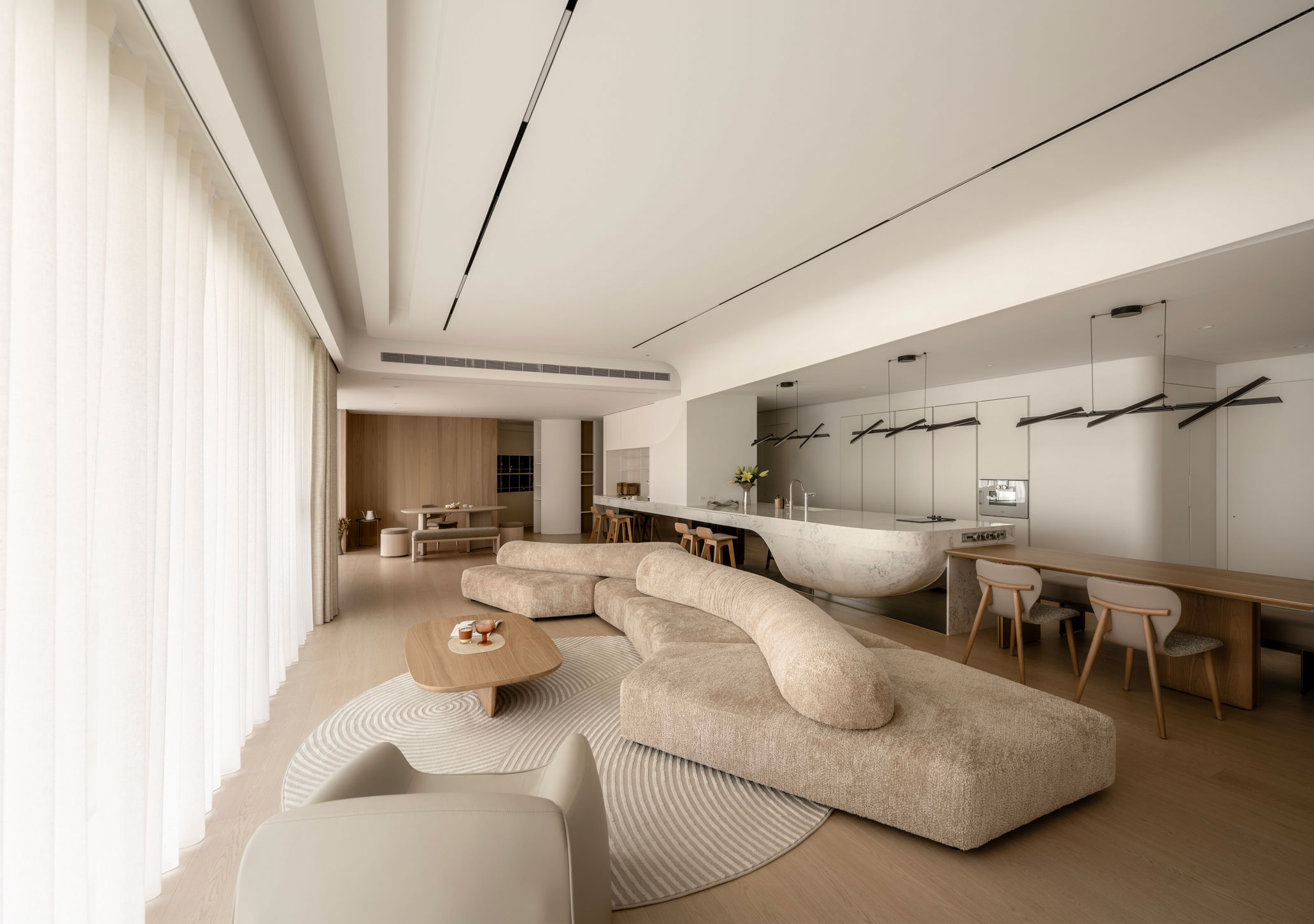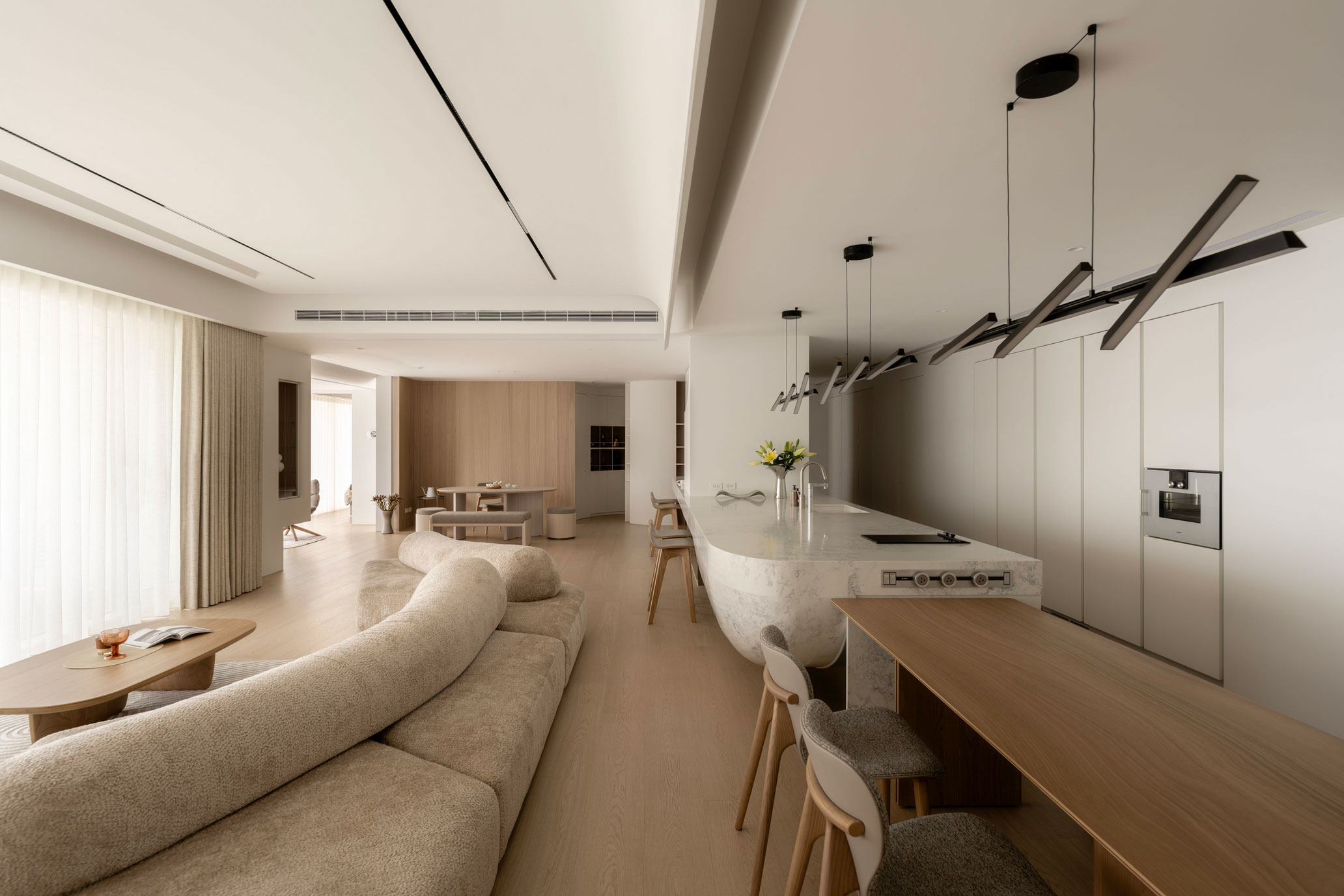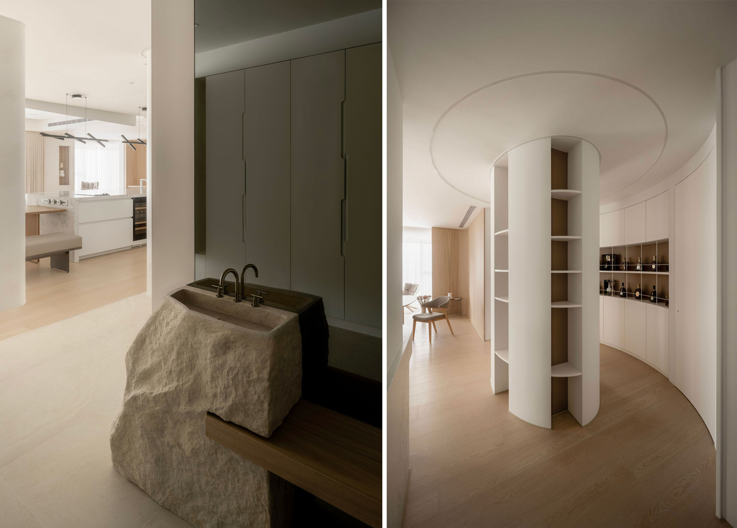 「家」作為身體與心靈的休憩之所,住宅以「慢島生活」為設計主軸,藉由精妙的規劃設定,讓居住者在日常起居中,遊歷居家慢島中的每個迷人片刻。從入口玄關、餐廚空間、客廳、喫茶間、珍稀酒廊到主臥房,不同的空間場域猶如一座座漂浮島嶼,憑藉著線性串聯,創造物與物、空間與空間、空間與人之間的緊密關聯。走入室內,打開生活的大門,在猶如碼頭般的門廳卸下外界塵囂,歷經身心的內外轉場後邁向慢島。爾後進入主要公區,一道巨型中島映入眼簾,圓弧形的石材檯面與連接地面的反射金屬質地,營造如同「大船入港」,漂浮於萬頃群島中的意象,包覆其中的管道柱則向上延伸至天花、燈具,形成一道道船帆般的設計,揚帆啟航的意象,為餐廚空間增添些許藝術氣息。