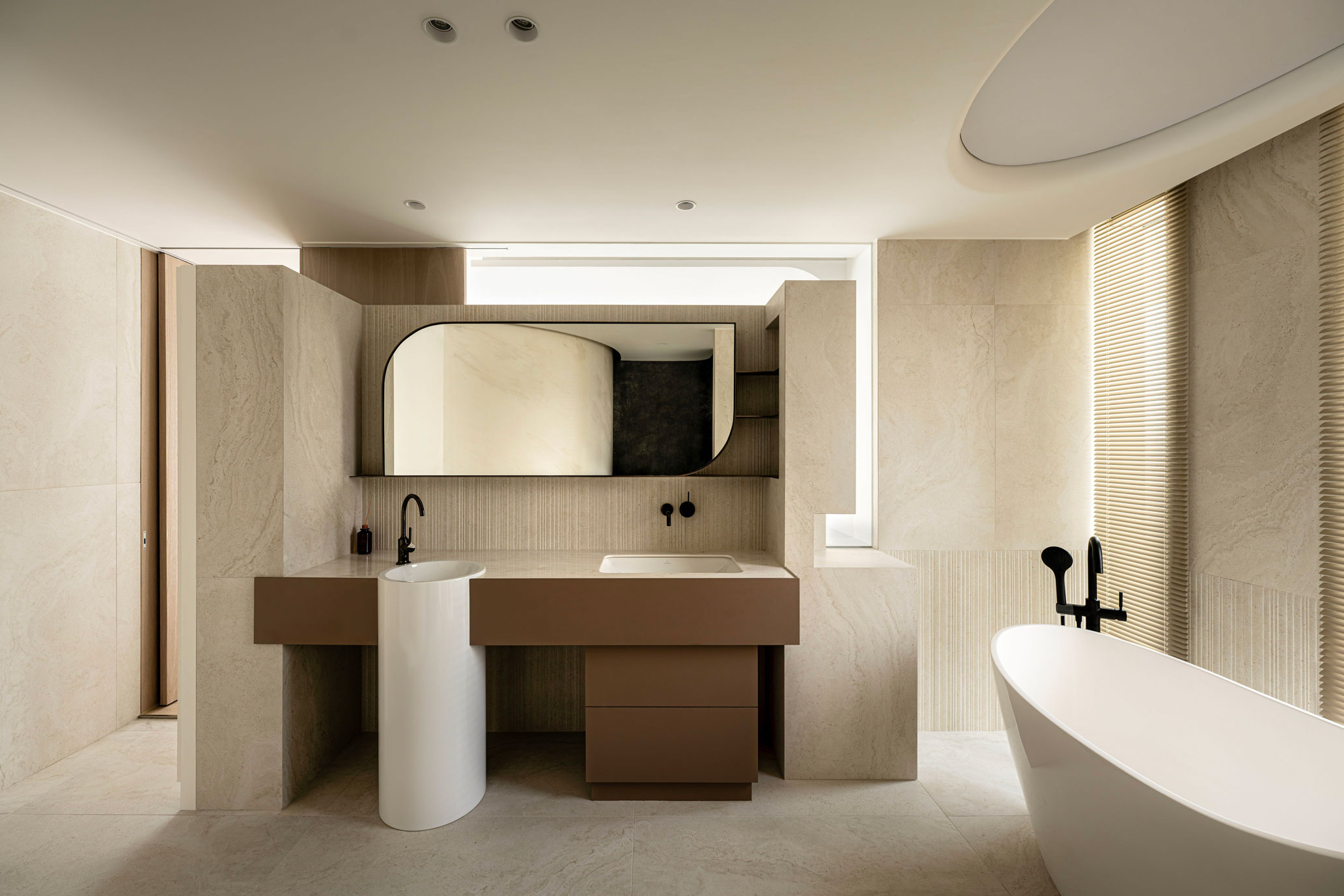 現代人終日生活在高樓與街市環繞的混凝土叢林都會,在這樣持續加速、加壓的生活環境中,「居所」應呈現何種樣貌?這座位處台中七期新都心的百坪大宅,建築本體是白派建築大師理查.麥爾設計的高端現代主義華廈。偌大室內為方整的矩形平面格局,惟住宅中央被兩段結構柱與管道間組成的機能空間劃開。有鑑於此,整體空間規劃在不更動既有機能區設定下,將中央部分打造成室內的主要視覺焦點,結合環繞式動線及主題展示理念,讓原視為劣勢條件的區域,轉而成為住宅中最耀眼、吸睛的優勢核心區。此外,空間配置因應L型的大面連續採光窗,將客廳、餐廳與臥房等主要空間依次排列,讓「家」成為都市生活與大自然連結、對話的感知現場。