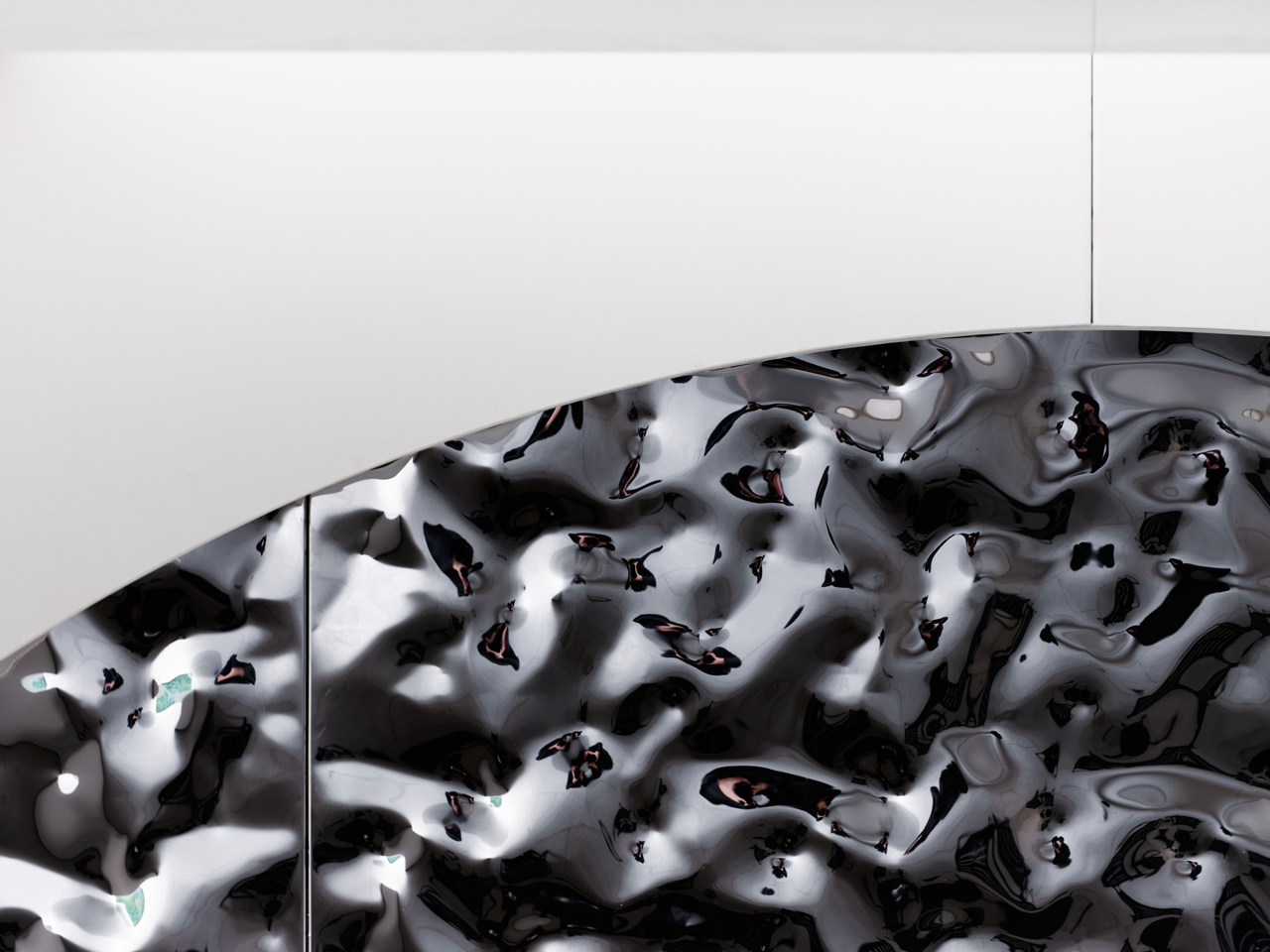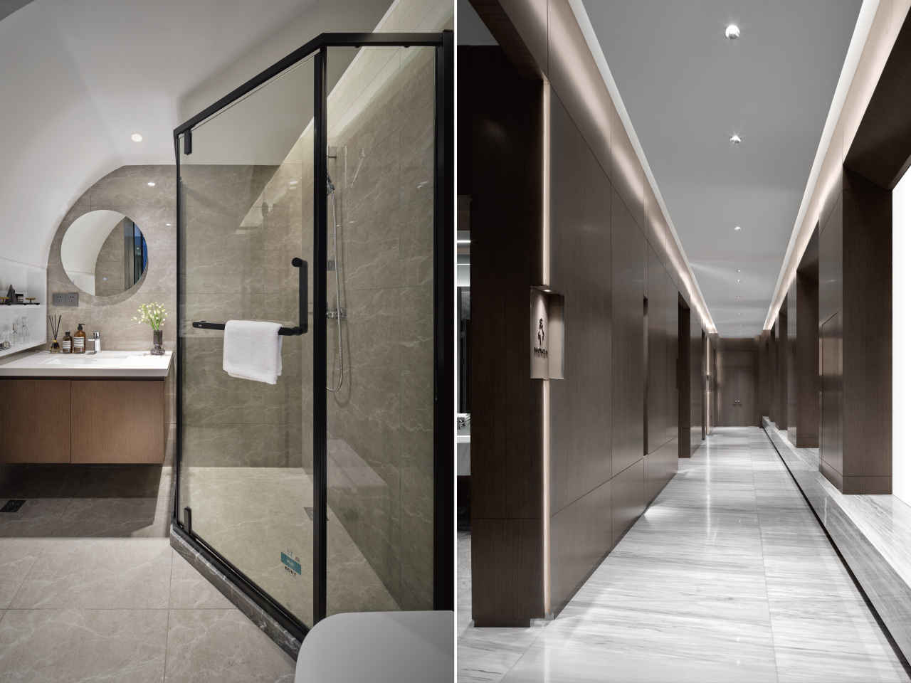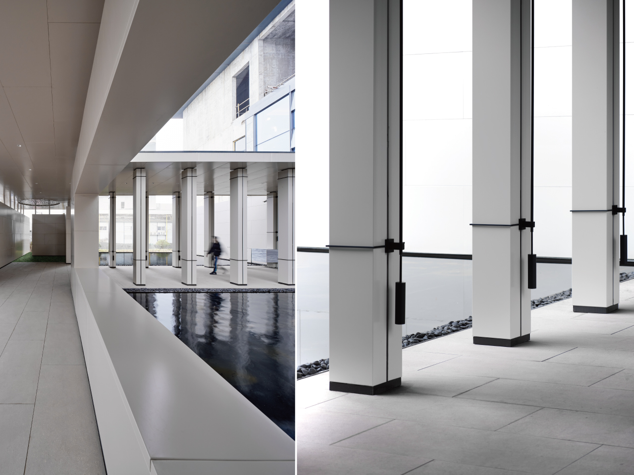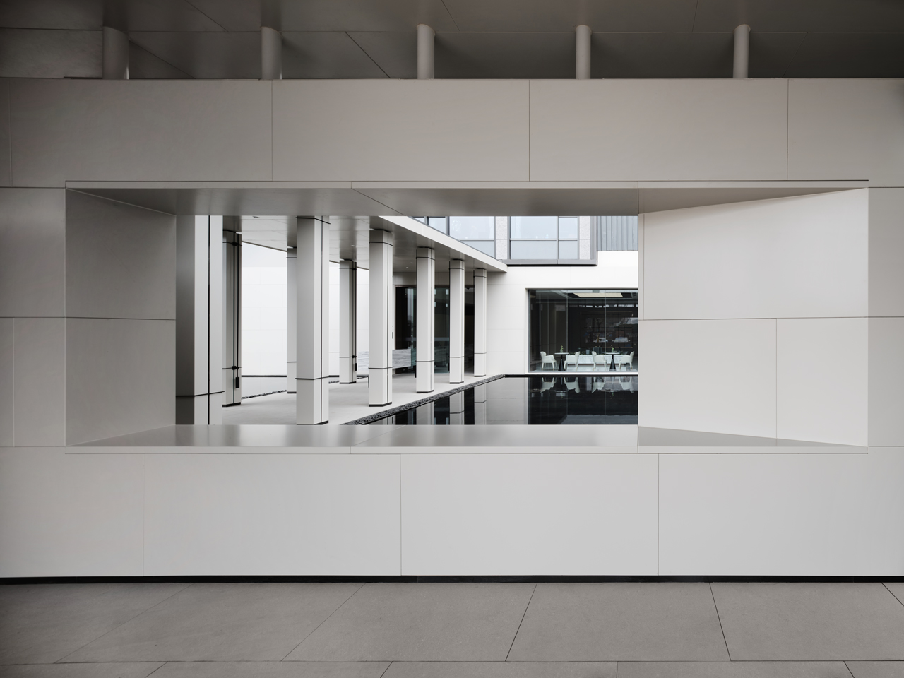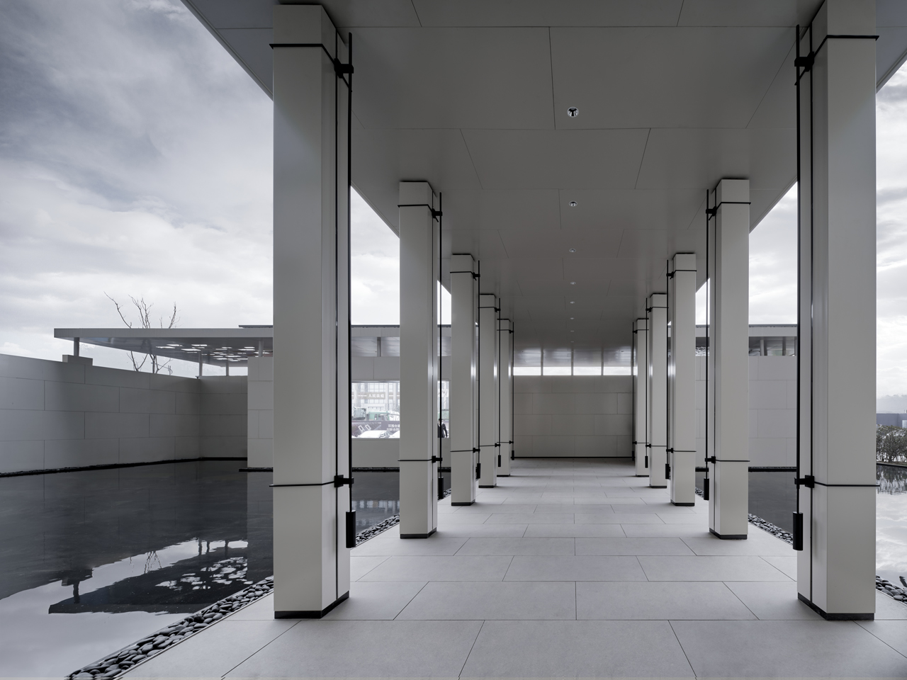 由於基地位處杭州繁忙的都會區、受到大量車流與吵雜人群的環境所圍繞,因此在會所設計中,團隊應用了合院式規劃營造出曖昧的視覺提示。藉由迂迴動線與建築量體之間精心設計的開孔與間隙,創造出可漫步其中的沉靜空間體驗。在遊走於連續不斷的迂迴動線中,參訪者可以感受庭園內的花草植栽、仰望澄澈的天際,亦或是觀賞池內的湛藍水面。這些悉心安排的錯落景致,讓人們得以自外面的繁忙都會中,經歷一段心境轉折,進入這個鬧中取靜的淨心之所。而這從喧囂轉為靜謐的情境變換,竟頗有柳暗花明又一村的玩趣意味。