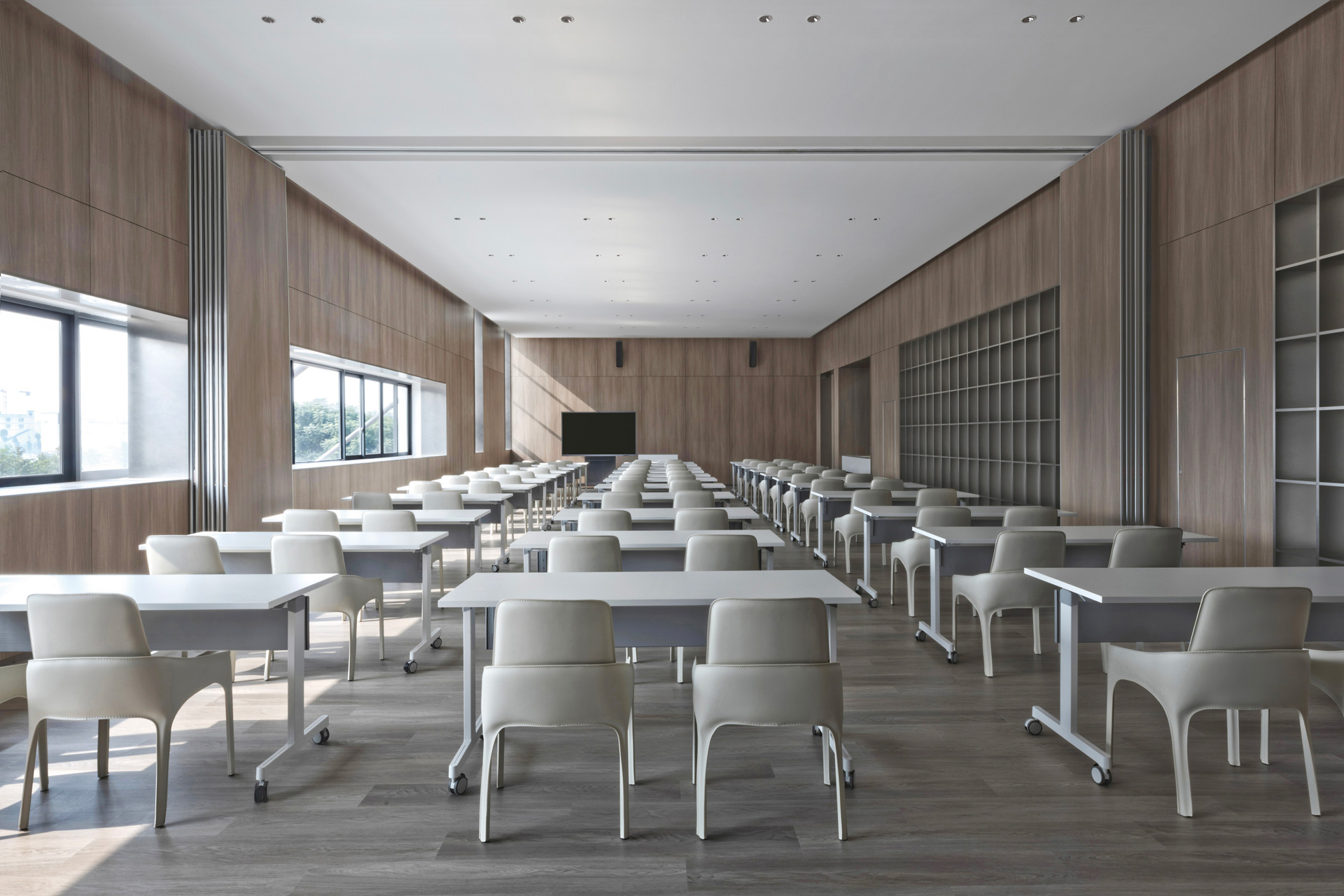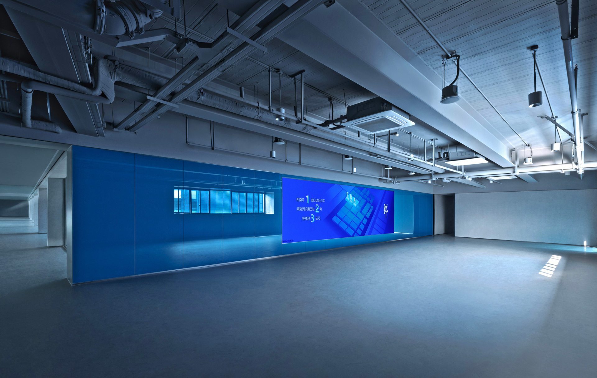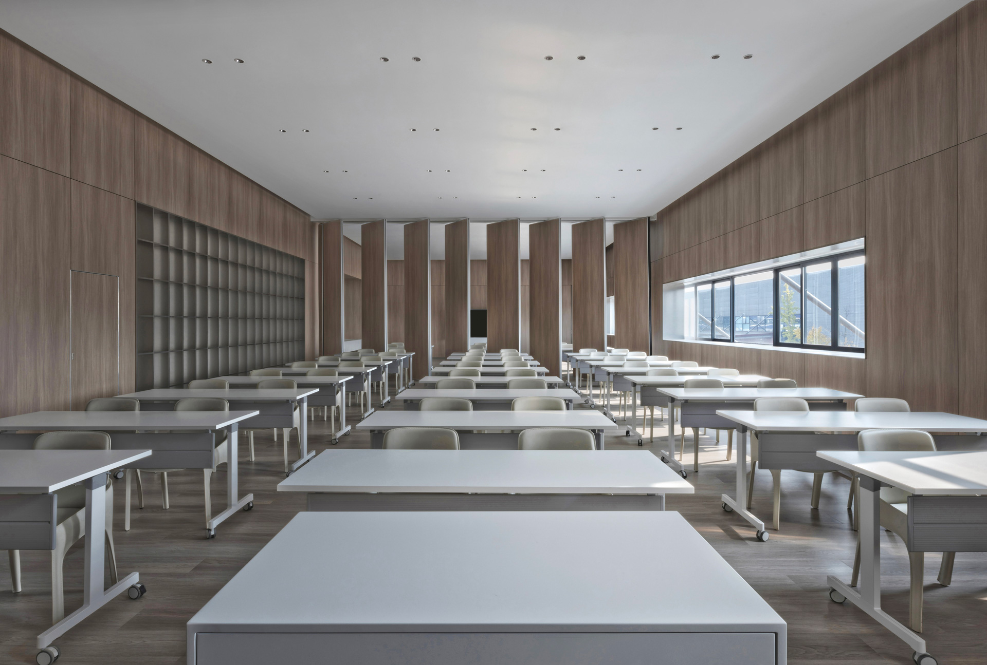 位處動線起點的接待大廳以藍、白色牆面與巨型電子顯示屏幕打造,高科技的多媒體互動呈現,鉅細靡遺地播送郎酒企業綿長的發展歷史。後方通廊右側以大面落地開窗看向A庫持續運轉的入庫輸送帶,左側則以水平帶狀造型牆與線性燈帶,打造不斷向前的速度感。來到中段B庫,廊道一側延續帶狀落地窗讓訪客直擊機械自動化的倉儲運作,另一側則以時間軸設計,將2015年起的每一款佳釀製品,結合櫥窗設計呈現在歷史長河中。整合兌酒工作室與教室的C庫複合勾調空間,溫潤的木質色調,可隨意開闔、改變尺度的場域,無論是專業人員或參訪者,都能在這裡品鑒搭配,創造出屬於自己的酒款,藉由勾調與品酒後由內而發的情感,以濃情白酒燃起激情,回望過去,展望未來。