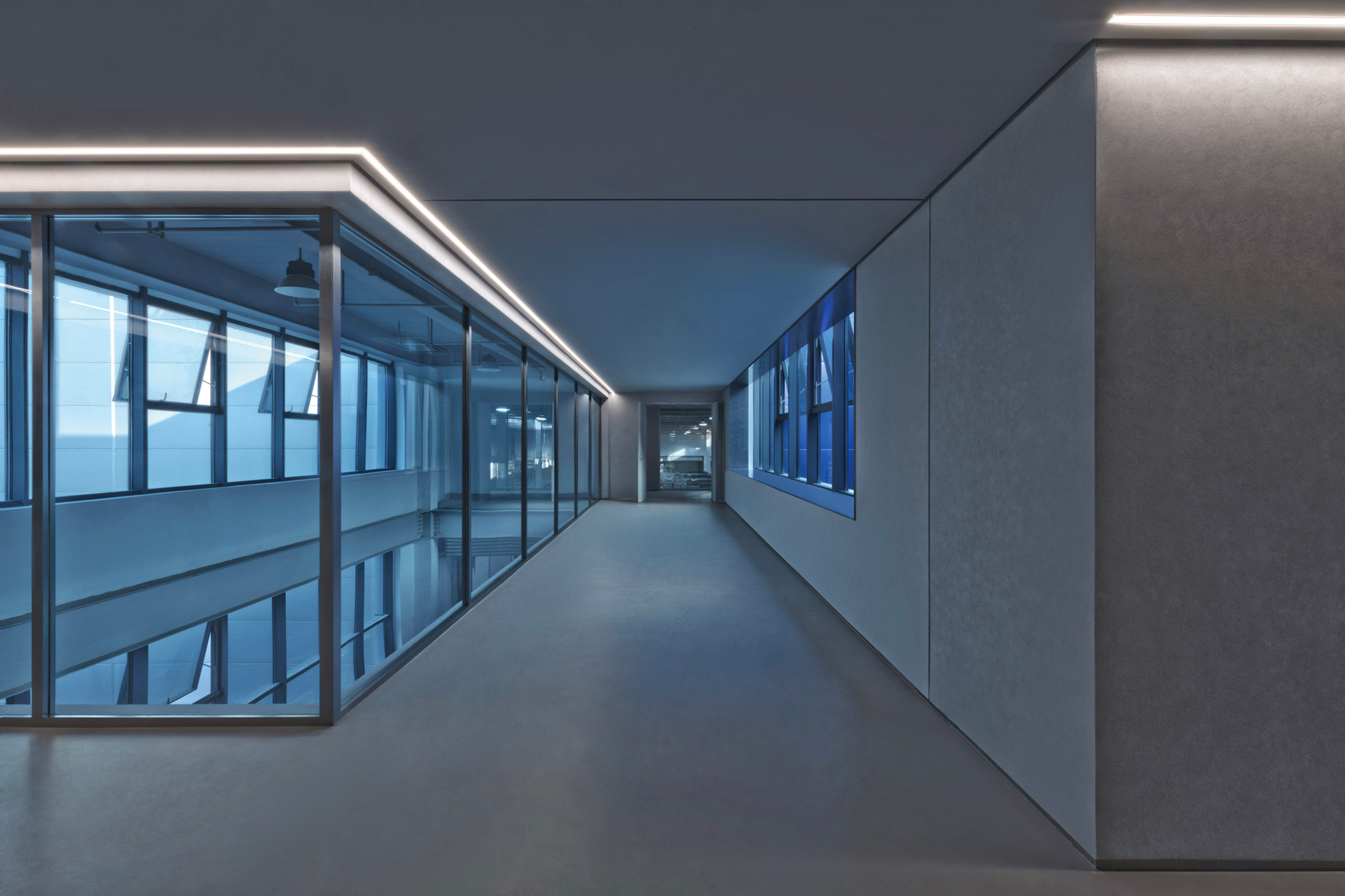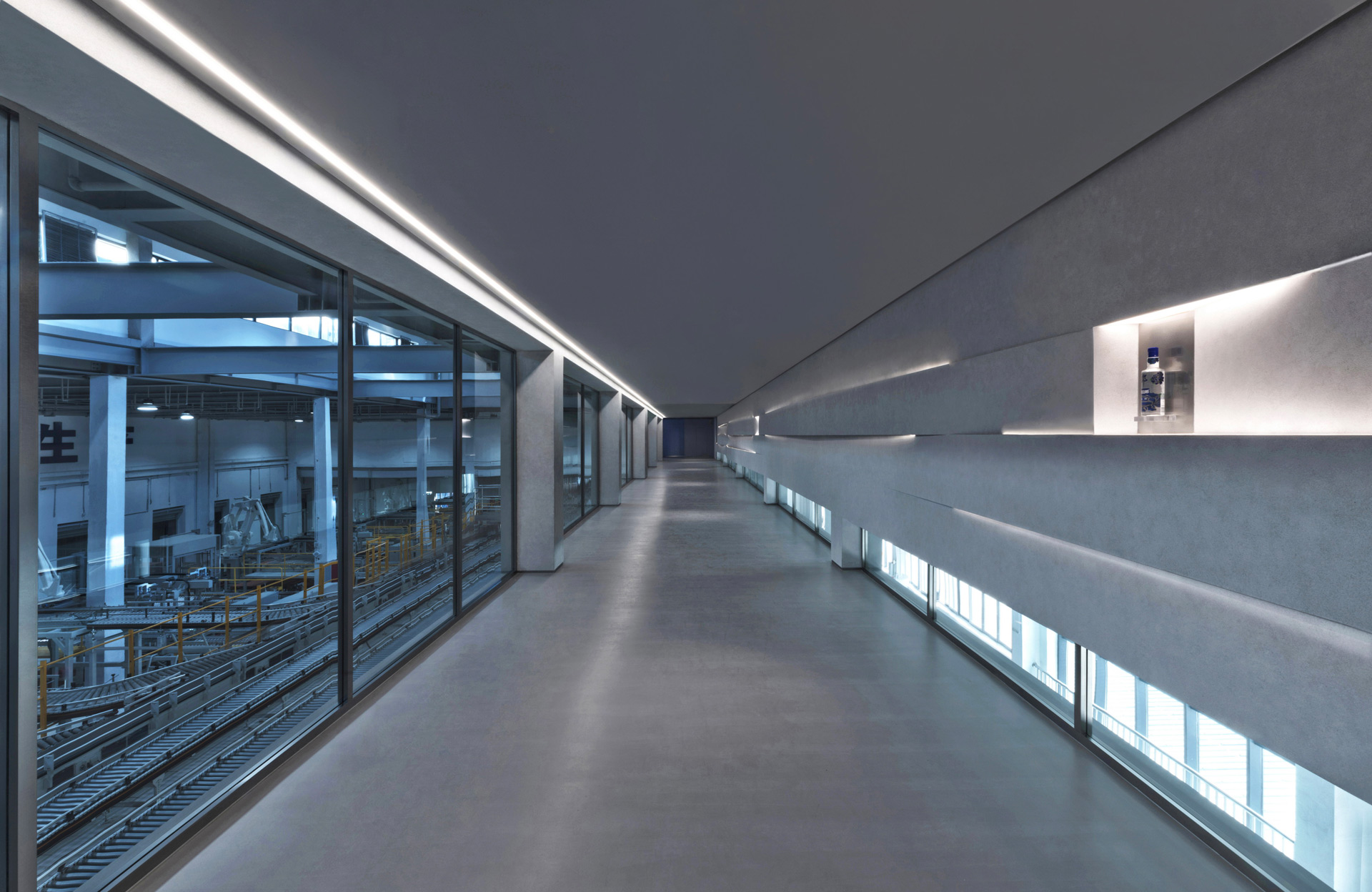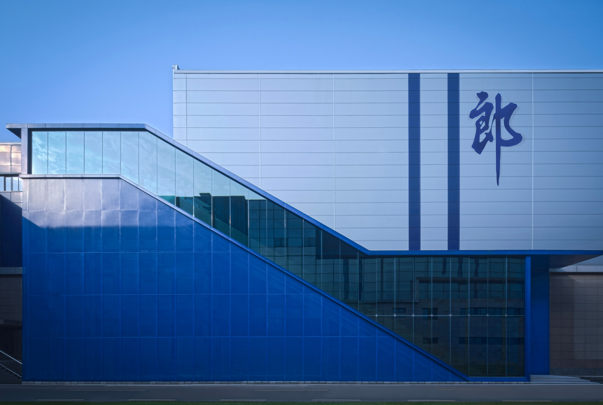 295米長的參觀動線貫穿了A、B、C三個立體儲藏庫,三座儲藏庫各司其職,A庫主要進行不同產品的傳送與分類,B庫是立體式的自動化儲存區,C庫則作為白酒勾兌、調製時的勾調室。團隊透過系統性規劃,從建築的外立面暨入口意象的重塑,到建築內部定位與規劃設計,由外而內地執行全場域空間升級。入口處以代表郎酒企業的湛藍色調外牆結合玻璃帷幕,營造出具有當代氛圍的品牌意象;進入大門,即可見由一道綿長的手扶梯直通上層,由此進入來回穿梭於一、二、三樓與A、B、C庫之間,高低起伏的立體動線通廊。品牌戮力追求的規模、速度、效率、激情等核心理念,深入淺出地透過設計語彙轉譯,呈現於不同的廊道分區之中。