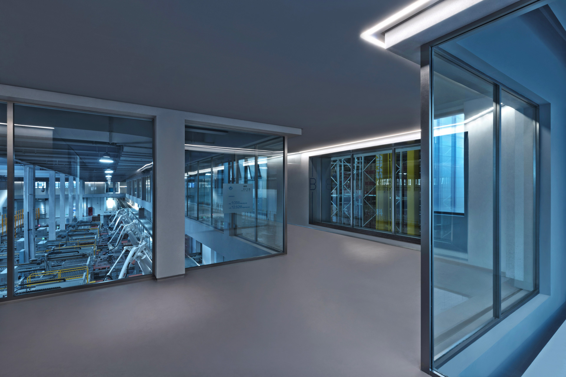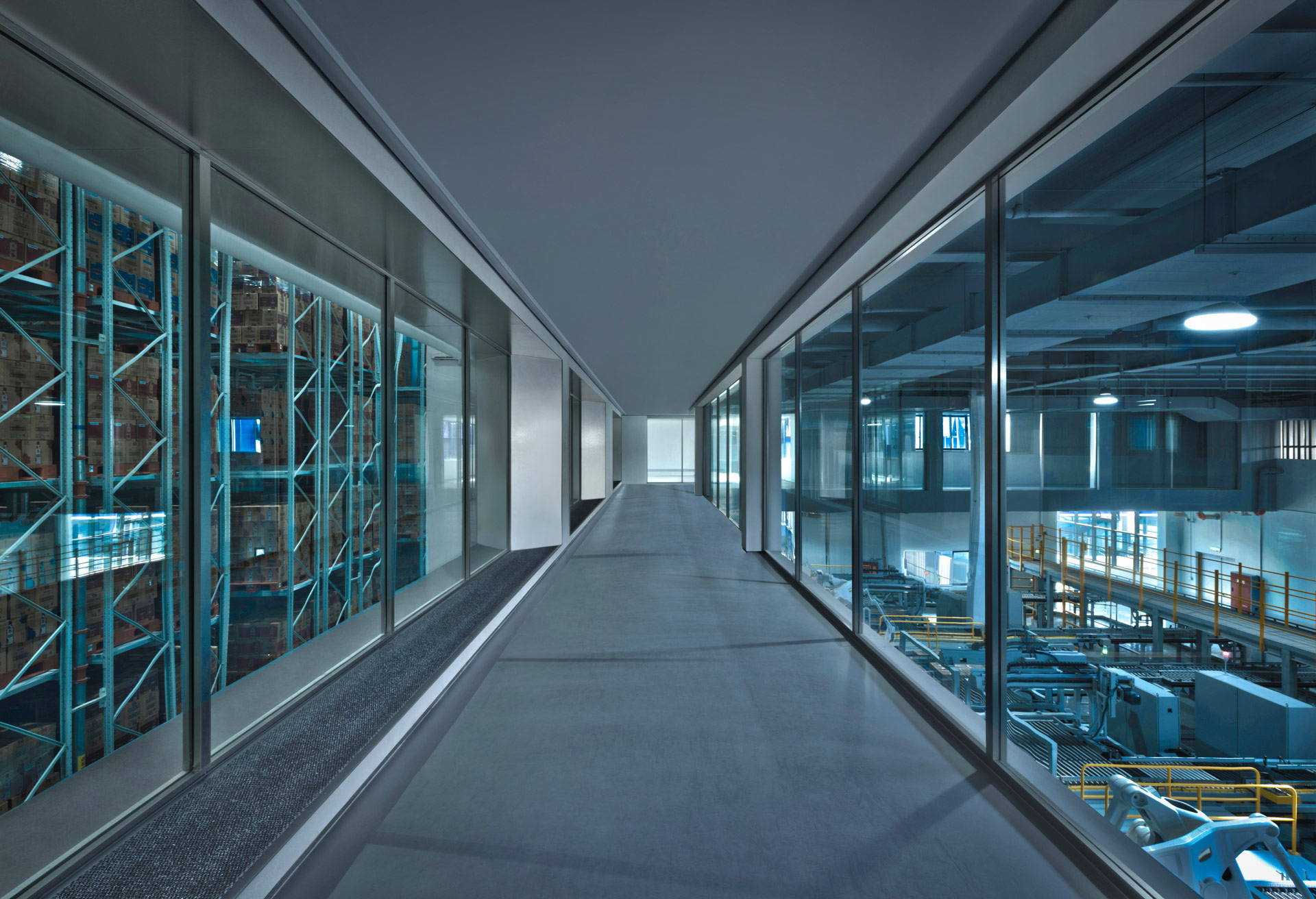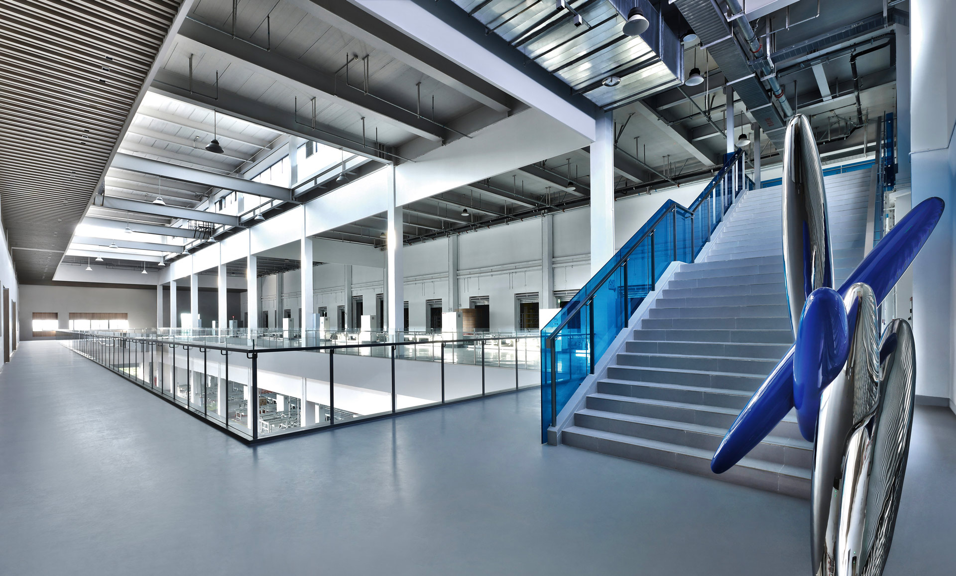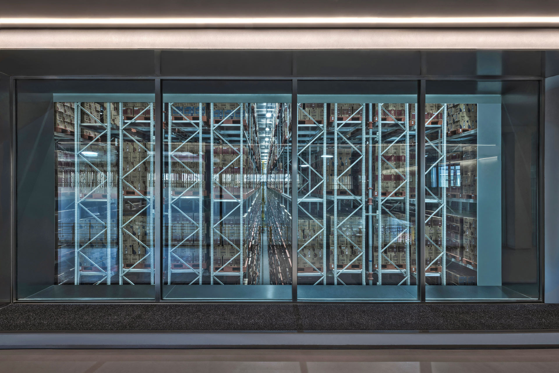 295米長的參觀動線貫穿了A、B、C三個立體儲藏庫,三座儲藏庫各司其職,A庫主要進行不同產品的傳送與分類,B庫是立體式的自動化儲存區,C庫則作為白酒勾兌、調製時的勾調室。團隊透過系統性規劃,從建築的外立面暨入口意象的重塑,到建築內部定位與規劃設計,由外而內地執行全場域空間升級。入口處以代表郎酒企業的湛藍色調外牆結合玻璃帷幕,營造出具有當代氛圍的品牌意象;進入大門,即可見由一道綿長的手扶梯直通上層,由此進入來回穿梭於一、二、三樓與A、B、C庫之間,高低起伏的立體動線通廊。品牌戮力追求的規模、速度、效率、激情等核心理念,深入淺出地透過設計語彙轉譯,呈現於不同的廊道分區之中。