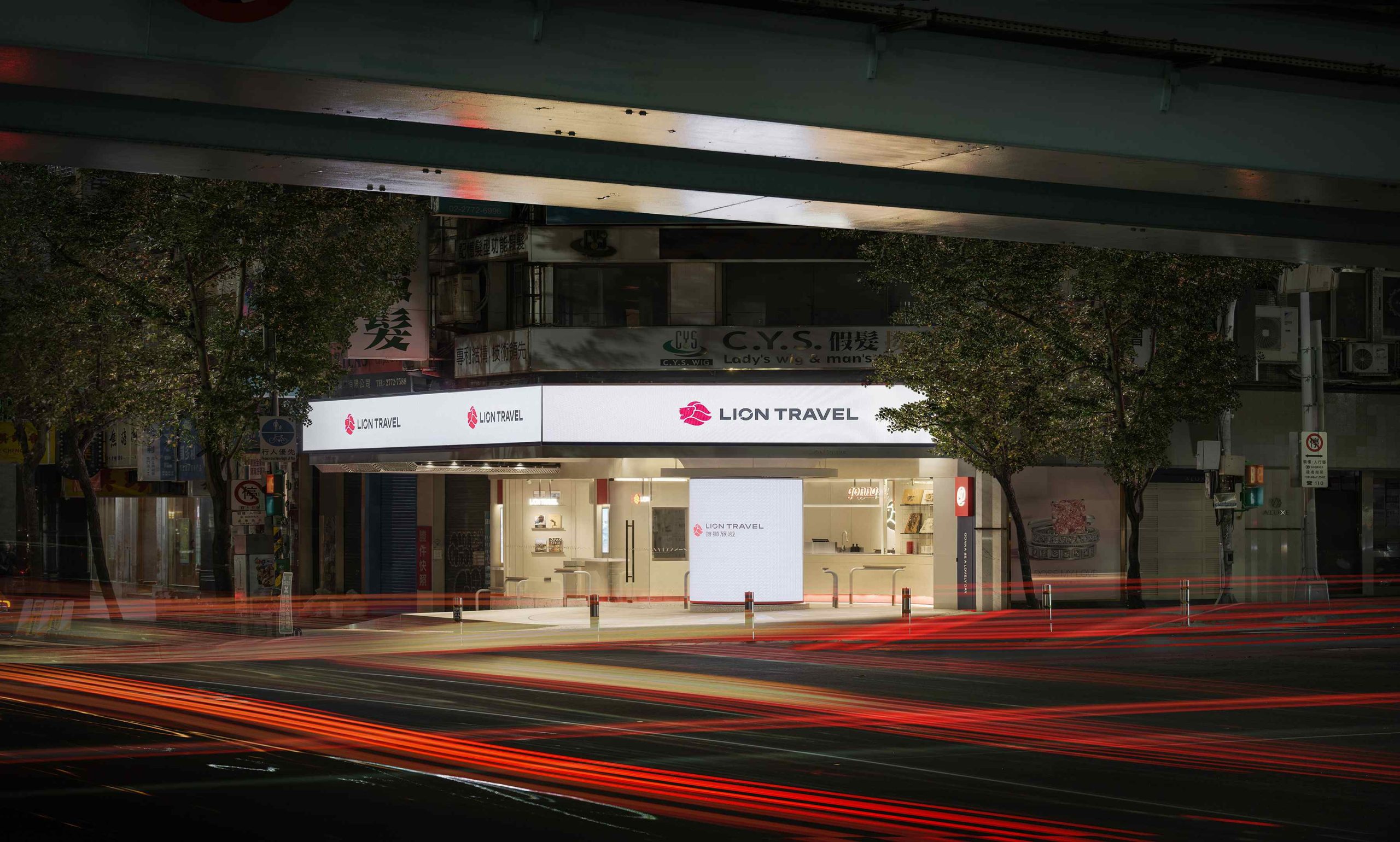 作為台灣旅遊產業領導品牌,雄獅旅遊長期關注市場脈動,疫情前就曾聯合竹工凡木團隊在台北東區打造最具指標性的品牌概念旗艦館,展示多元的新型態旅遊情境,可惜被疫情所影響。此次重返東區再次打造全新概念門市,並以「One Day Trip」為概念,透過設定在早、中、晚三個不同時態下的空間活動,植入多元的複合機能,體現一日生活的多重樣貌。在這個擁有豐富時間軸的微型基地內,設計上打破將室內空間運用到最滿的18坪策略,而是反其道而行,釋放5坪的室內空間給予公眾,企圖重新串聯、整合騎樓廊道,並以經緯度造型標示品牌的全球據點,打造出具環宇意象的城市微型廣場,見微知著地感受到其從台灣出發鏈結國際的能量。至此,旅行社不再是單純的旅遊洽談空間,而是提供社交互動、取票諮詢、停留休憩、動態展演的多功能場域,一個與商圈、消費者和鄰近住戶的24小時生活陪伴。