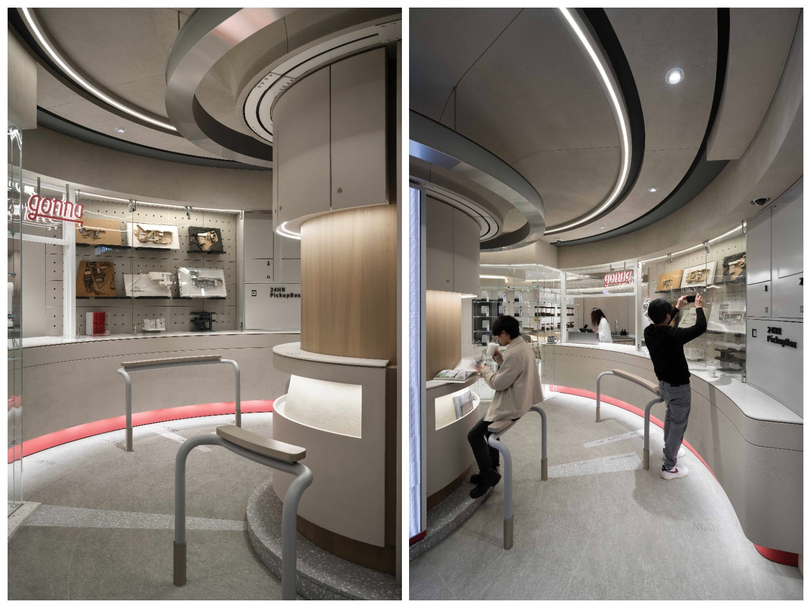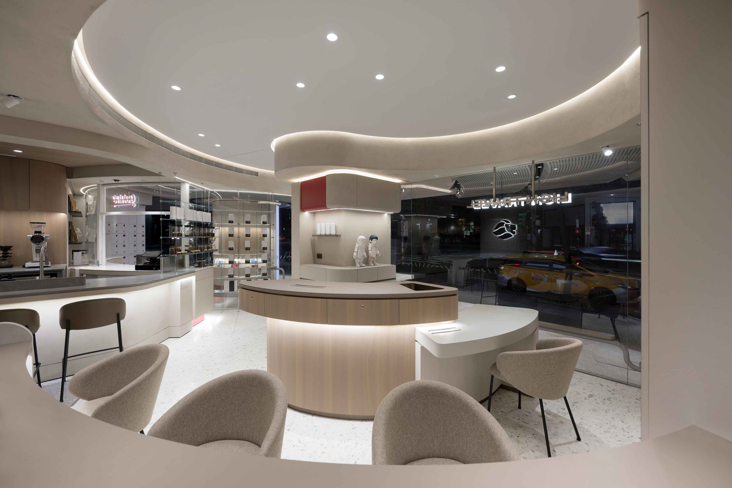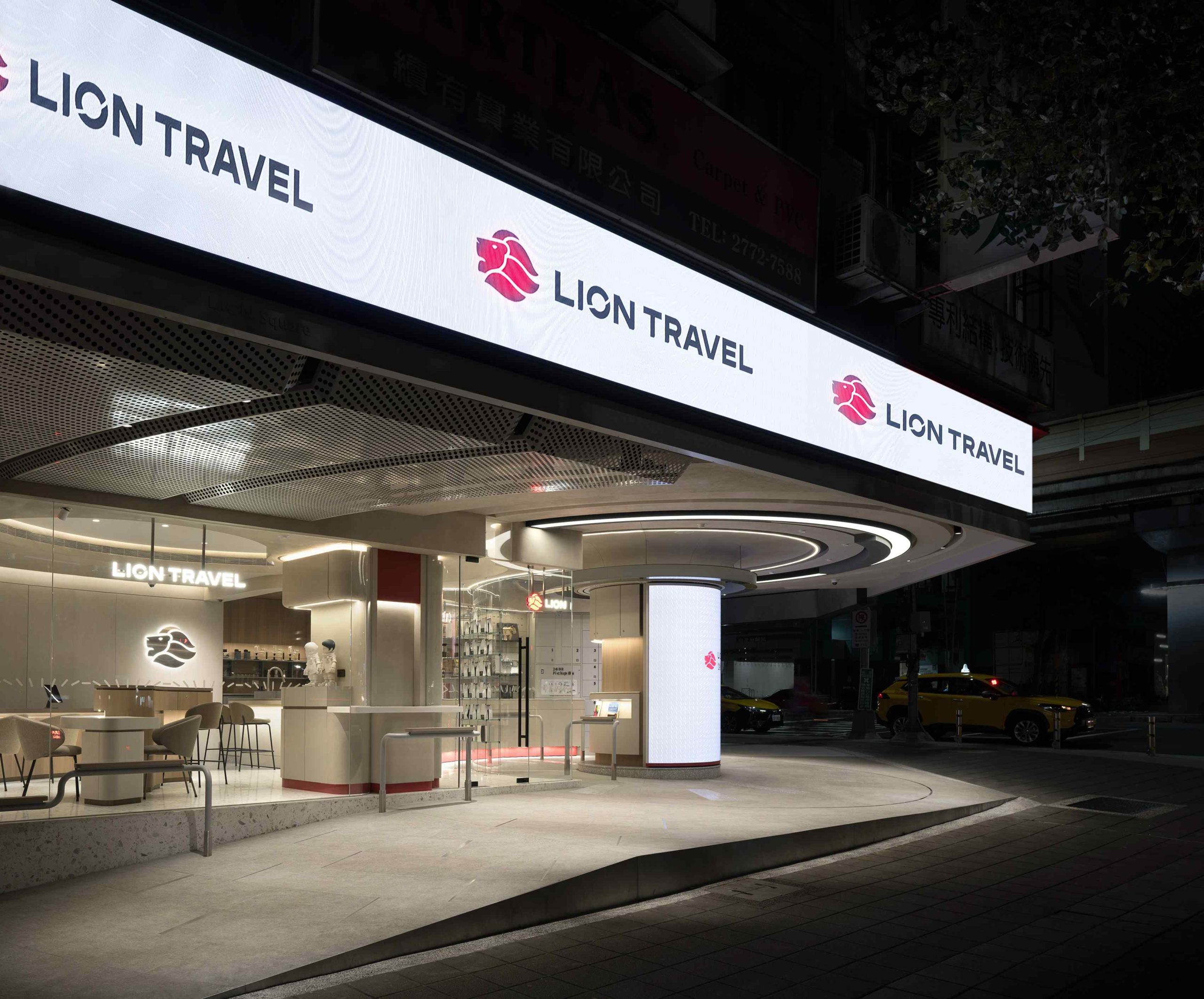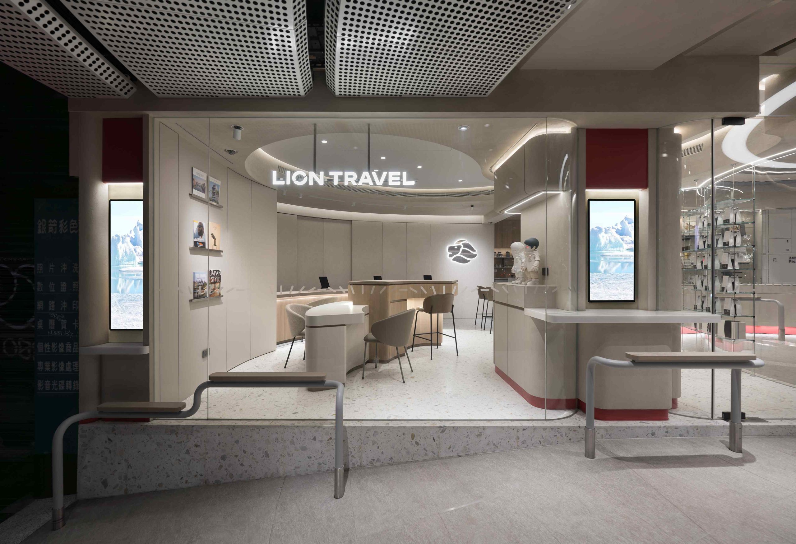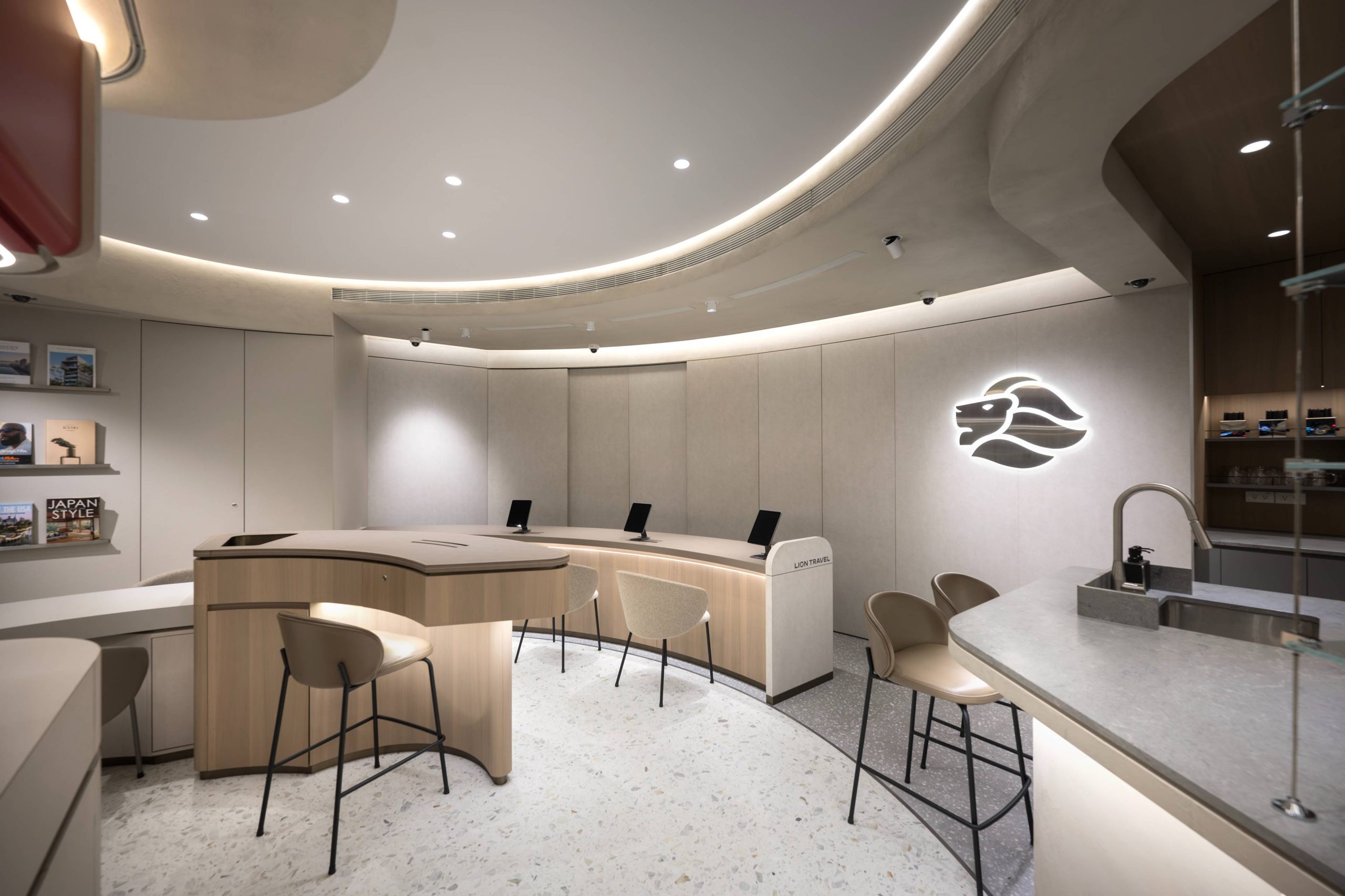 門市坐落人潮聚集的交通要道與商業核心區內,是旅人移動、駐留的節點。在旅行 / 行旅概念下以「城市驛站」作為空間設計思考的另一重心,建築在既有騎樓退縮的基礎上打開封閉邊界,轉而以柔性的流動圓弧線條形塑出開放的公共場域,進而重新定義室內與半室內的空間關係。城市驛站的理念透過開放、去邊界、社會性的思維帶入,加上圓弧語彙的流動感銜接空間內外,從天花上高低錯落的環繞量體、轉角弧形外立面到地面經緯地圖,憑藉圓弧造型的空間演繹打破既存框架,以流動的邊界構成整體視覺的連續感,也傳達旅行、飛翔的意象,在一場流動的盛宴中,揭示雄獅在旅遊產業的前瞻性與無限動能。