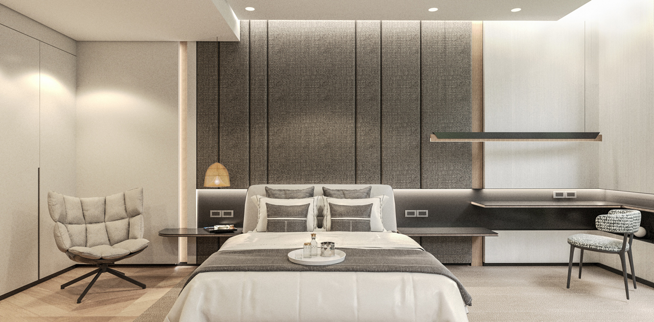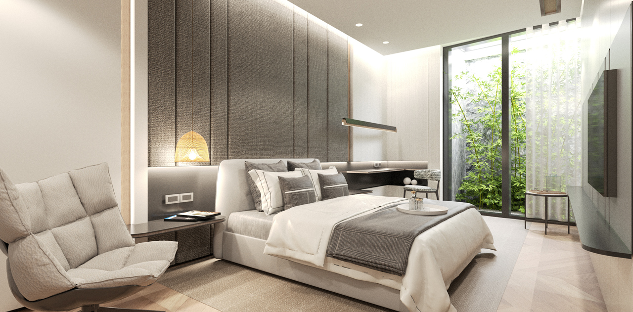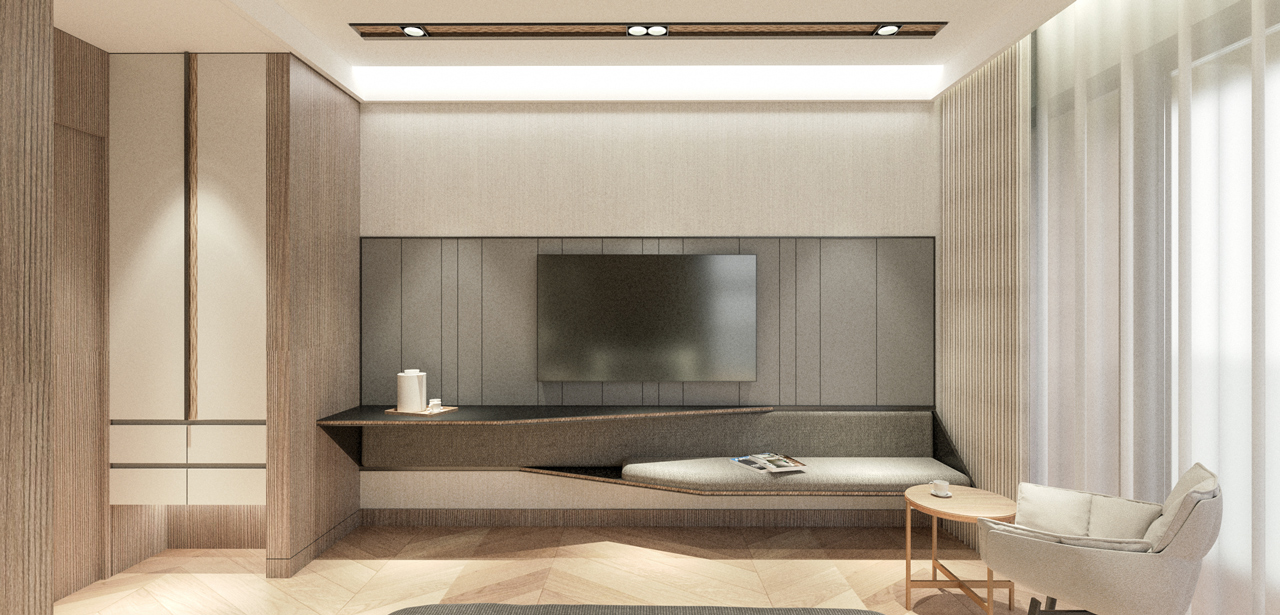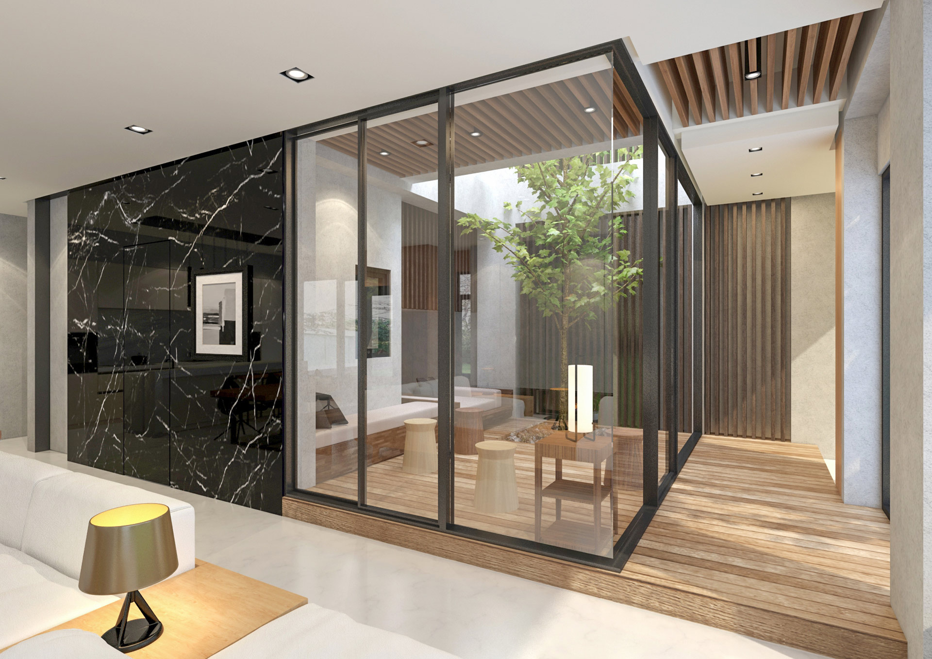 開窗與平台,是建築設計的一大亮點,透過精準的位置及尺度,讓兩者為空間建立明確的內外關係。這些窗戶、平台散佈在立面各處,包含留設於建築物中央的天井、前述的公共活動區域及屬私領域的7間獨立套房。貫穿全屋的天井規劃,讓外部自然光線得以穿透建築量體,順利引導入地下層,天井內未來也將種植大型喬木,以確保圍繞的落地窗也能擁有自然綠意。7間獨立套房的配置回應會所空間的基本使用需求,它們皆擁有景觀優美的對外陽台與開窗,這些陽台和開窗的區位、尺度皆針對外部視角特地挑選,既避開臨宅,也著重對應國家公園內的自然地景,藉由空間設計手法確保使用者的隱私,並能將周圍美景援引入室。