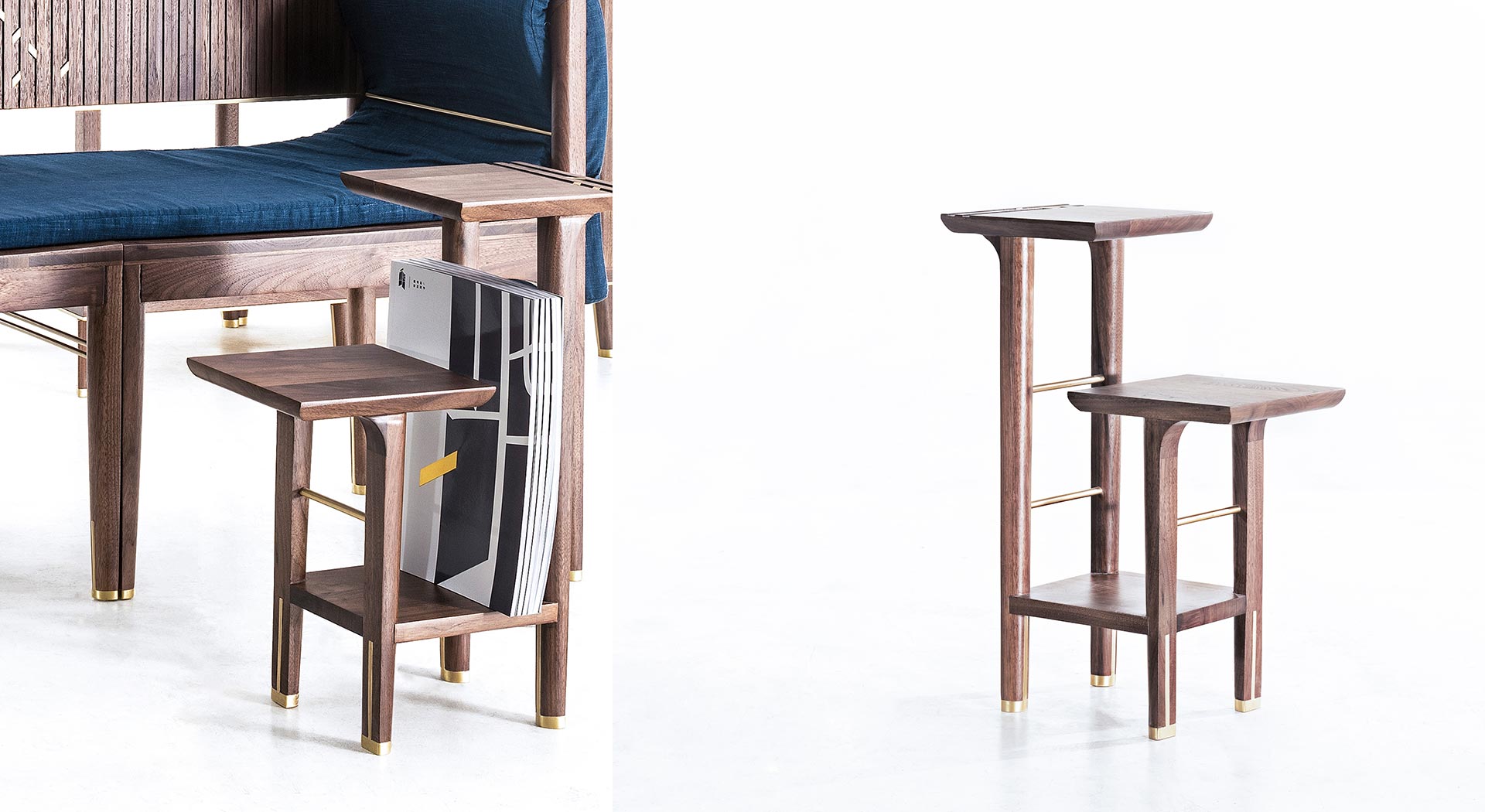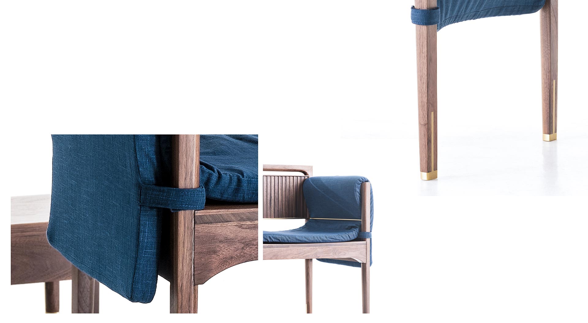 square and sleek, hard and soft, high and low. It looks like two opposite shapes and materials, and is skillfully combined in a contrasting manner through design. With warm wood materials as the main body, it is inlaid with golden copper strips and willows to create an elegant and exquisite texture. At the right angle of ninety degrees, they are joined together, and the seemingly angular single chair is closed in the shape of the outer circle at the inner edge of the seam and the armrest. The similar method is also applied to the coffee table and the hanger. With the design of the vertical lamp, the emotional and classical design, supplemented by the contrasting image and materials, let the texture of the details and crafts, through the contemporary operation, more specifically in the form of contrast control, respond to the spirit of the oriental aesthetics.