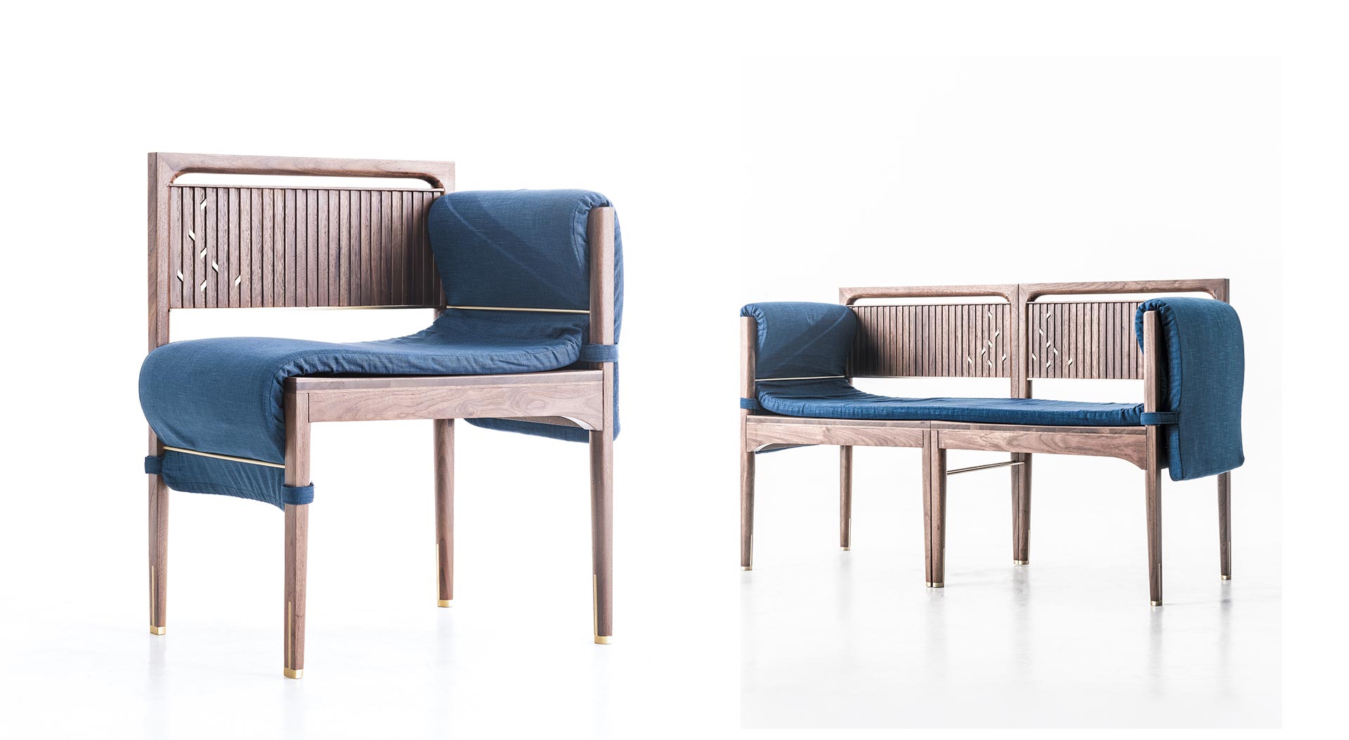 「詩意韶華」系列家具以方正與圓潤、堅硬與柔軟、高矮並陳的理念出發,看似兩相對立的外型與材料,透過設計手法巧妙地以對比形式融合在一起。以溫潤木質材料為主體,鑲嵌、崁入金色銅條與柳葉造型裝飾,創造出雅緻出眾的細膩質感。以九十度直角彼此接合,看似稜角分明的單椅,卻在接縫與扶手內緣以圓弧造型收束,形構出外方內圓的效果,類似的手法也同樣運用於茶几、衣架與立燈的設計上,感性而古典的設計,輔以對比性的形象及材料,讓細節與工藝的質地,藉由當代操作,更具體地以形式的對照調和,回應東方美學的洗鍊精神。