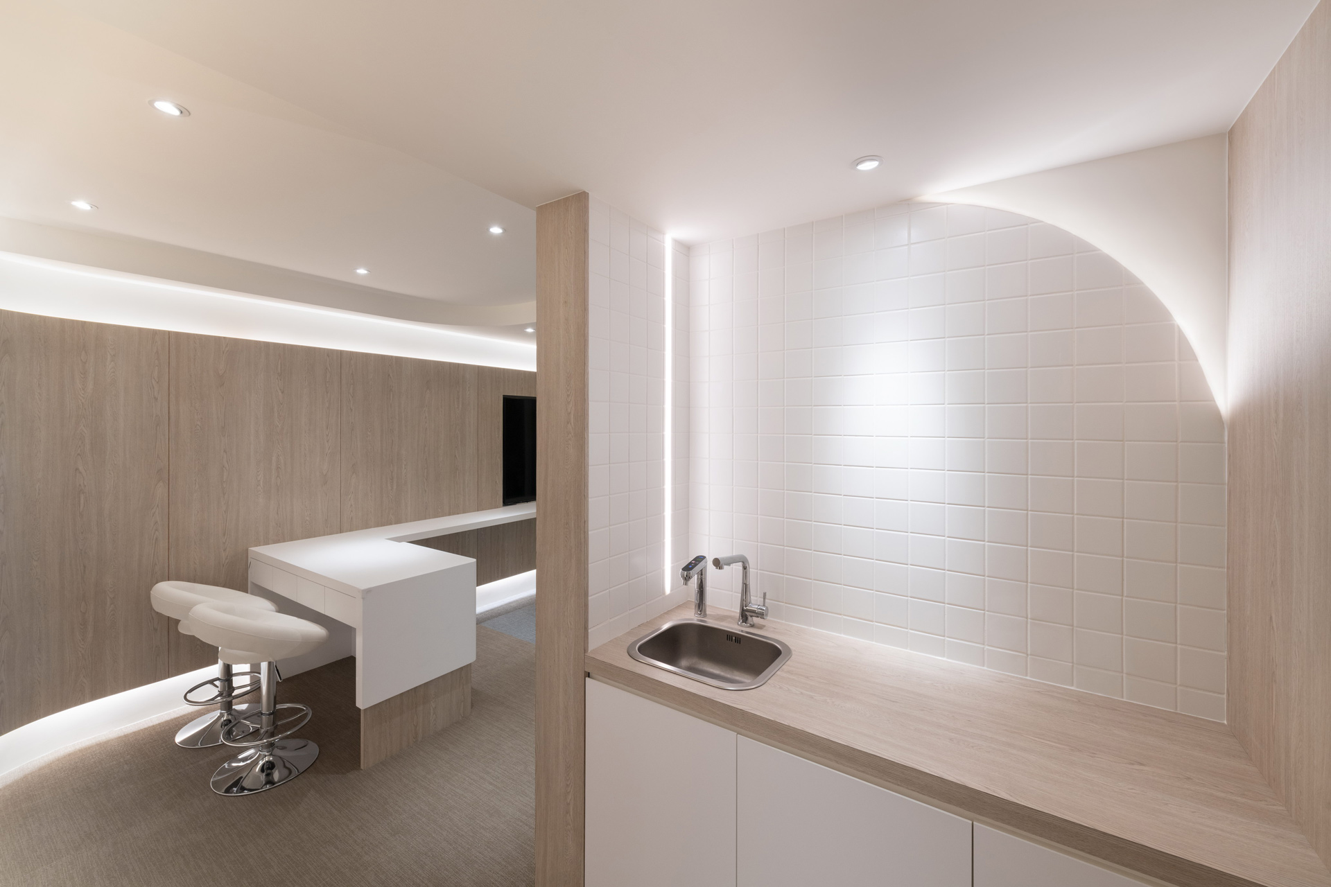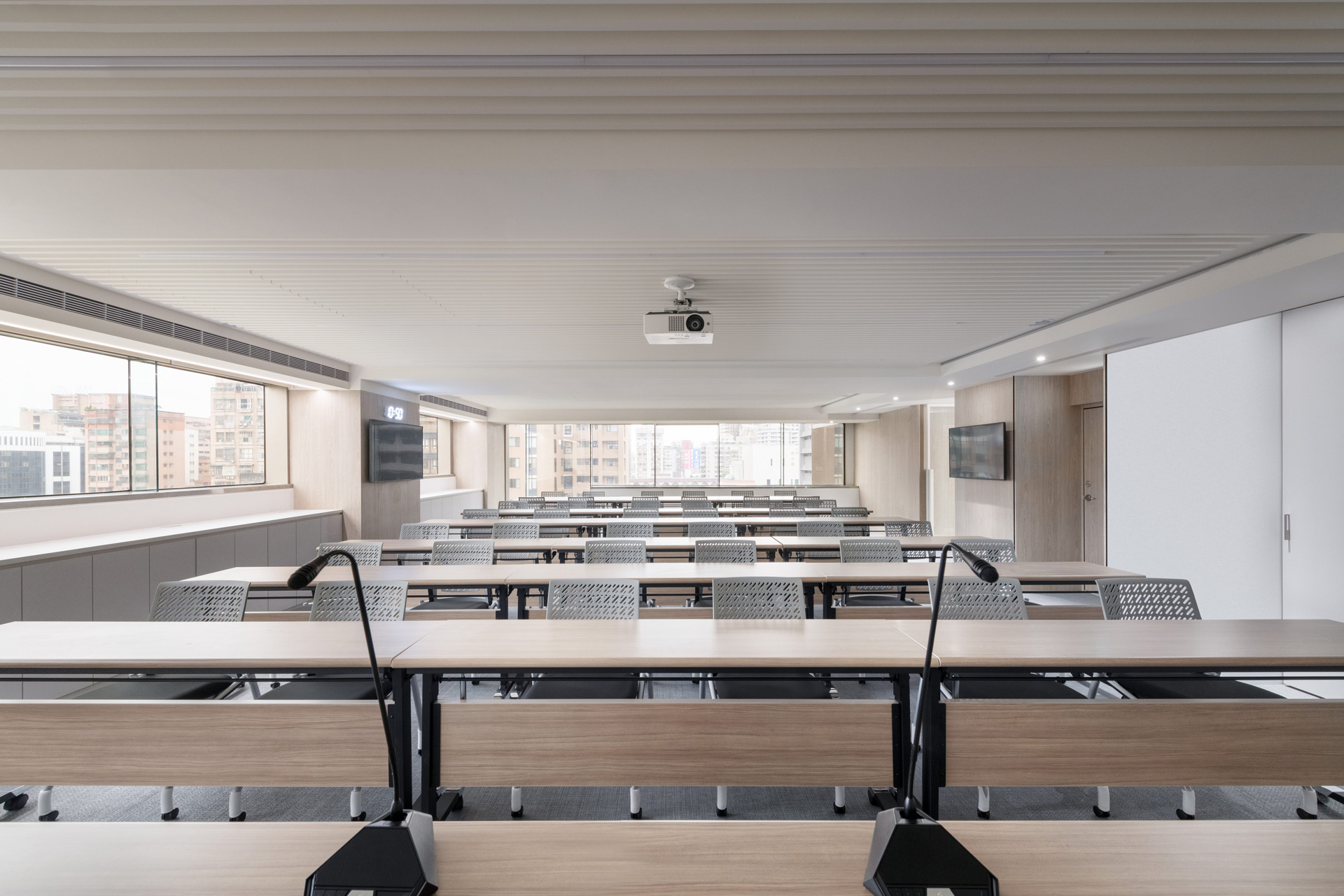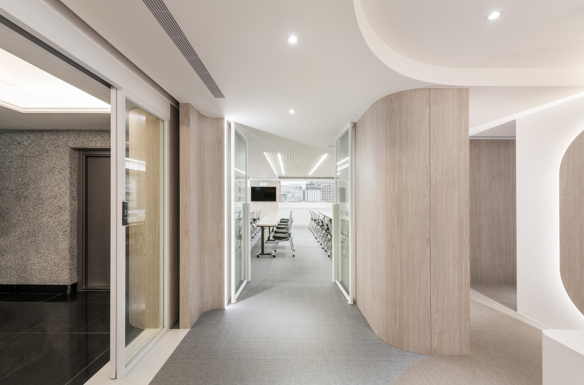 推開會議室大門踏入接待區,從前台簽到處、後方立面及天花切角,舉目皆可見大量圓弧狀設計,以圓融、溫潤的玄關意象迎接群眾,突破辦公空間既有的生硬感,轉而以流動的形式加深場所語彙,進而與組織的溫暖、照護精神產生連結。秉持促進對話的使命,護理師聯合會即使位處地狹人稠的地段,依然提供大範圍的企業交流場所。此外,考量未來促進產業合作和資源最佳化利用,會議空間也提供對外租借,賦予場域在專業辦公之餘,也能有社群交流、商業營利等多重意涵。