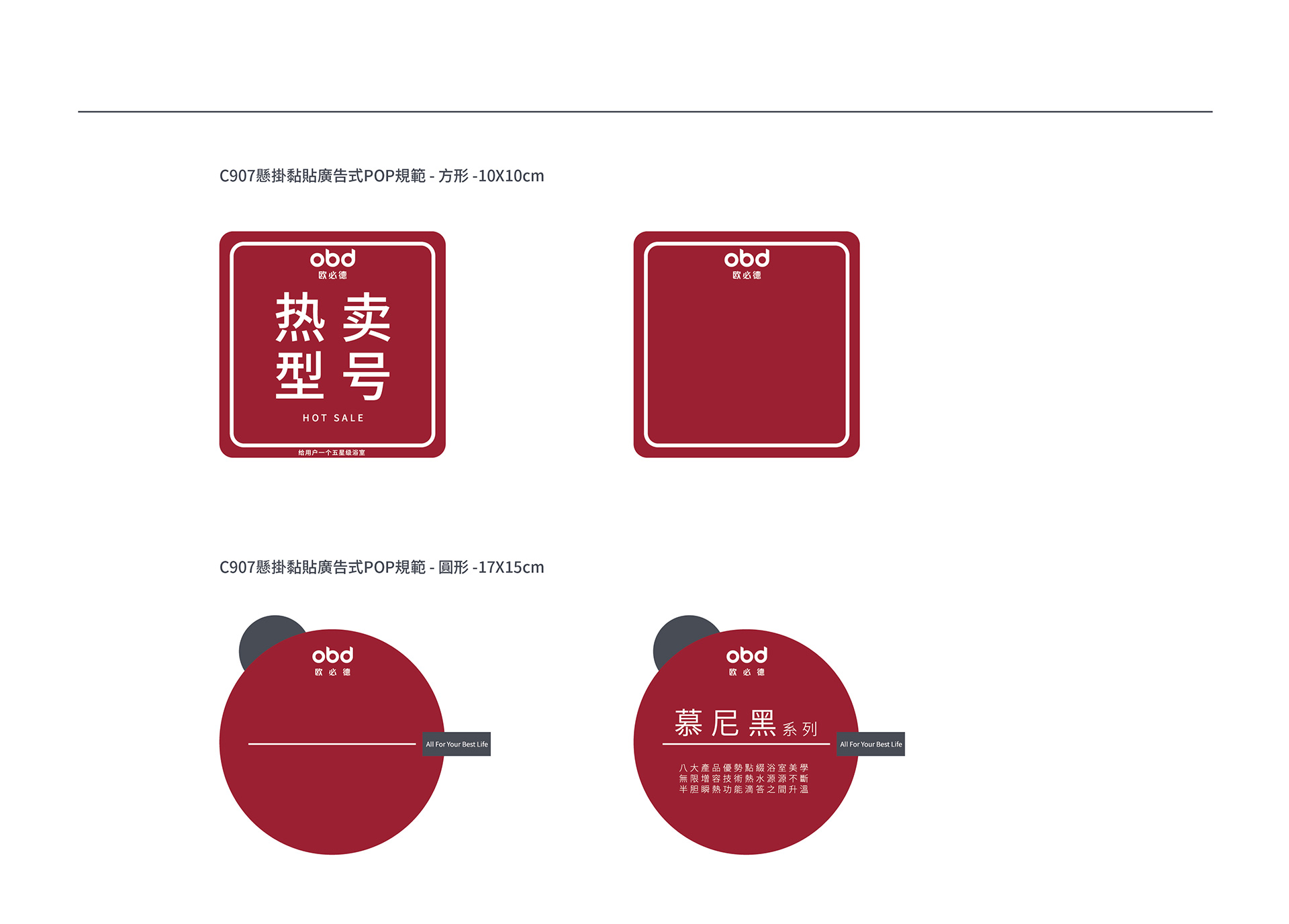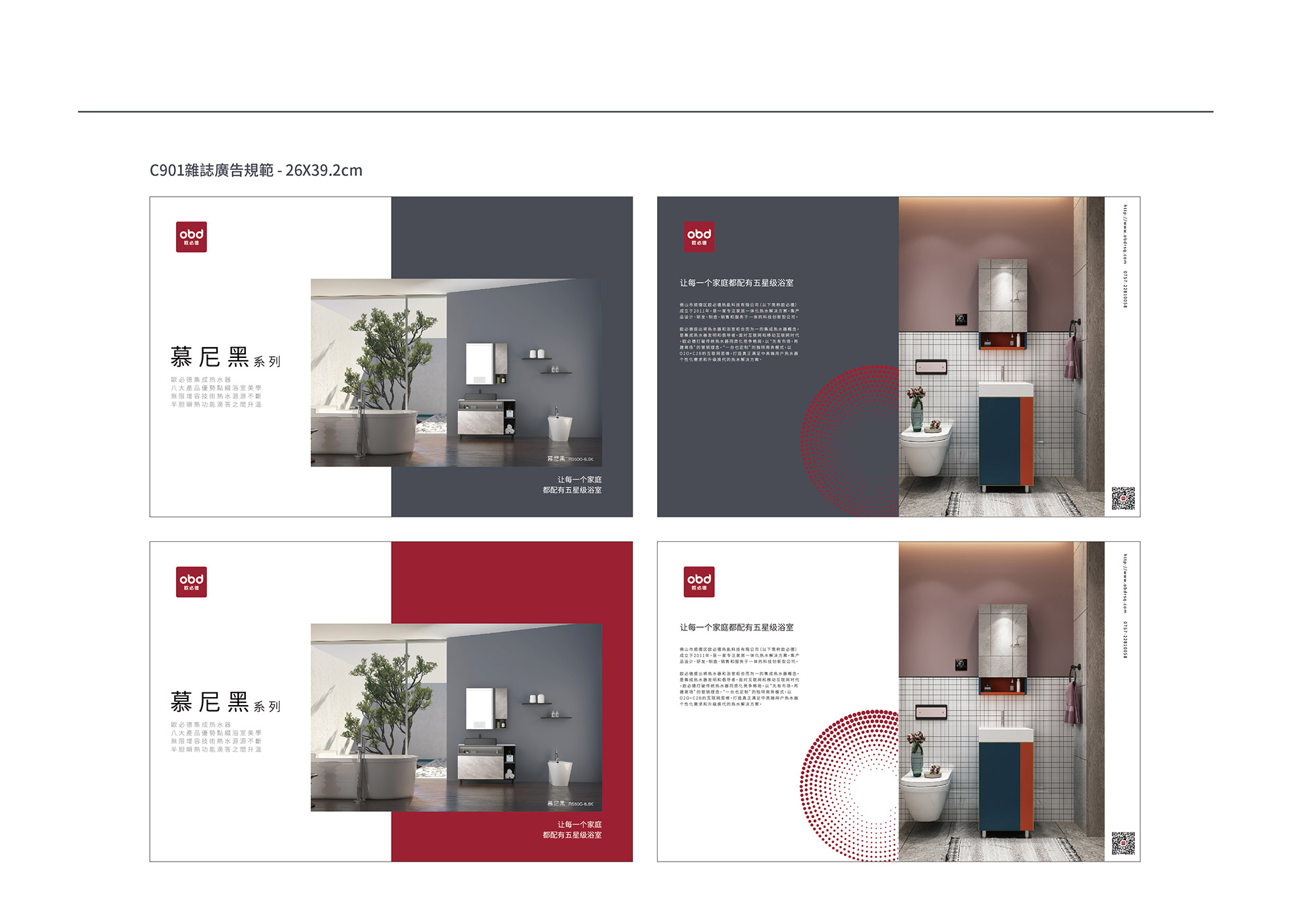 質感酒紅與高級灰,恰巧具備兩種截然不同的色彩意象,前者象徵了溫潤、熱情的居家環境,一種親友相聚,團團圍坐的閒適與溫馨,後者則代表一種冷調、洗鍊的高科技氛圍。主色與輔色透過8:2的完美比例搭配,讓熱情的質感酒紅與低調的高級灰,結合OBD LOGO三個圓環的圍塑造型,凝結為品牌強調以科技結合設計,創造高質感居家生活的企業形象。