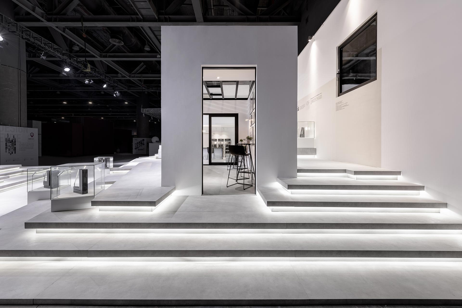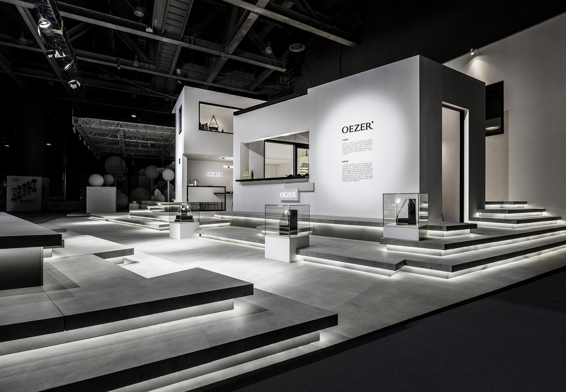 矩形平面的展區採開放式設計,透過大量階梯、平台營造高低錯落的山水城市地景,多元而豐富的場景層次,一方面回應了2018年OEZER門窗受邀至義大利威尼斯參與設計元年的展示,特別將當地特有的人文地景與空間涵構,轉譯在本次會展空間的布局上,另一方面也透過此種上下起伏,如同博物館由逛般的路徑,創造豐富的空間感知,藉由開放式場域讓人流自然進入,模糊公共空間與動線之間的明確分際。展區內除了既有的產品陳列外,也包含空間模型和未來實驗性空間的展示,包含咖啡廳與玻璃陽光房隱身在參觀動線中,讓參訪者在遊逛之時有更多元的體驗,同時也呼應自由空間最原初的精神。
