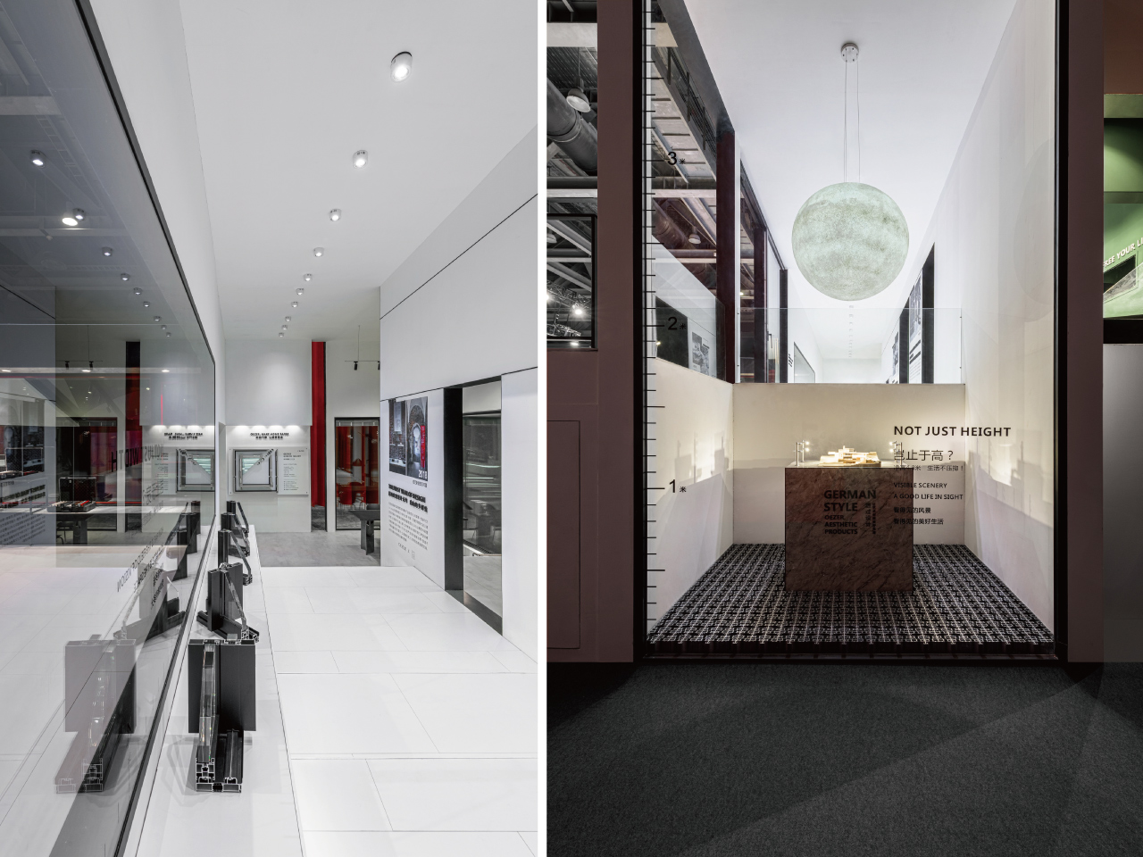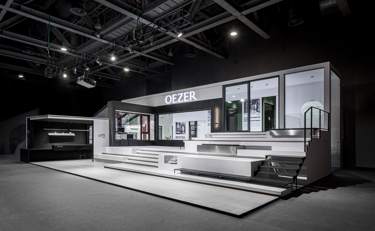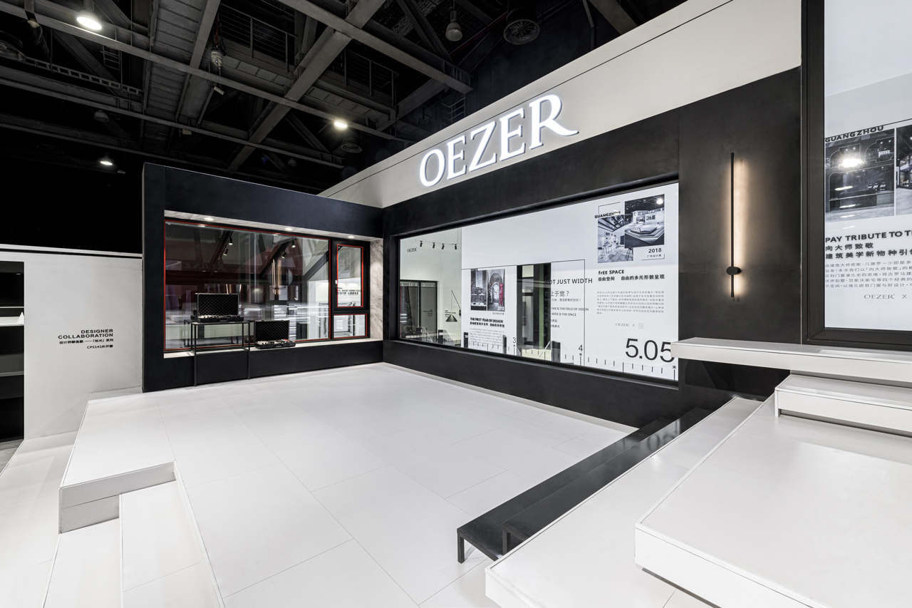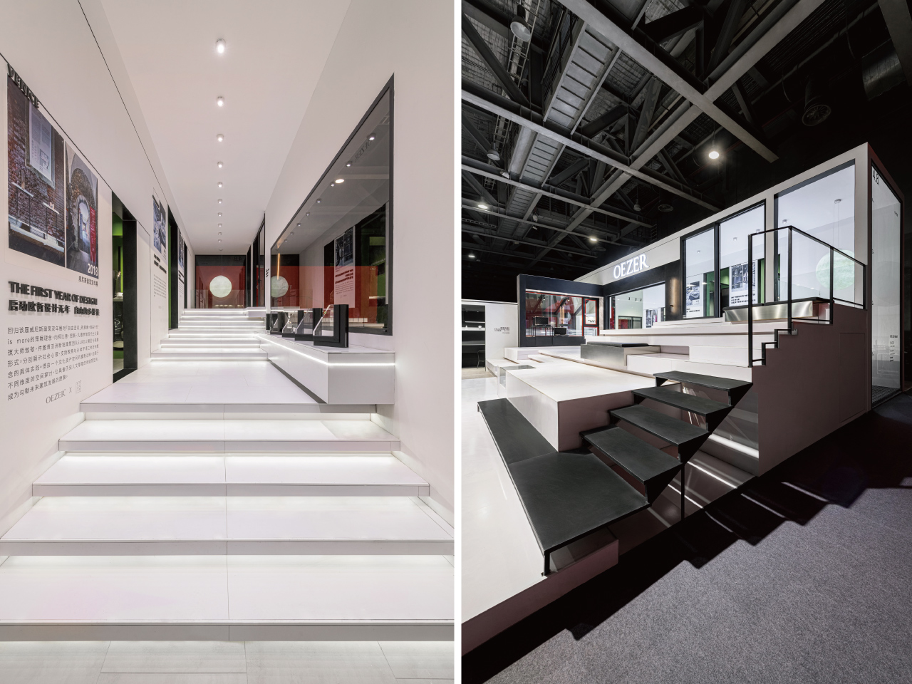 本次設計特別以「回顧展」的概念形式融合於展示中,以回顧過去兩年間品牌所參與的各項展會活動,強化策展與交流的特質。在2018年威尼斯建築雙年展,歐哲以free is more為概念,藉由模型展示未來空間形態的實踐,勾勒出建築發展的願景。同年在廣州設計周,我們透過大量階梯、平台營造高低錯落,多元的場景層次,藉由上下起伏的博物館遊逛路徑,創造豐富空間感知並模糊公共空間與動線之間的分際。2019年廣州建博會,我們以門窗發展史的軸線發想,透過柯比意、密斯.凡德羅等建築大師的經典設計元素,結合既有展場機能及活動融入斜向切割後的空間,藉此向大師致敬。從2018年的威尼斯到2019年的廣州,由門窗的自由到互動連結的解放,形構出多樣的空間變化,自由、多樣而流動的場域營造已成為歐哲展場的一貫特色。本次空間設計在融入這些精神之外,也特別透過在主動線坡道間以大紀事策展牆的表現手法,鉅細靡遺地記錄下來。